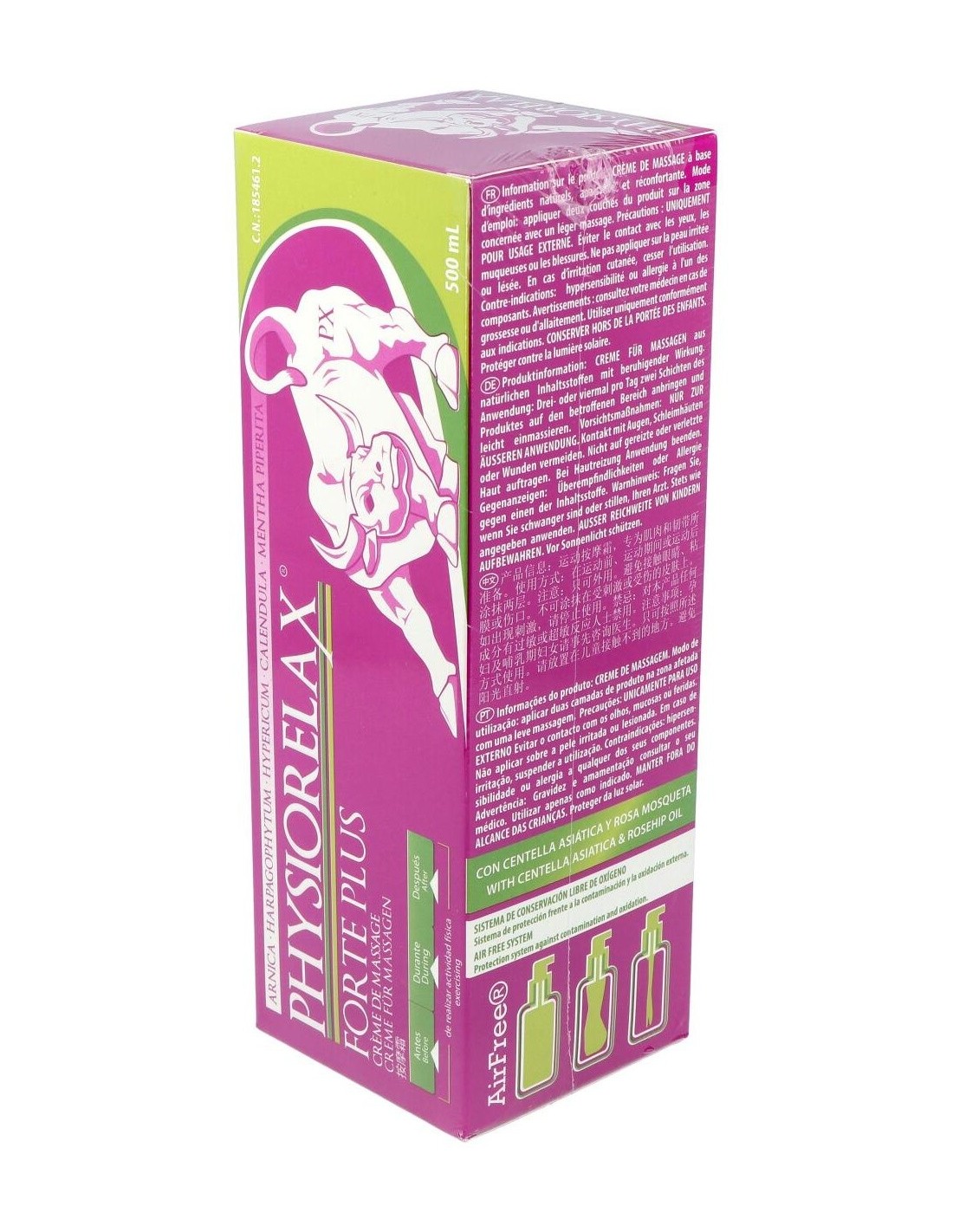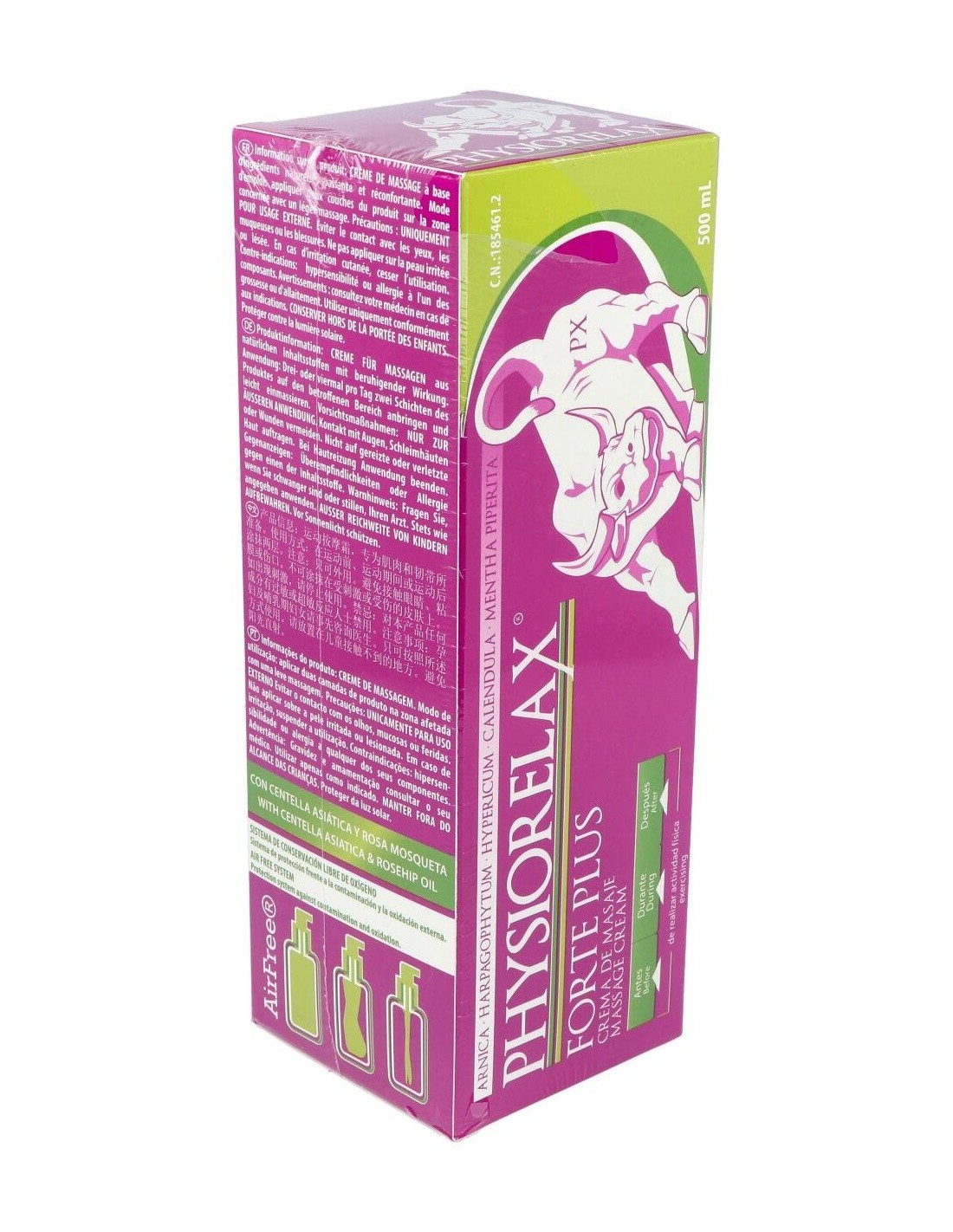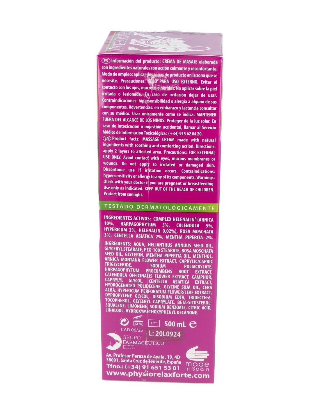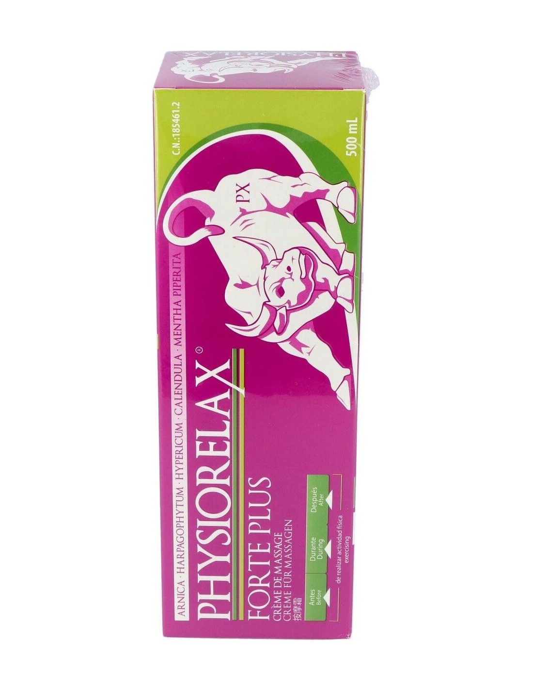Physiorelax Forte Plus es una crema de masaje con una completa fórmula que prepara, protege y recupera tus músculos y ligamentos. Es altamente efectiva tanto en la práctica deportiva como contra la fatiga que genera la actividad cotidiana.Physiorelax Forte Plus ha sido elaborada con un complejo de aceites esenciales, el Helenalin, que contiene árnica, harpagofito, hipérico, caléndula y helenalina, el compuesto principal del Árnica Montana. Todos son ingredientes con propiedades antiinflamatorias, calmantes y cicatrizantes científicamente demostradas.A diferencia de otras cremas, Physiorelax Forte Plus no solo actúa en tus músculos y ligamentos. Gracias a su contenido en rosa mosqueta y centella asiática, también cuida tu piel, regenerándola y nutriéndola en profundidad.Ingredientes activos:Árnica (Arnica Montana), Harpagofito (Harpagophytum Procumbens), Hipérico (Hypericum Perforatum), Caléndula (Calendula Officinalis), Rosa Mosqueta, Menta (Mentha Piperita), Agua Termal.Modo de empleo:Aplicar dos capas de producto en la zona antes, durante y después del ejercicio físico.Presentación:Envase de 500 ml.
