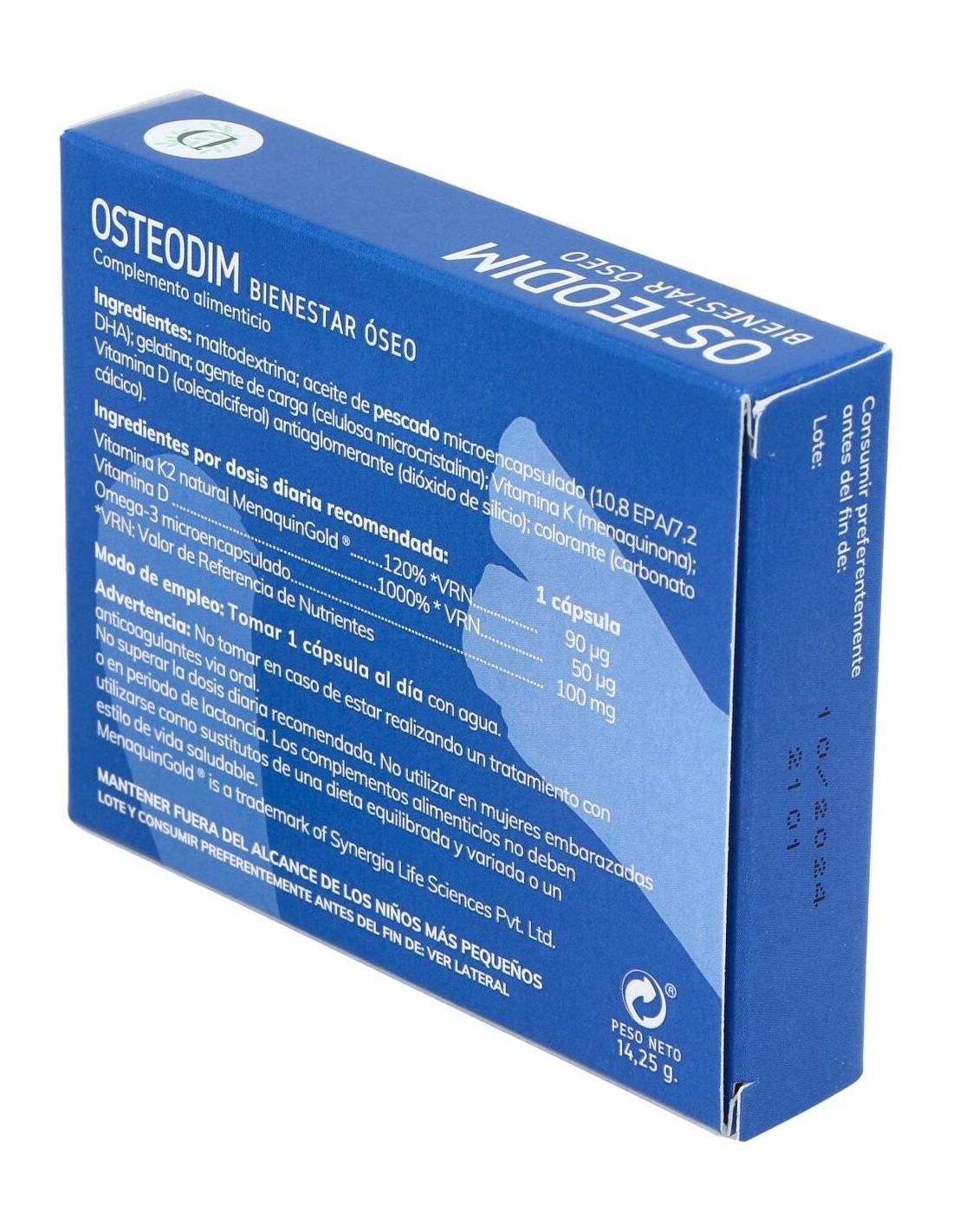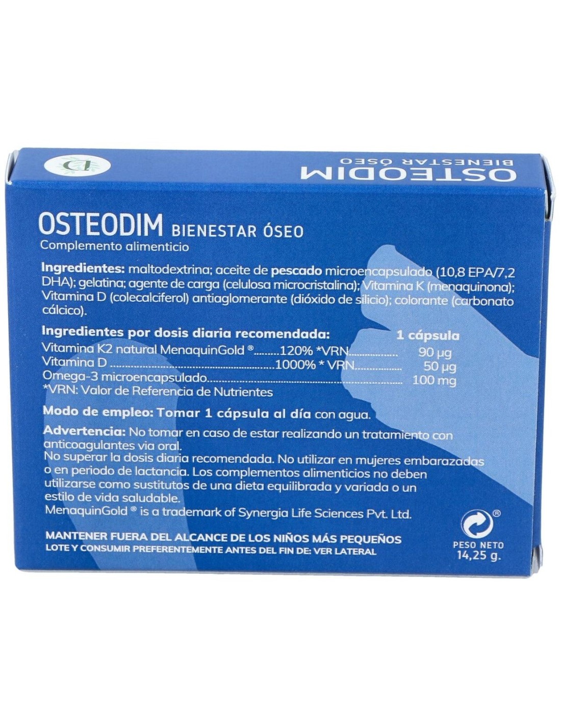 Maltodextrina, aceite de pescado microencapsulado (10,8 EPA/ 7,2 DHA), agente de recubrimiento (gelatina), agente de carga (celulosa microcristalina), vitamina K (menaquinona), Vitamina D (colecalciferol), antiaglomerante (dióxido de silicio), colorante (carbonato cálcico).