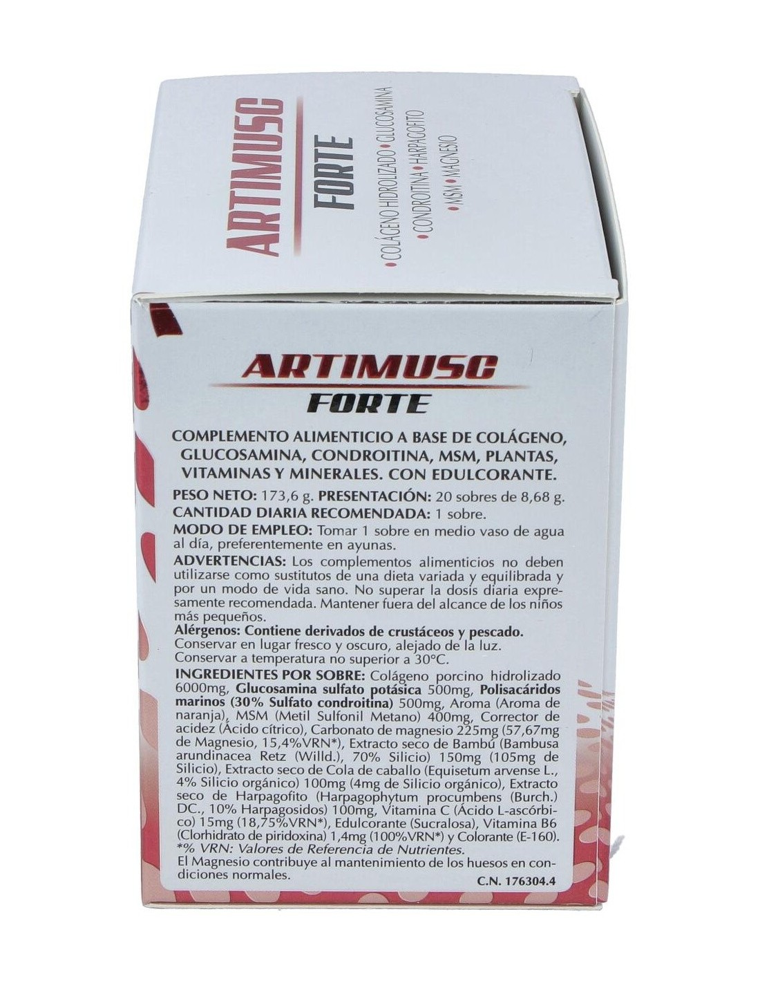 Colágeno hidrolizado 6 g. Glucosamina sulfato 500 mg. Polisacáridos marinos (30% condoitin sulfato) 500 mg. MSM (Metil sulfonil metano) 400 mg. Carbonato de magnesio 200 mg. Bambú extracto seco 150 mg. Cola de caballo (Equisetum arvense) tallos extracto seco 100 mg. Harpagofito (Harpagophytum procumbens) extracto seco 100 mg. Vitamina C 15 mg. Sucralosa 15 mg. Betacaroteno 0,5 mg. Ácido cítrico 258 mg.
