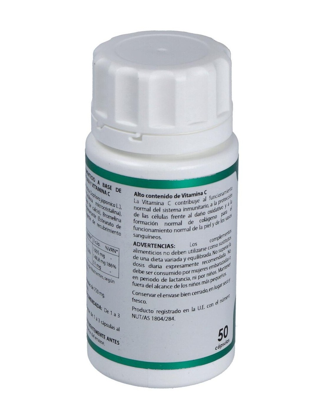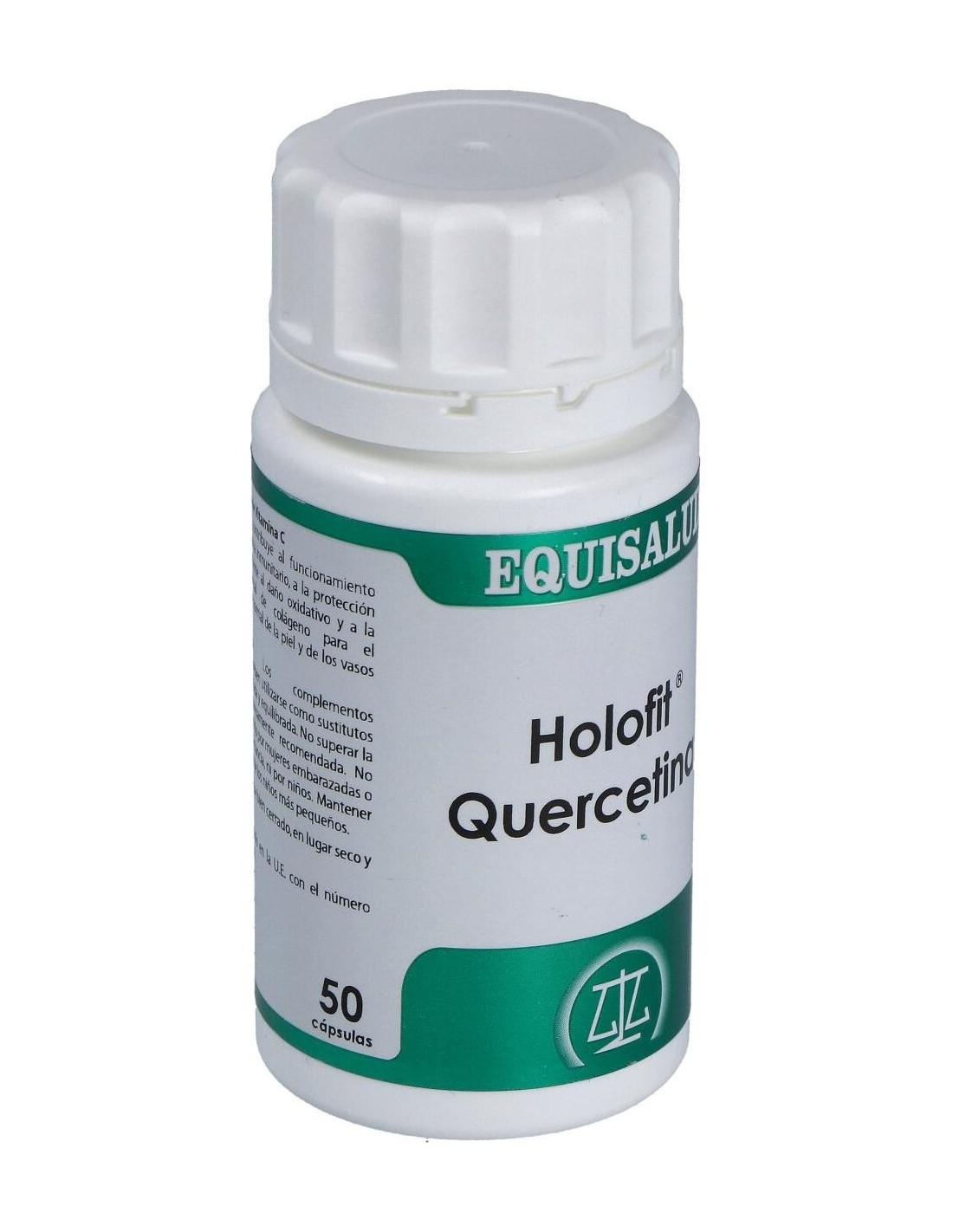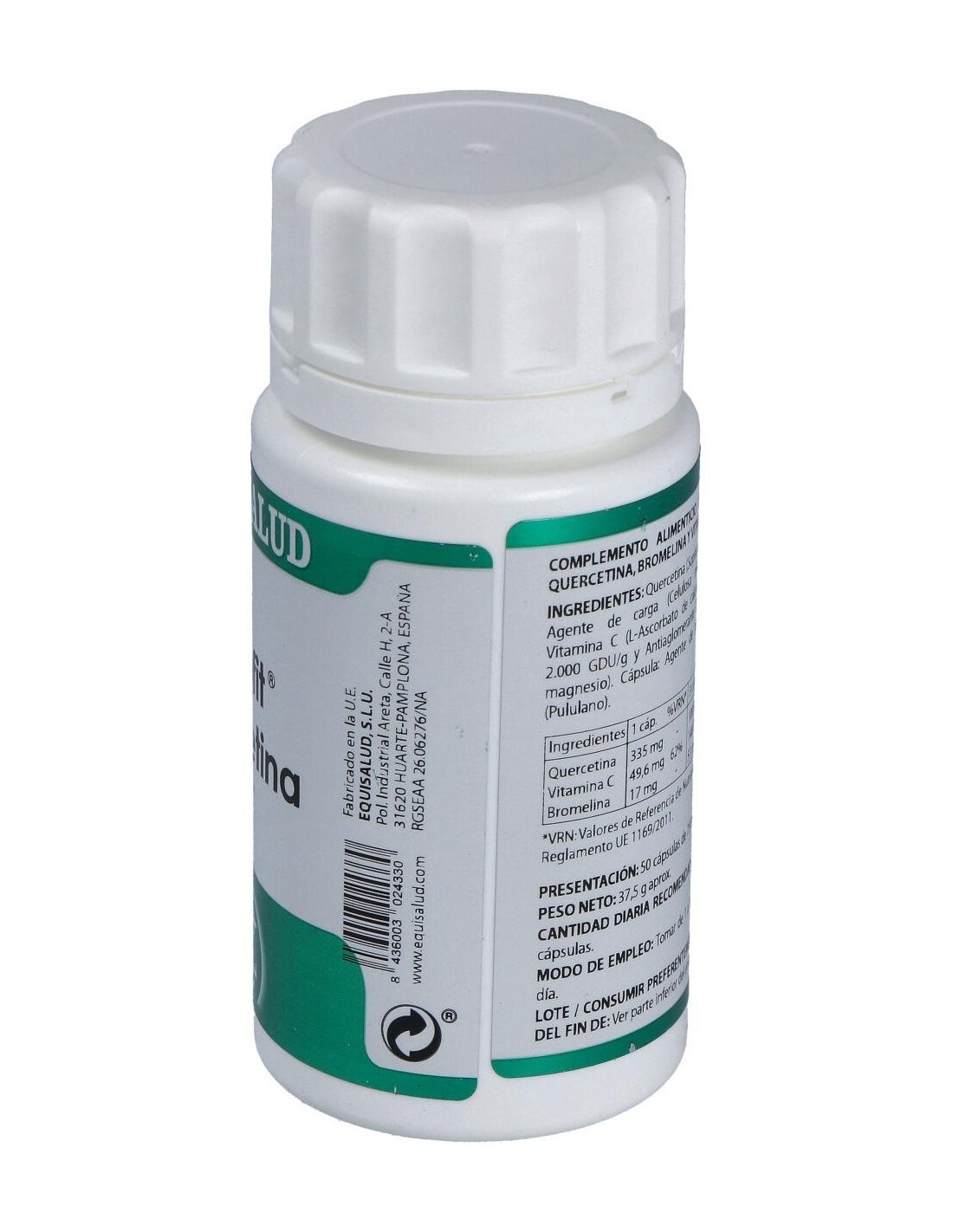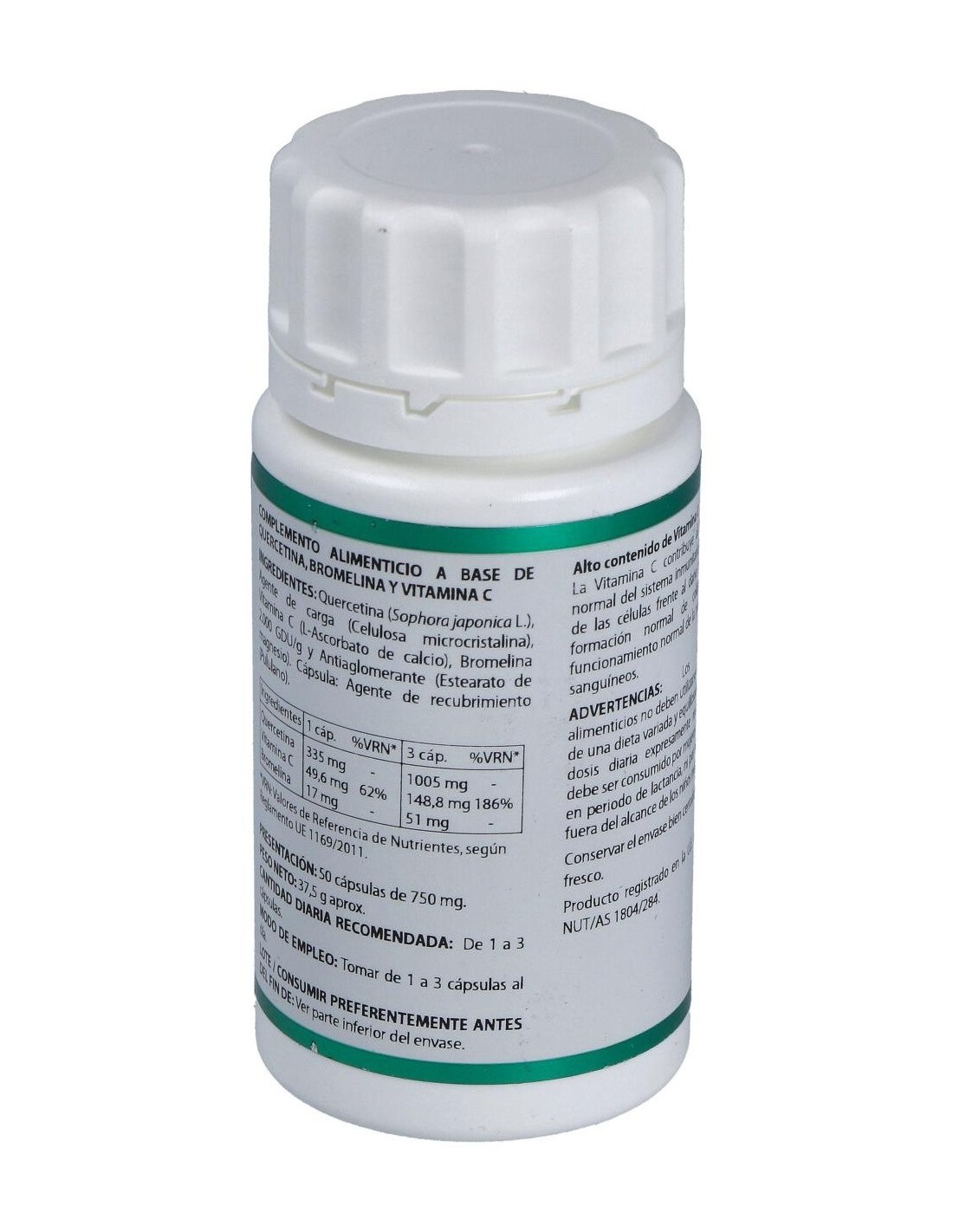 Principales propiedades de la Quercetina: Ayuda a la formación de colágeno y vasos sanguíneos. Es antioxidante y antiinflamatorio. Mejora los síntomas en las afecciones respiratorias, catarros, asma, alergias oculares, rinitis. Es además antibacteriana, antiasmática, antiespasmódica, antidiabética, antigripal, antiviral, hepatoprotectora. En eczemas y urticarias de tipo alérgico. Protector cardíaco. Hay evidencias de su uso con buenos resultados en prostatitis y cistitis, así como en herpes simple y virus de la gripe. Composición por cápsula: 335 mg de quercetina (3, 3, 4, 5, 7-pentahidroxiflavona, flor de Sophora japonica L., > 95%). 60 mg de ascorbato de calcio (82,64% Vitamina C). 17 mg de bromelina o bromelaína (tallo de Ananas comosus (L.) Merr., actividad proteolítica: 2.000 GDU). Modo de empleo:Tomar de 1 a 3 cápsulas al día.Presentación:Bote de 50 cápsulas.