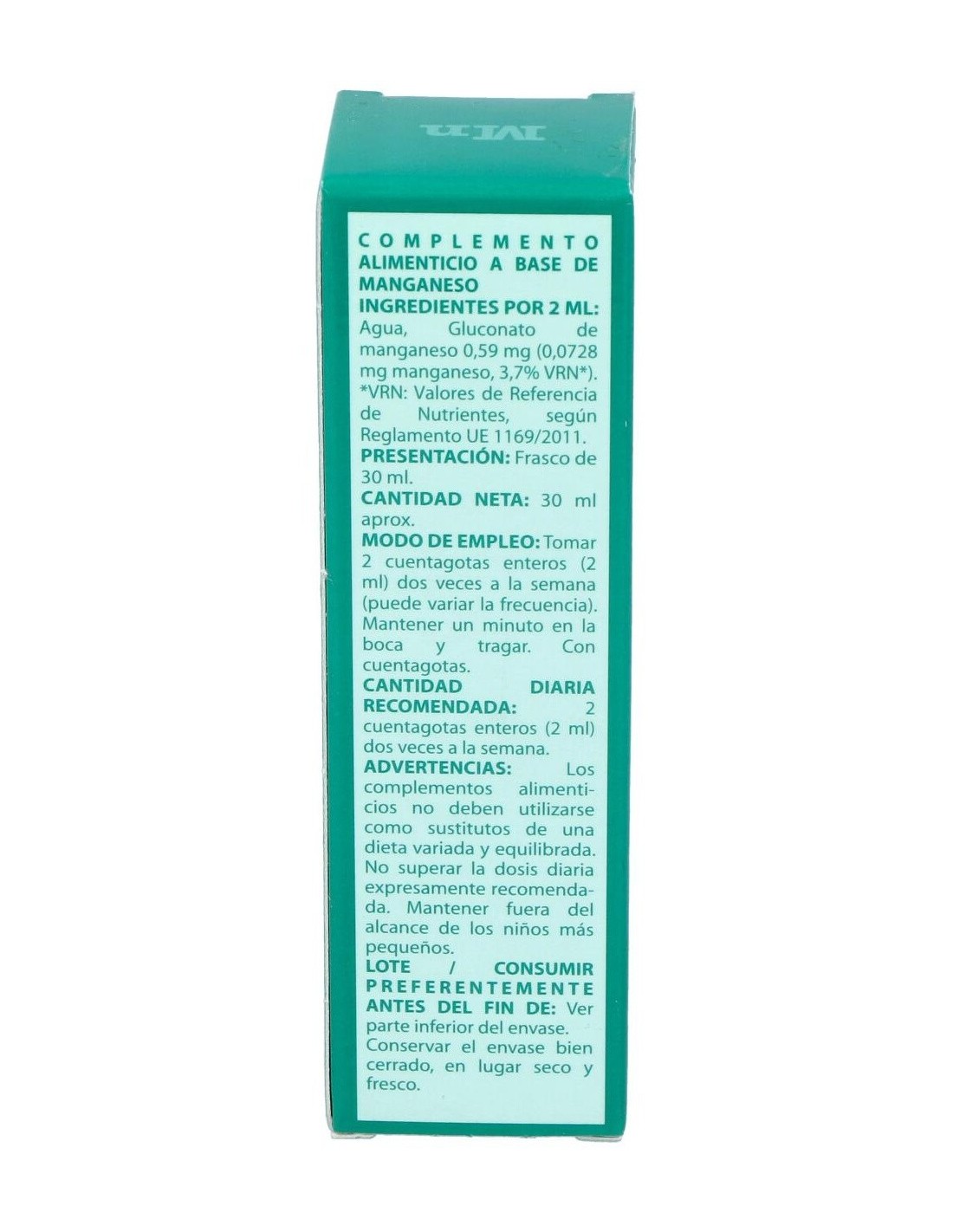 Este producto es un complemento de oligoterapia necesario para el crecimiento de los recién nacidos, relacionado con la formación de los huesos, el desarrollo de los tejidos y la cogulación de la sangre. También es un elemento importante en las funciones de la insulina, la síntesis del colesterol y como activador de varias enzimas. Ingredientes: 8,85 mg de gluconato de manganeso (Mn2+ 36,40 ppm). Agua destilada. Modo de empleo:Tomar 2 cuentagotas enteros dos veces a la semana. Mantener un minuto en la boca y tragar. Presentación:Bote de 30 ml.