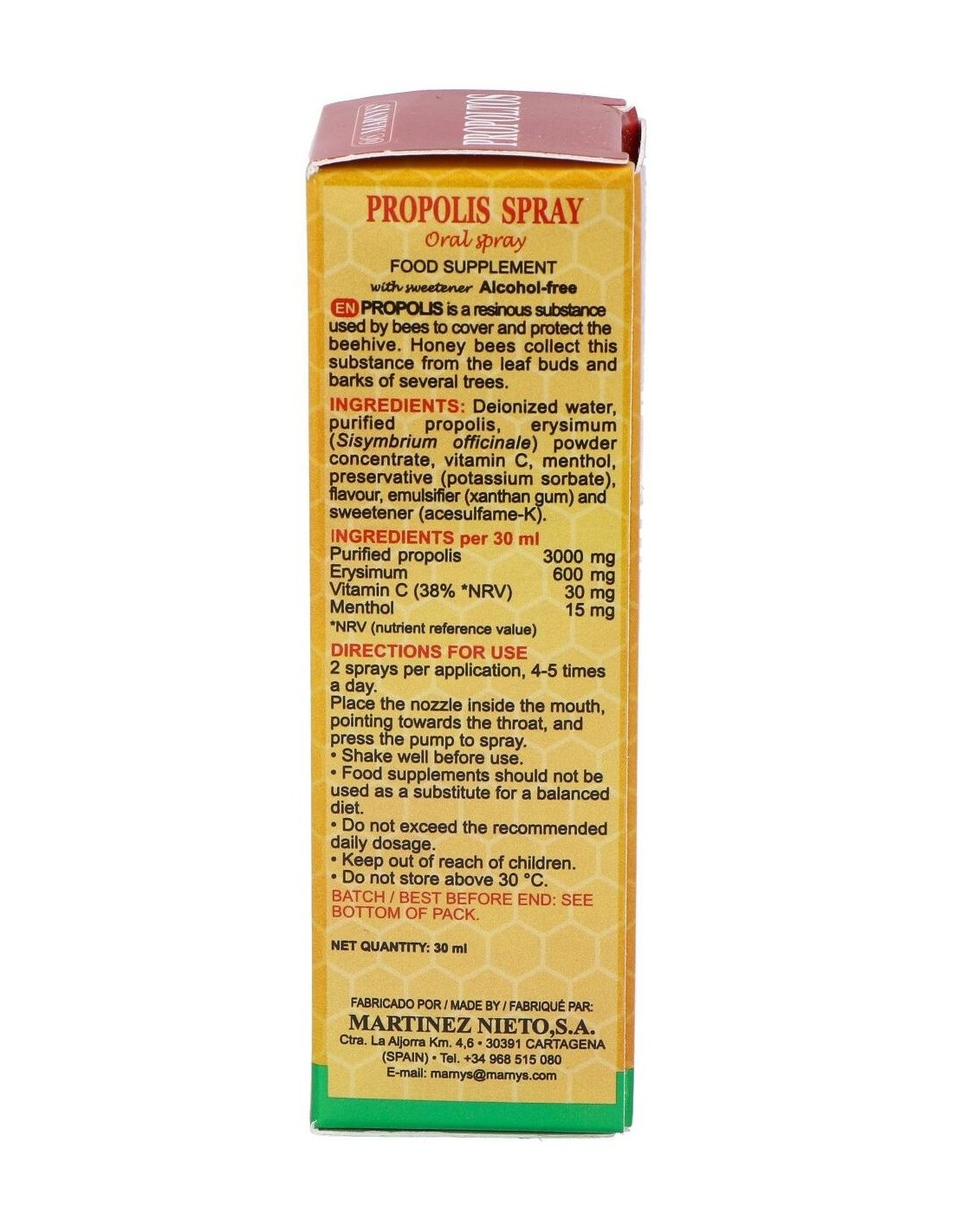 Este spray está elaborado con extractos seleccionados de propóleos, manteniendo su composición natural para preservar sus propiedades. Su diseño compacto permite llevarlo consigo y utilizarlo en diferentes momentos del día, adaptándose a estilos de vida activos.