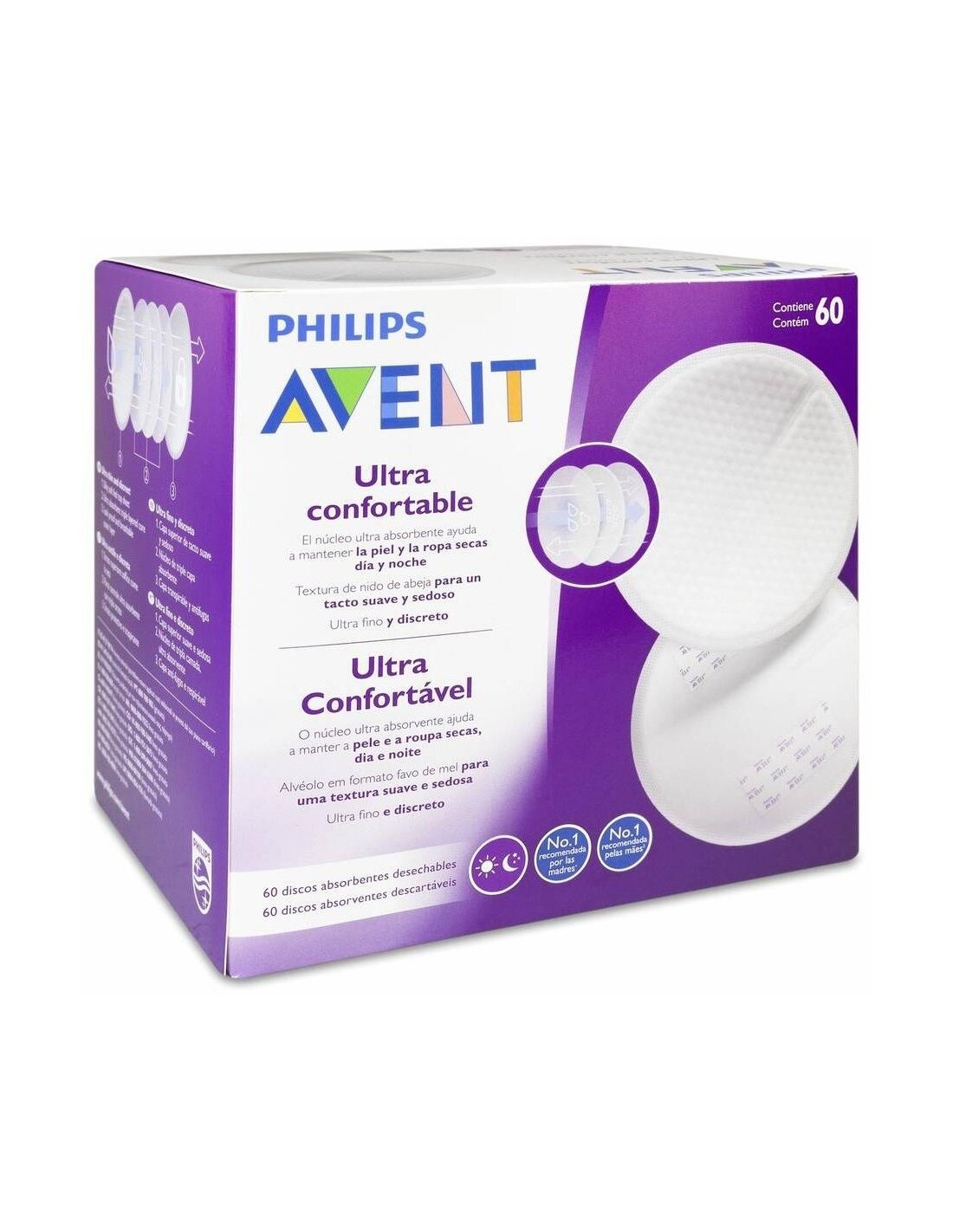 Ayudan en la lactancia materna. La capa superior con textura de nido de abeja es suave y cómoda sobre la piel. Núcleo ultra-absorbente que ayuda a atrapar la humedad y a mantener la piel seca día y noche. Envueltos individualmente para una higiene extra, perfectos para llevar a cualquier parte. Con 2 bandas adhesivas para mantener los discos en su posición.