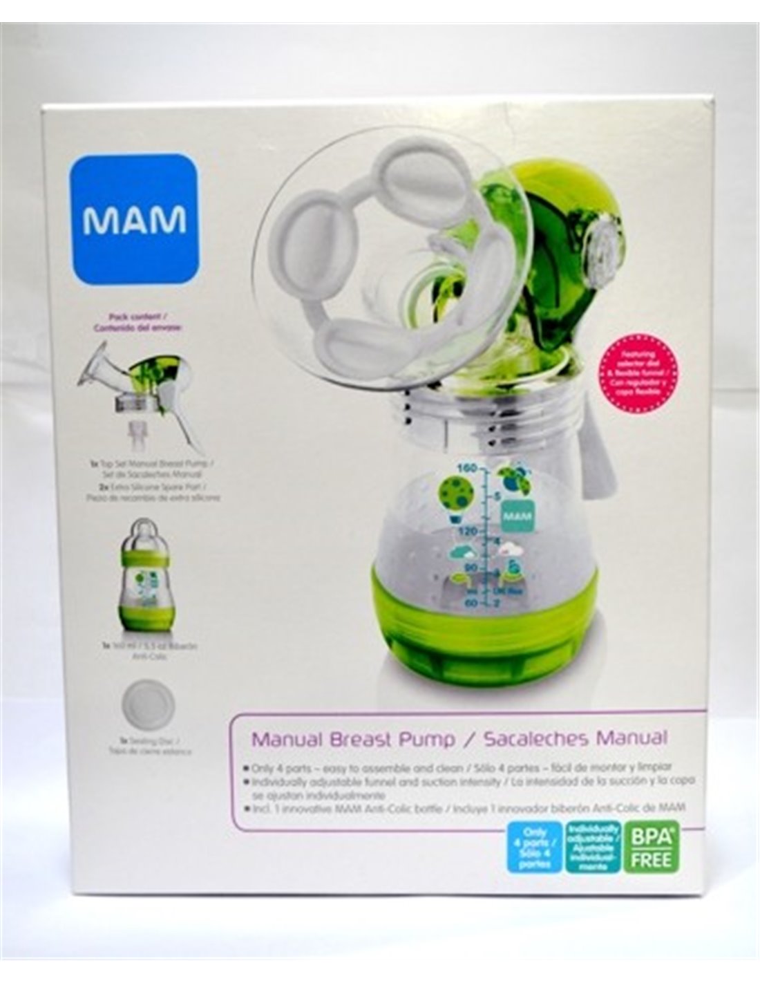 Para una extracción de leche rápida y cómoda. Manejo y limpieza sencillos. Ideal para utilizar en casa, en el trabajo y sobre la marcha. Forma ergonómica y extracción silenciosa. 1 biberón Easy Start con disco hermético (1 x 160 ml /5,5 oz). El biberón cumple con la Norma Europea EN 14350:2020. La tetina del biberón se adapta a todos los biberones MAM y al vaso Trainer+.