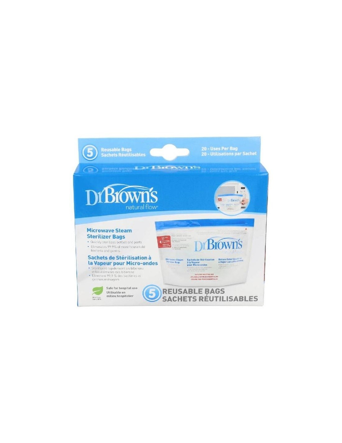 DR. BROWN´SBolsas para esterilizar en el microondas de forma rápida, fácil y segura los componentes de los biberones (biberones, tetinas y piezas de ventilación interna). También esteriliza chupetes y otros accesorios pequeños. Eliminan el 99,9 % de la mayoría de bacterias y gérmenes domésticos. Ideal para la esterilización fuera de casa o cuando se encuentre de viaje. Reutilizables: 20 usos por bolsa.