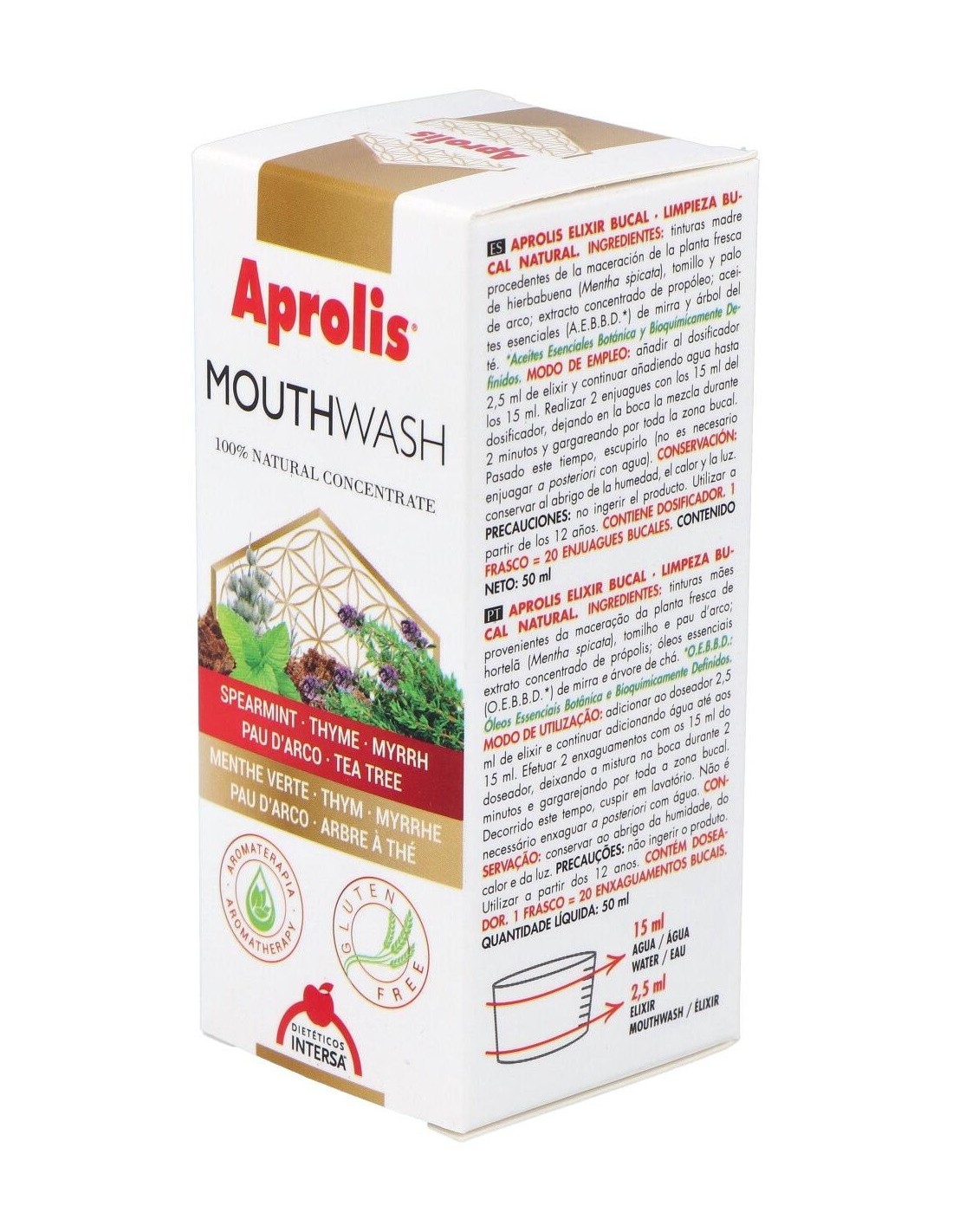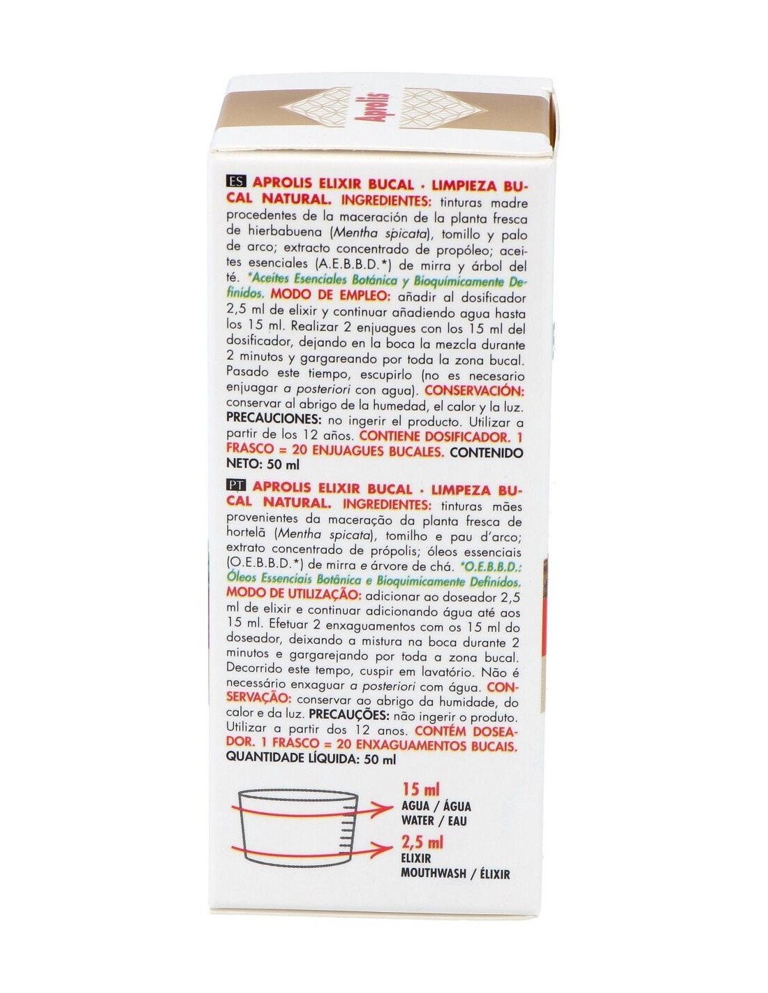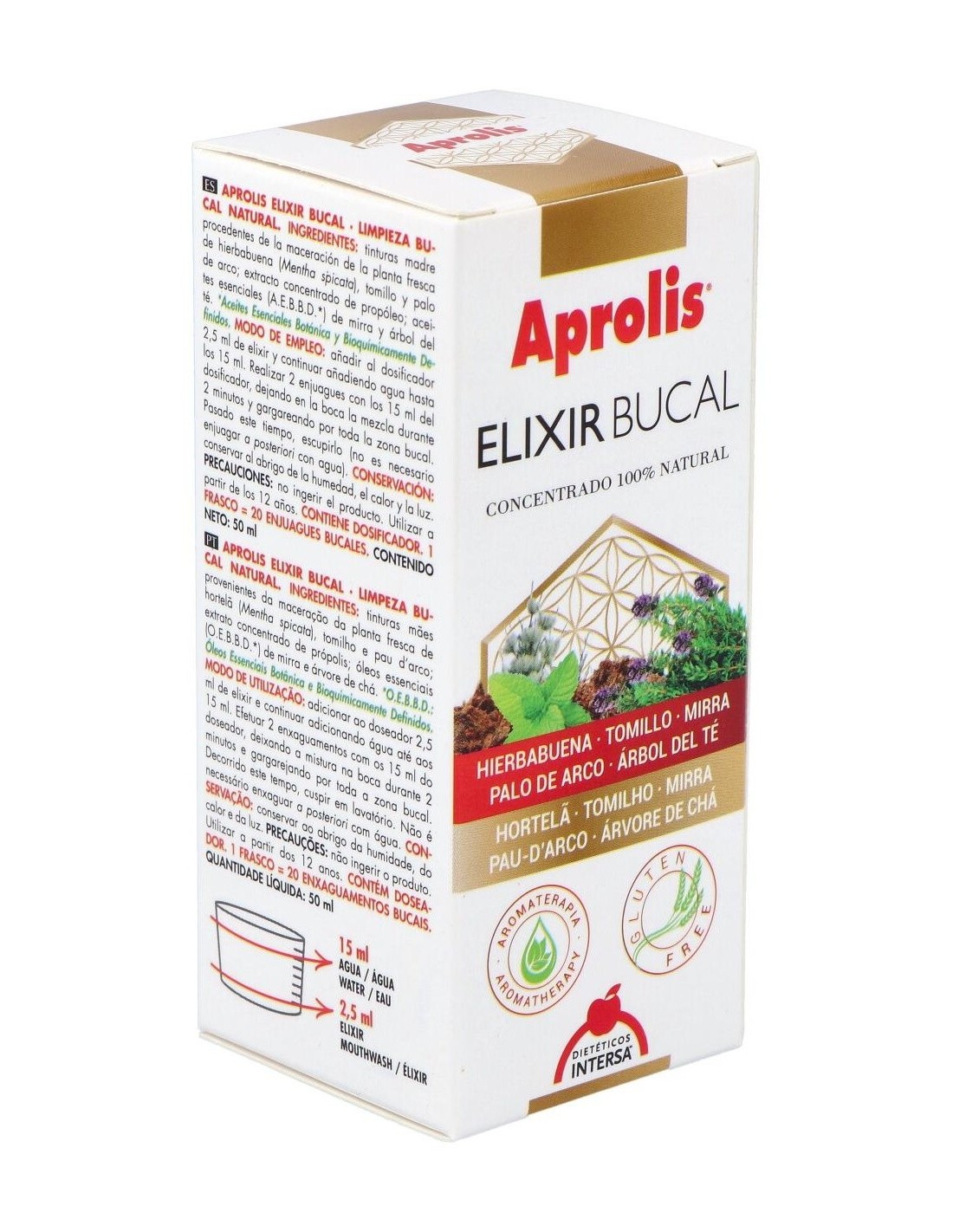 Ingredientes (INCI):Mentha Viridis (Spearmint) Extract, Thymus Vulgaris (Thyme) Extract, Lavandula Angustifolia (Lavender) Extract, Tabebuia Impetiginosa Extract, Propolis Extract, Commiphora Myrrha Oil, Melateuca Alternifolia (Tea Tree) Oil.Modo de empleo:Añadir al dosificador la cantidad de 2,5 ml de elixir, continuar añadiendo agua hasta los 15 ml. Dejar en la boca la mezcla durante 2 minutos, gargareando por toda la zona bucal. Pasado este tiempo, eliminar en lavabo. No es necesario enjuagar a posteriori con agua. Precaución: no ingerir el producto. Realizar 2 enjuagues de los 15 ml del dosificador. Presentación:Frasco de 50 ml con dosificador.Recomendación y advertencias:No contiene: Gluten ni azúcares.