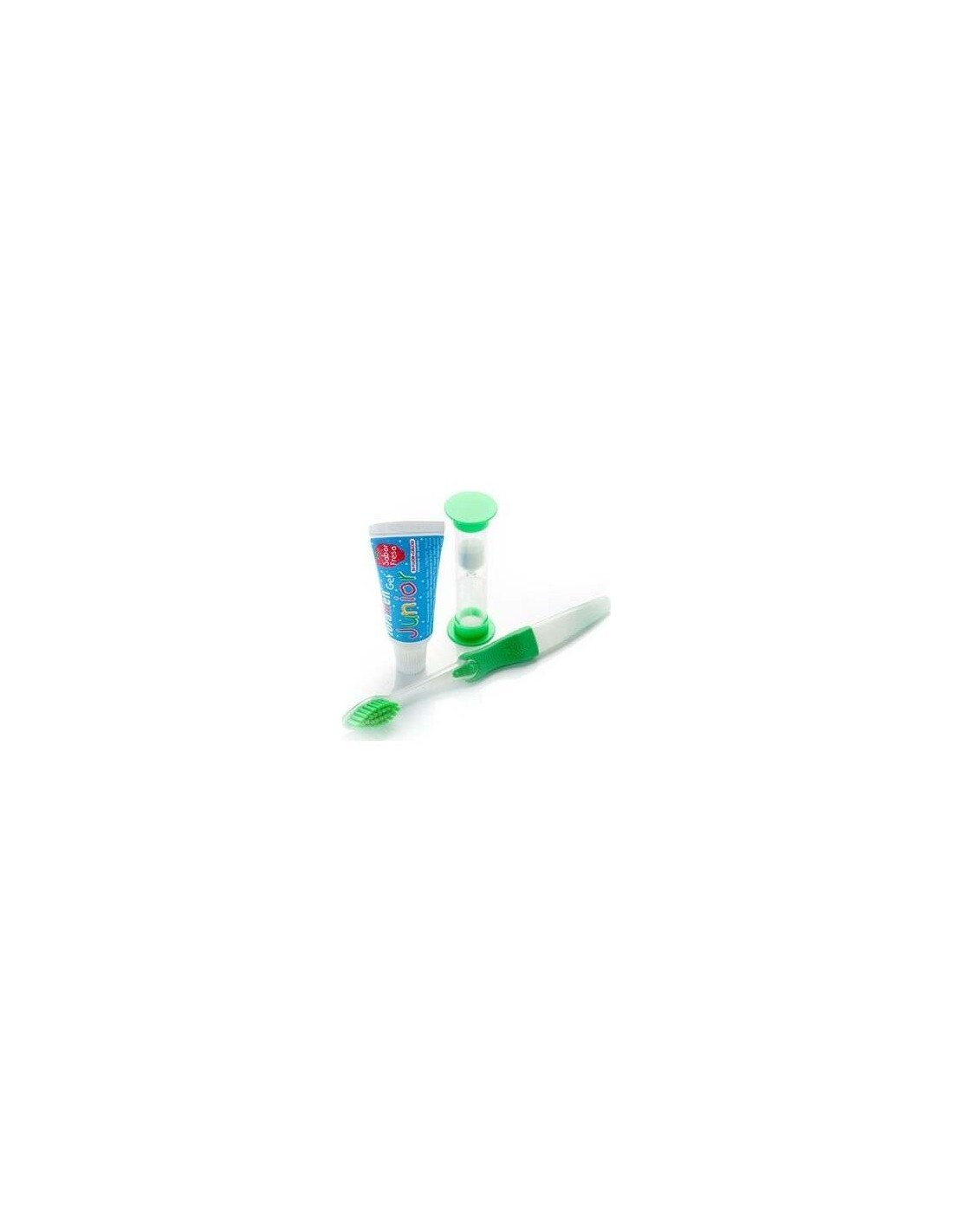 Compuesto por un cepillo de tamaño pequeño y con filamentos muy pequeños y suaves adaptados al tamaño de su dentadura (cepillo desprende una aroma a fresa que hace muy agradable el olor hacia los niños), una pasta dental junior con sabor a fresa y un reloj de arena. El kit va dentro de un práctico neceser, muy útil para viajes o para llevar al colegio dentro de la mochila.