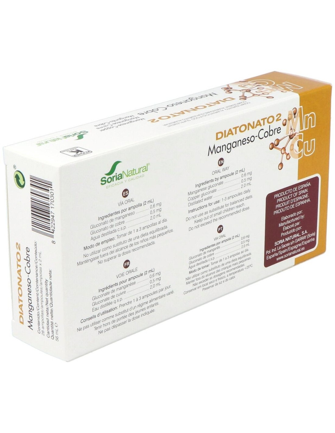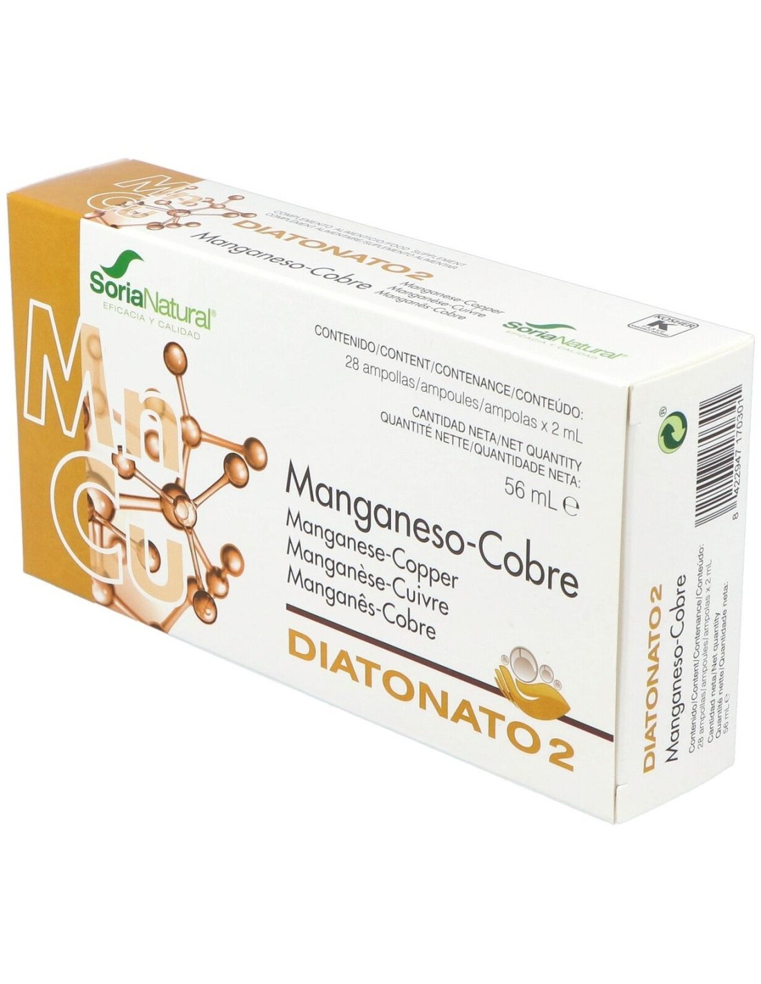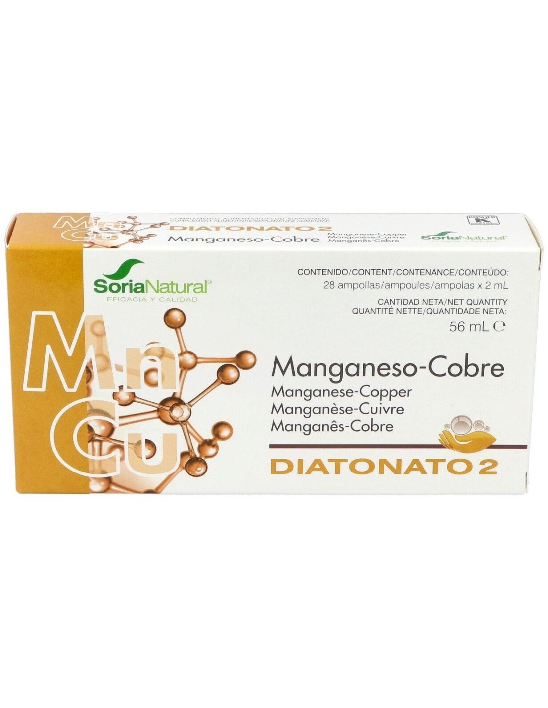 El Diatonato 2 Manganeso-Cobre 28Viales de Soria Natural es un complemento natural dirigido a personas que buscan apoyar su bienestar mineral. Con su fórmula específica, contribuye a mantener el equilibrio de manganeso y cobre en el organismo.