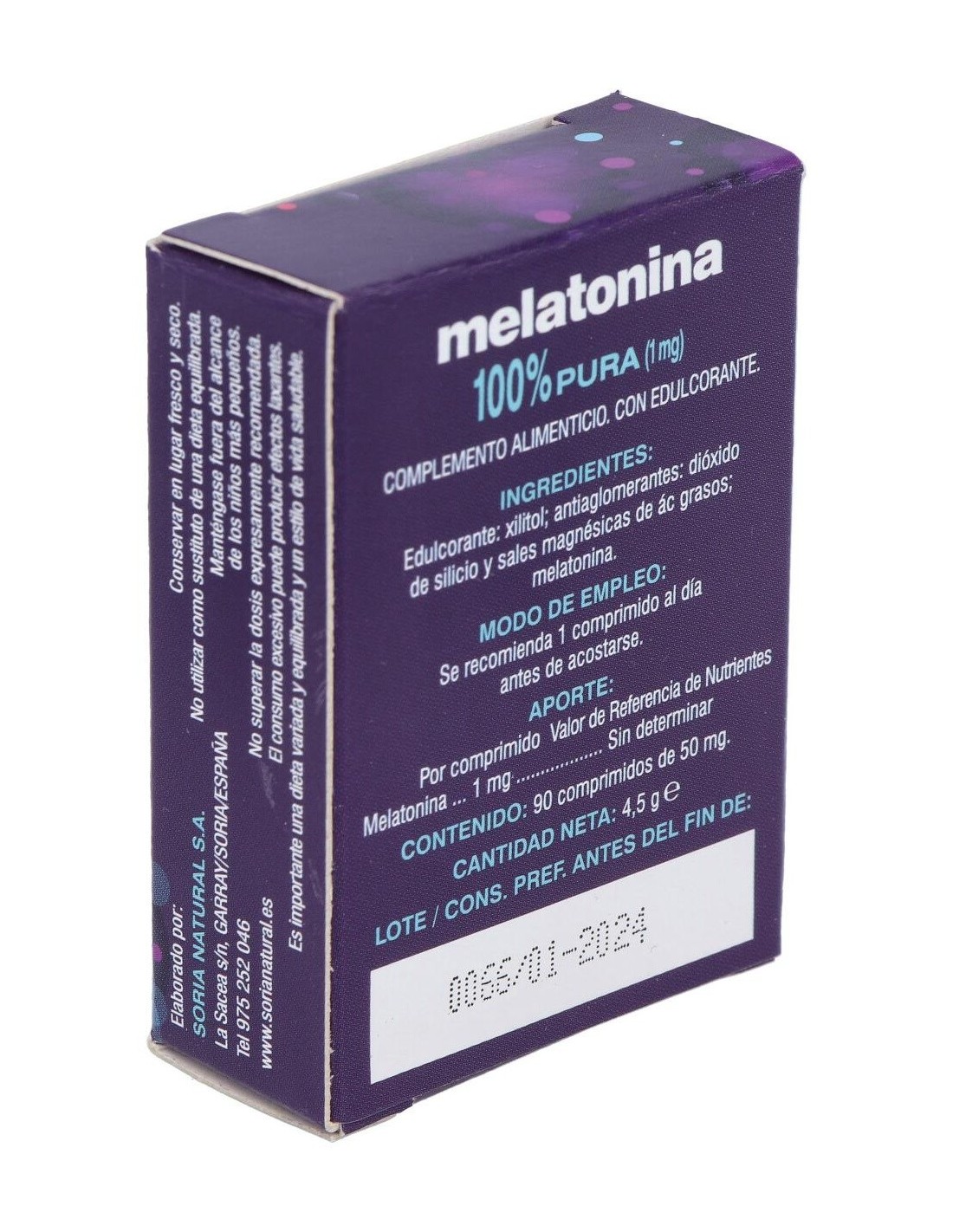 La Melatonina 90Comp. de Soria Natural es un suplemento para personas que buscan regular su ciclo de sueño, facilitando un descanso natural mediante una fórmula dosificada para uso diario.