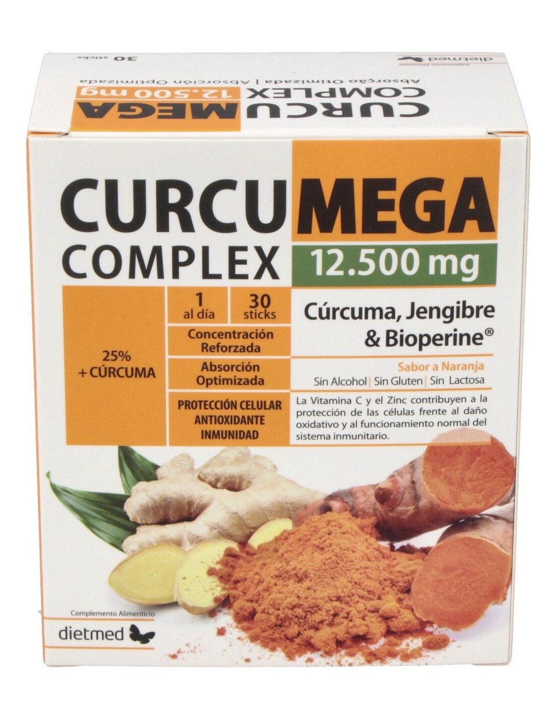 El Curcumega Complex 30Sticks de Dietmed es un suplemento para personas que buscan apoyo antioxidante y bienestar digestivo, formulado con curcumina y extractos naturales que facilitan su absorción y eficacia.