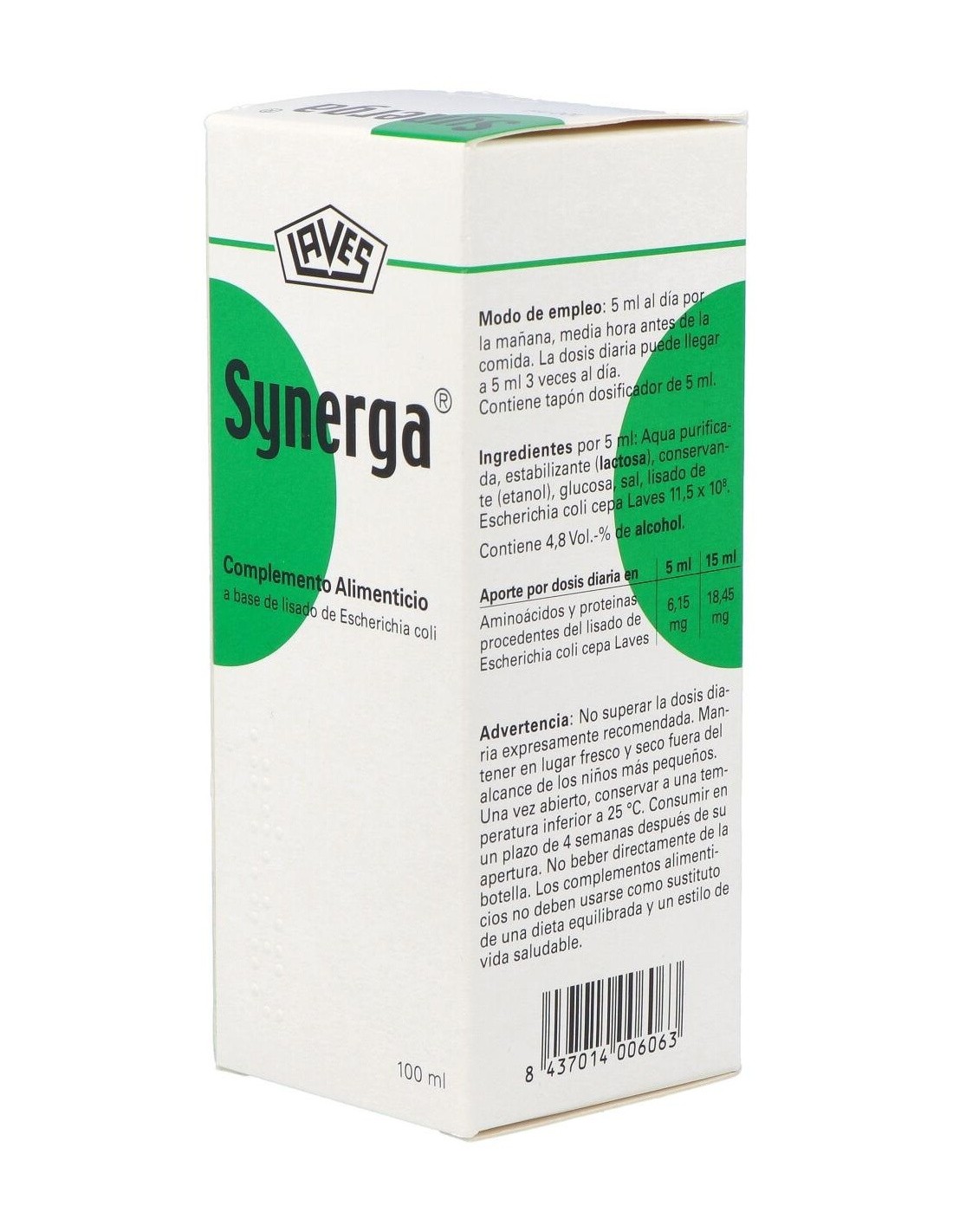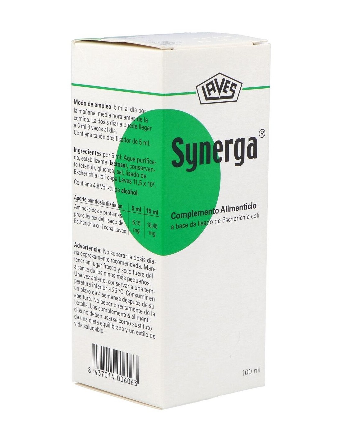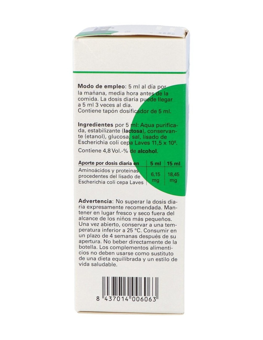 Lisado de Escherichia coli ( cepa Laves1931) 11,05 x 108. Lactosa (procedente de la leche) 0,84g, glucosa 0,07g, cloruro sódico 0,04g, agua purificada. Aditivos: conservante (etanol) 0,26g