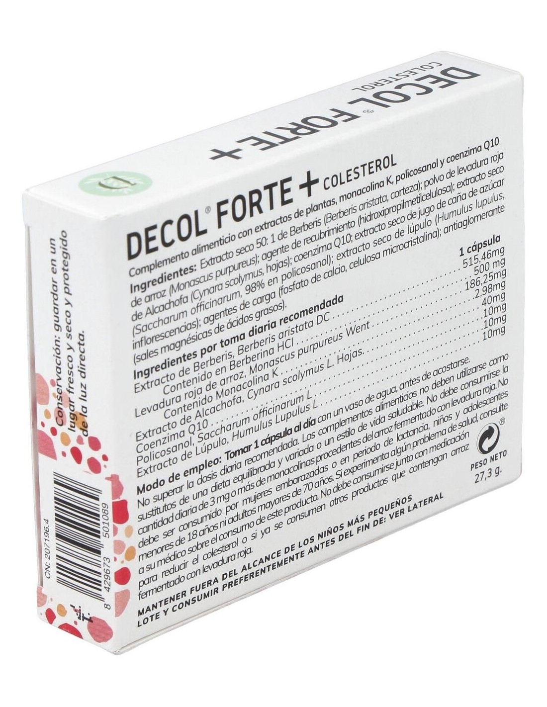 Complemento alimenticio presentado en forma de cápsulas, basado en una sinergia de nutrientes con monacolina K. Contribuye al mantenimiento de niveles normales de colesterol. La monacolina K procede de la fermentación de la levadura roja de arroz, y se potencia a través de la combinación de los extractos de berberis y lúpulo, policosanol y coenzima Q10. Adecuado para adultos.