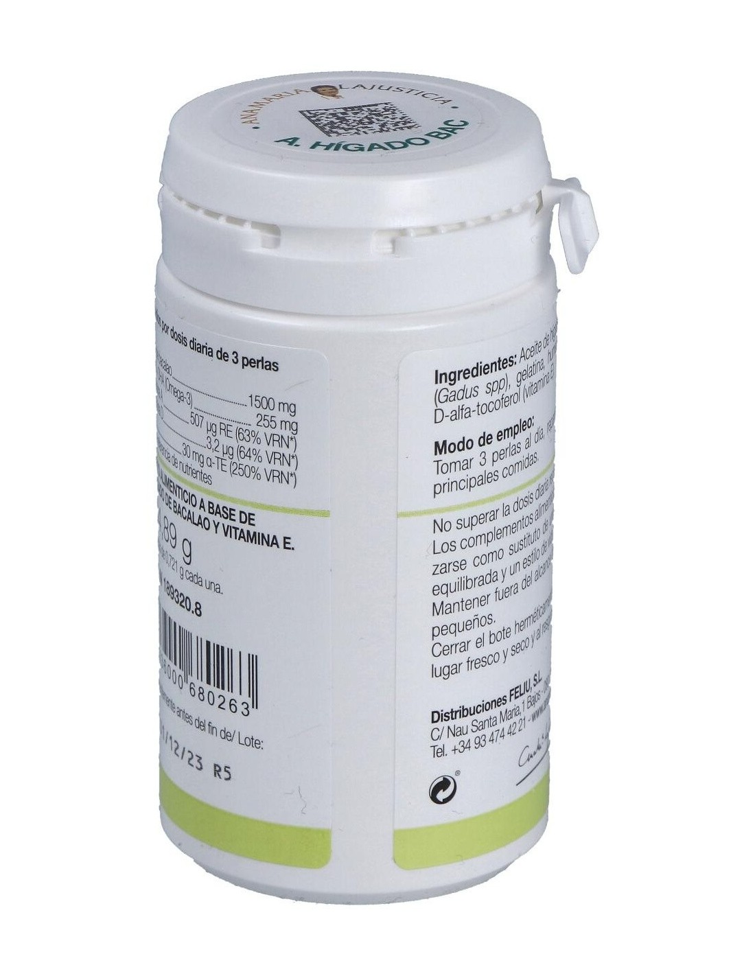 Este producto es un complemento a base de aceite de hígado de bacalao, utilizado tradicionalmente como una fuente natural concentrada de nutrientes que contribuye a cubrir los requerimientos diarios. Este producto destaca por su alto contenido en vitaminas A y D, estas vitaminas ayudan a reforzar el sistema inmunitario, además la vitamina D contribuye a la absorción y utilización normal del calcio y ayuda a proteger frente al daño oxidativo. Por su parte la vitamina A contribuye al mantenimiento de las mucosas, piel y visión en condiciones normales. El aceite de hígado de bacalao también supone una excelente fuente de ácidos grasos esenciales omega 3, asociados con un buen funcionamiento y desarrollo del sistema nervioso, circulatorio, con la visión e incluso con la respuesta inmune. Ingredientes activos por 3 perlas: