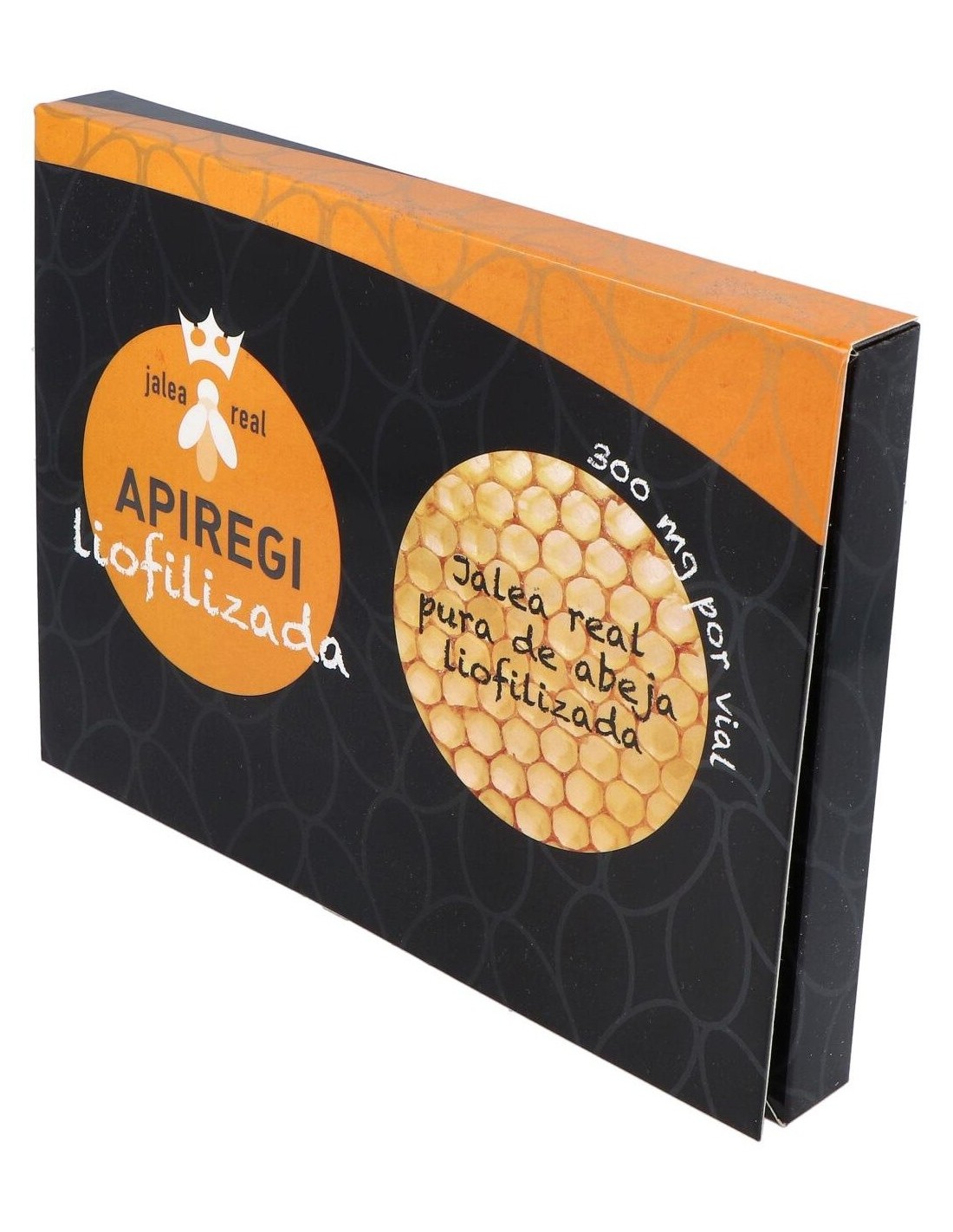 La jalea real es un producto segregado por las glándulas hipofaríngeas y las glándulas mandibulares de las abejas nodrizas (obreras de 5 a 14 días de edad) cuando disponen de polen, agua y miel.La jalea real es de origen endógeno porque la producen exclusivamente las abejas y constituye el alimento de las larvas obreras y zánganos hasta su tercer día y de la reina adulta durante toda su vida.La diferencia en la alimentación entre abejas obreras y reina incide directamente en su ciclo evolutivo, es decir en su desarrollo físico, su capacidad genética y su longetividad: mientras que la abeja reina tiene una vida de unos 5 años, las obreras tan sólo viven de 30 a 45 días.Entre sus propiedades cabe destacar que posee un efecto estimulante, tonificante y reequilibrante del sistema nervioso, mejora la oxigenación cerebral, regulariza los trastornos digestivos. Aporta la energía extra necesaria a niños y adolescentes en edad escolar, sobre todo en época de exámenes y competición deportiva.Contiene ácido petroilglutámico y nicotinamida por lo que se le atribuye una acción vasodilatadora y favorecedora de la proliferación de glóbulos rojos. Por este motivo es utilizada también en casos de anemia o como preventivo de enfermedades cardiovasculares.También posee poder antimicrobiano, por los que puede ser recomendada como preventiva en periodos de epidemias gripales y como refuerzo del sistema inmunitario de los grupos de más riesgo: niños, ancianos y personas debilitadas.Por todas estas propiedades, la jalea real constituye un excelente complemento alimentario en estados de debilidad o agotamiento físico o psíquico.Apiregi Jalea Real Liofilizada se compone de Jalea Real De Alta Calidad: mínimo 5% en ácido 10-hidroxidecenoico (ácido jaleaareálico-10-HDA).Ingredientes:Jalea real 100% pura de abeja.Modo de empleo:Tomar 1 vial diario, preferiblemente por las mañanas y en ayunas. Se puede mezclar en zumo o leche o ingerir directamente.Presentación:Envase de 14 viales.