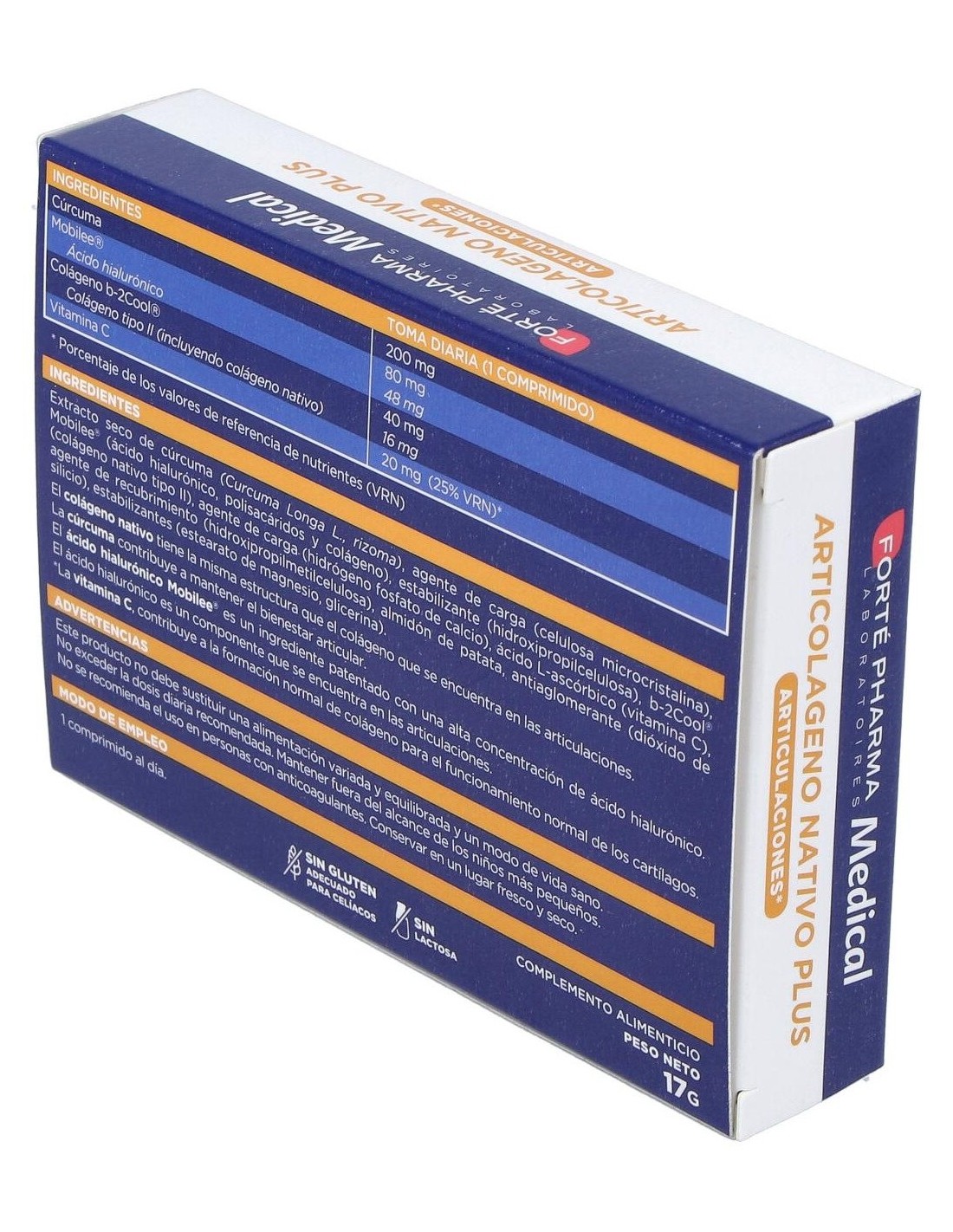Colágeno nativo tipo II (b-2Cool®), ácido hialurónico (Mobilee®), cúrcuma y vitamina C. Excipientes.