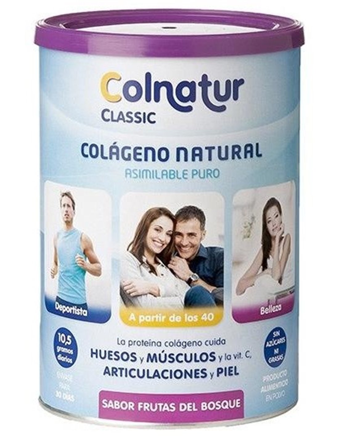¿Qué es el colágeno?Es la proteína más abundante de nuestro cuerpo y el componente esencial de articulaciones, cartílagos, ligamentos, tendones, huesos, piel y del tejido conectivo que protege músculos y órganos vitales.También forma parte de la pared de los vasos sanguíneos, córnea ocular, cuero cabelludo, encías y dentina.Se encuentra únicamente en los animales y su función es aportar resistencia y flexibilidad a sus tejidos orgánicos.¿Qué es Colnatur?Es un producto alimenticio compuesto exclusivamente por proteína colágeno hidrolizada (predigerida), muy asimilable, en forma de polvo granulado soluble.Se obtiene a partir de materias primas naturales, alimentarias y trazables, de origen porcino (tejido óseo y articular), utilizando procesos también naturales (cocción y enzimas), sin adición de productos químicos.No contiene grasas, colesterol, azúcares, edulcorates, asitivos, alergénicos (gluten, lactosa...) ni OMGs.La CDR no contiene cantidades significativas de sodio ni purinas.¿Por qué tomar diariamente colágeno asimilable?El colágeno es la proteína esencial de huesos, articulaciones, músculos y piel. Con el paso de los años o el sobreuso nuestro colágeno se pierde y deteriora.La proteína colágeno hidrolizada, muy asimilable, es un nutriente q ue nos aporta los aminoácidos propios del colágeno, de forma rápidamente disponible.Tomar diariamente 10 gramos de proteína colágeno asimilable ayuda al mantenimiento de huesos y músculos.¿Cuándo empiezan a percibirse sus efectos?A partir de 1 a 3 meses desde que se inicia la toma.¿Duante cuánto tiempo puede tomarse?Por ser un producto alimenticio y no un suplemento, no requiere períodos de descanso y puede tomarse indefinidamente.¿Presenta alguna intolerancia, alergía, incompatibilidad o efecto indiseable?Colnatur es un producto de alta seguridad alimentaria, que no presenta ninguno de estos efectos. Ingredientes: 100% proteina hidrolizada de colágeno. Modo de empleo:Tomar 10 grs (vasito dosificador) al día con el desayuno. Presentación:Bote de 315 gramos sabor frutas del bosque.