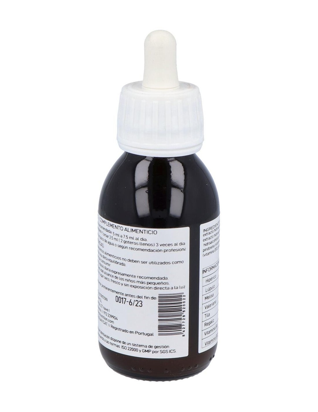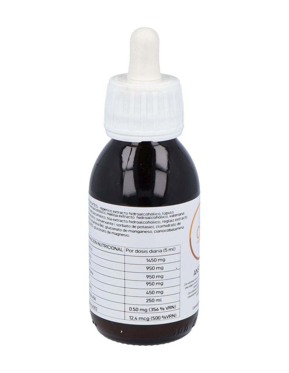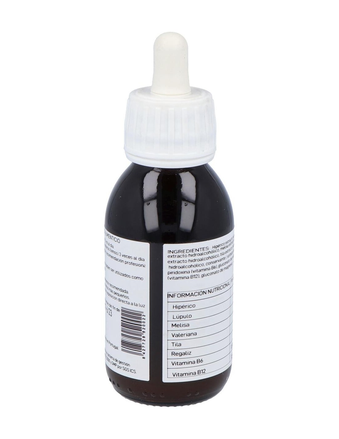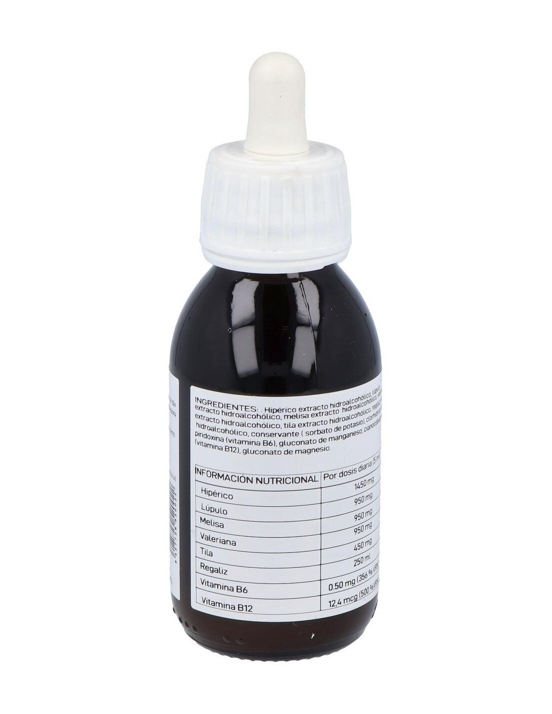 Extracto fluido de Hypericum perforatum: 580 mg. Extracto fluido de Humulus lupulus: 380 mg. Extracto fluido de Melissa officinalis: 380 mg. Extracto fluido de Valeriana officinalis: 380 mg. Extracto fluido de Tilia platyphyllos: 180 mg. Extracto fluido de Glycyrhiza glabra: 100 mg. Vitamina B6. Vitamina B12. *Contiene alcohol.