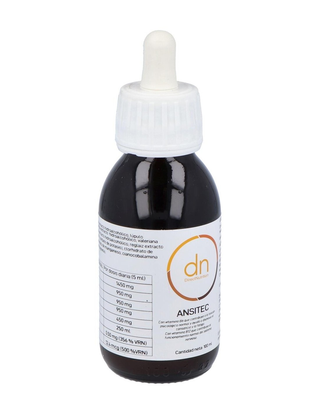 Direct Nutrition Ansitec 100ml es un suplemento de Direct Nutrition para la relajación general del organismo que consta de una mezcla de elementos de origen natural que ayudan a disminuir la sensación de nervios en el cuerpo. Posee extracto de valeriana officinalis que promueve la conciliación del sueño. Además, cuenta con dosis de vitamina B6 y B12 que contribuyen al correcto funcionamiento del sistema nervioso y de las capacidades cognitivas. Está recomendado para usuarios frecuentemente expuestos a entornos estresantes y para regular trastornos del sueño. Se puede usar en jóvenes y adultos. Mantener alejado del alcance de los niños. No ingerir en cantidades excesivas. En caso de observar resultados negativos, se aconseja suspender el uso y consultar con el médico o farmacéutico de confianza.