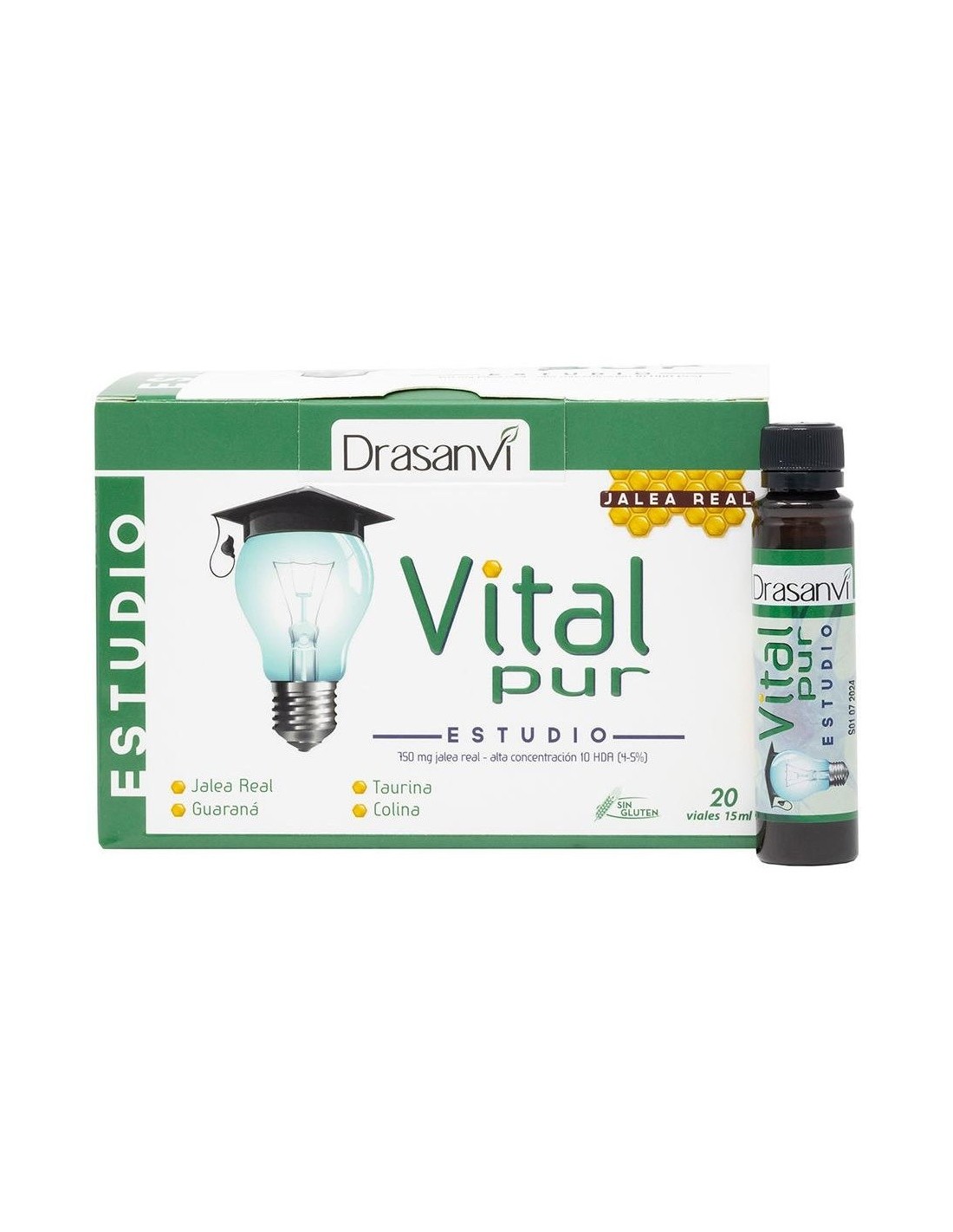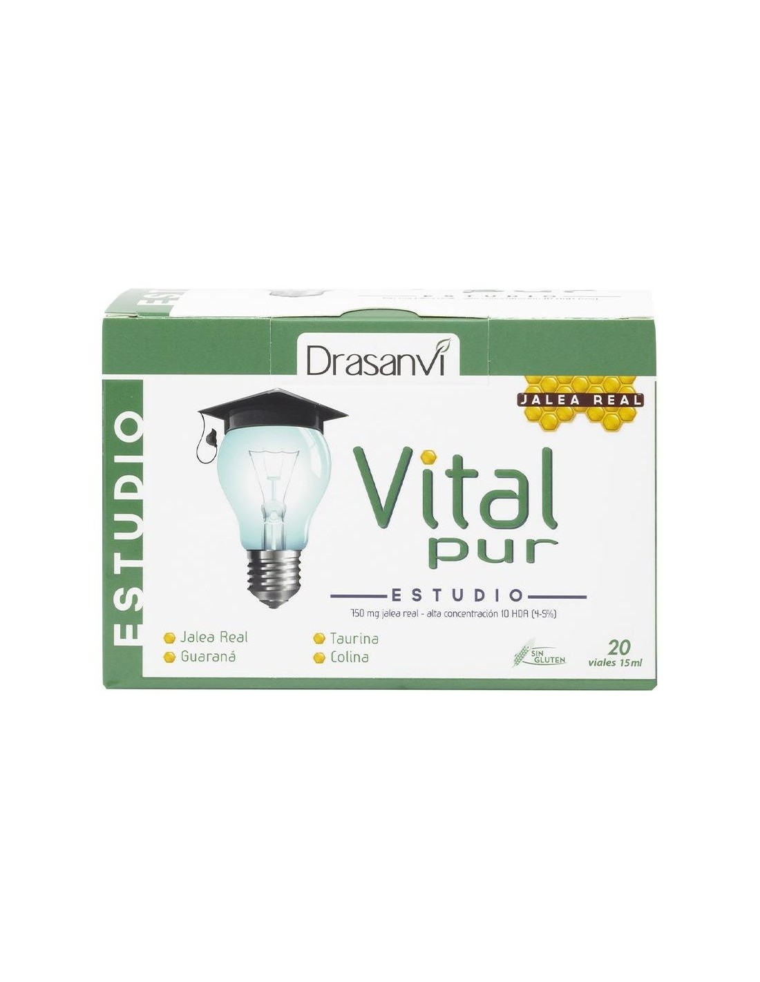 Ayuda a disminuir el cansancio y la fatiga. Vitalpur Estudio, es un complemento alimenticio que utiliza la jalea real (750 mg) como base del producto. La jalea real, es una sustancia elaborada por la abejas para alimentar a la abeja reina. Se trata de una sustancia rica en vitaminas, minerales y aminoácidos. Vitalpur Estudio se refuerza con hierro, magnesio, colina, lecitina y taurina; además de los extractos vegetales de ginkgo biloba y el guaraná.Ingredientes por vial:
