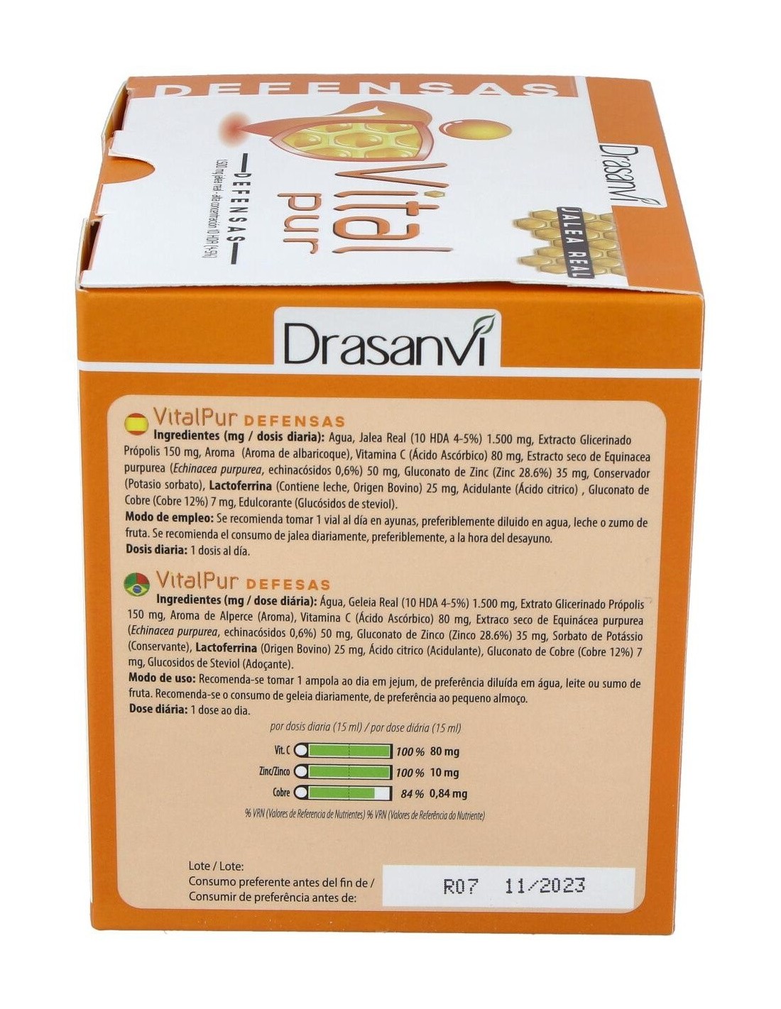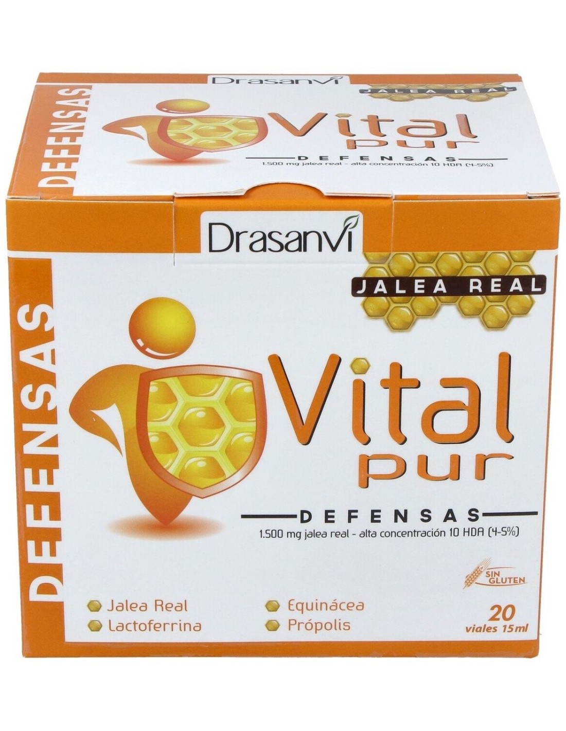 Este producto contribuye al funcionamiento normal del sistema inmunitario. Vitalpur Defensas, es un complemento alimenticio a base de Jalea Real (1.500 mg) reforzada con sustancias que contribuyen al funcionamiento normal del sistema inmunitario como es el zinc, el cobre y la vitamina C. Además en su composición encontramos propolis, echinacea y lactoferrina (proteína presente en la leche materna de los mamíferos). Vital Pur Defensas, no lleva azúcares añadidos, y opta por la Stevia (Edulcorante extraído de las hojas de una planta). Composición por vial: