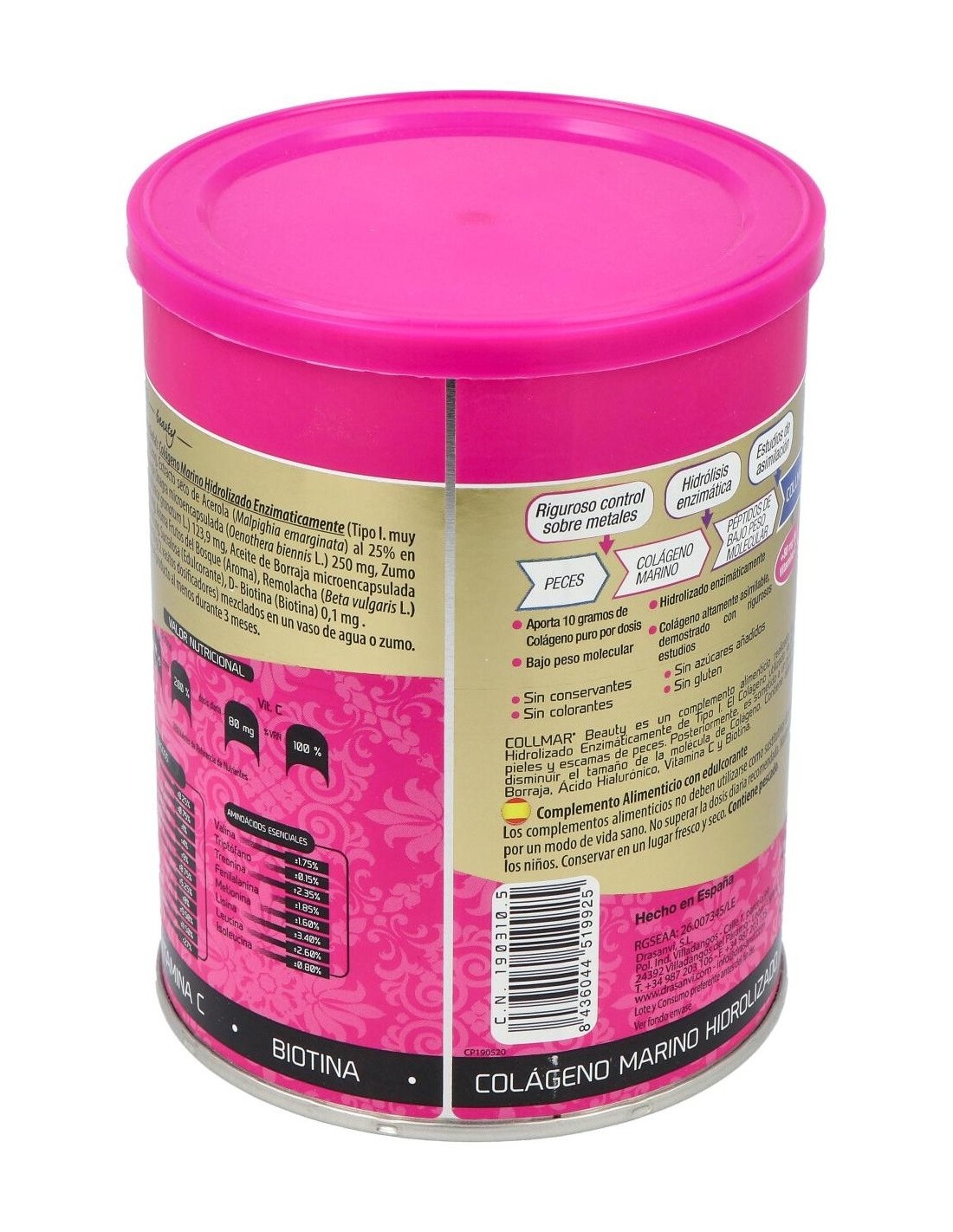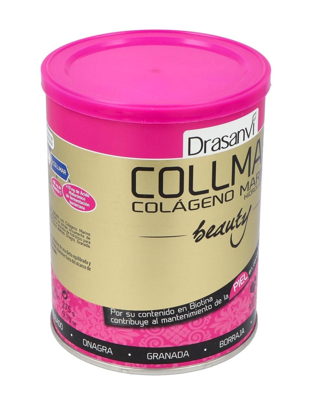 Collmar® Beauty, una estudiada composición, cuyo ingrediente principal es el colágeno marino hidrolizado, el cual ha sido reforzado con vitaminas como la biotina y la vitamina C, ácidos insaturados provenientes del aceite de borraja y onagra, y potenciado con las propiedades de la granada. Propiedades de los principios activos: