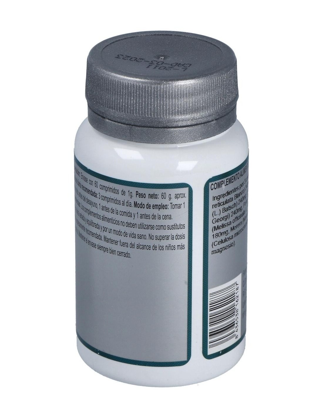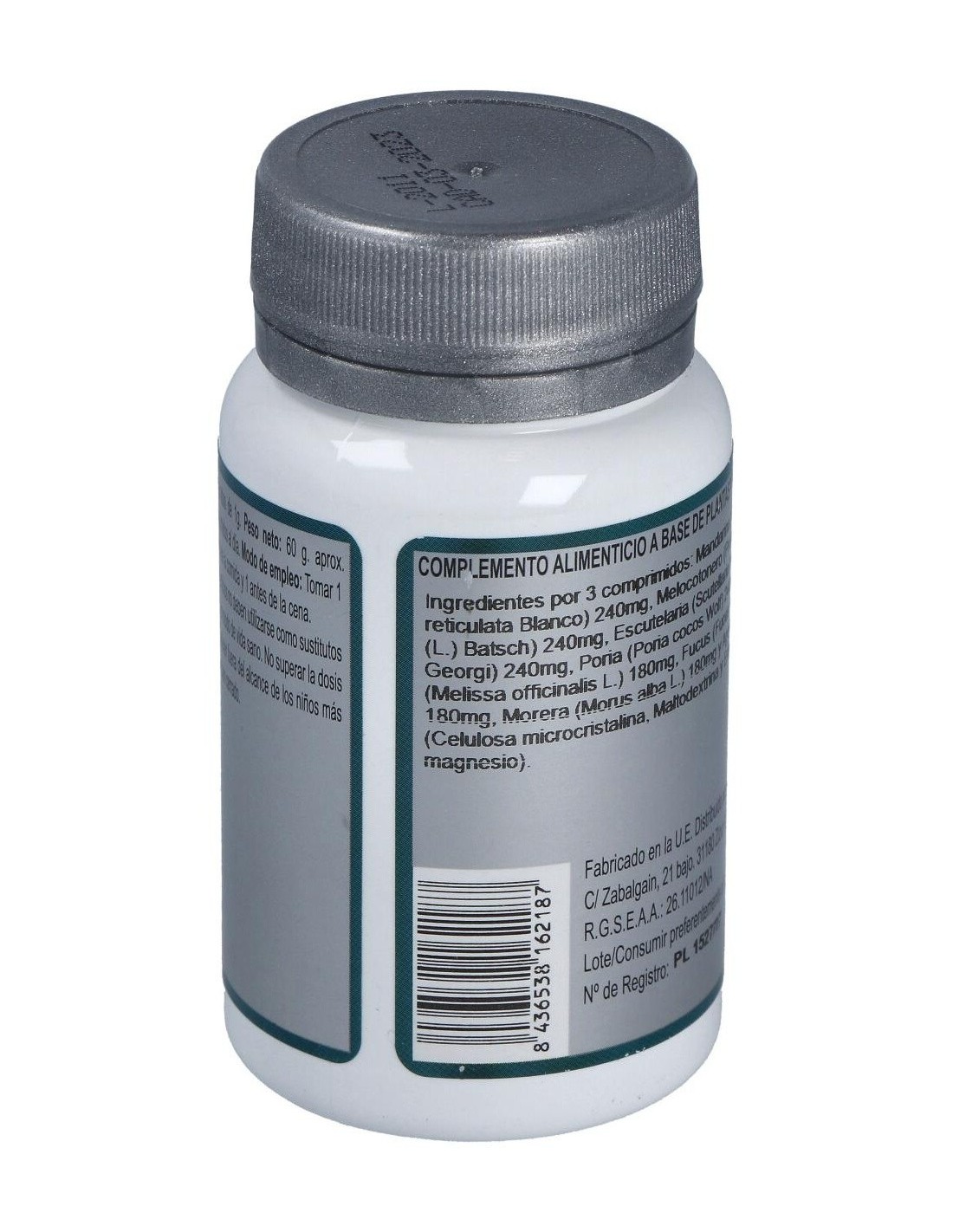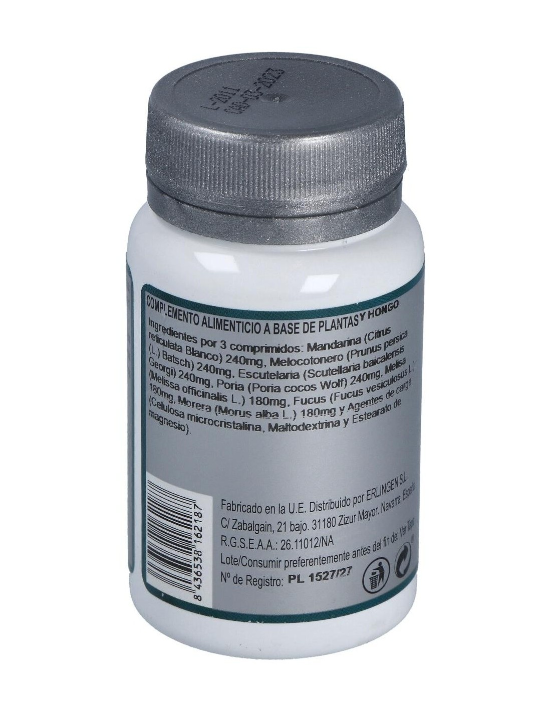 Mandarina (Citrus reticulata Blanco) 240 mg, Melocotonero (Prunus persica (L.) Batsch) 240 mg, Escutelaria (Scutellaria baicalensis Georgi) 240 mg, Poria (Poria cocos Wolf) 240 mg, Melisa (Melissa officinalis L.) 180 mg, Fucus (Fucus vesiculosus L.) 180 mg, Morera (Morus alba L.) 180 mg y Agentes de carga (Celulosa microcristalina, Maltodextrina y Estearato de magnesio).