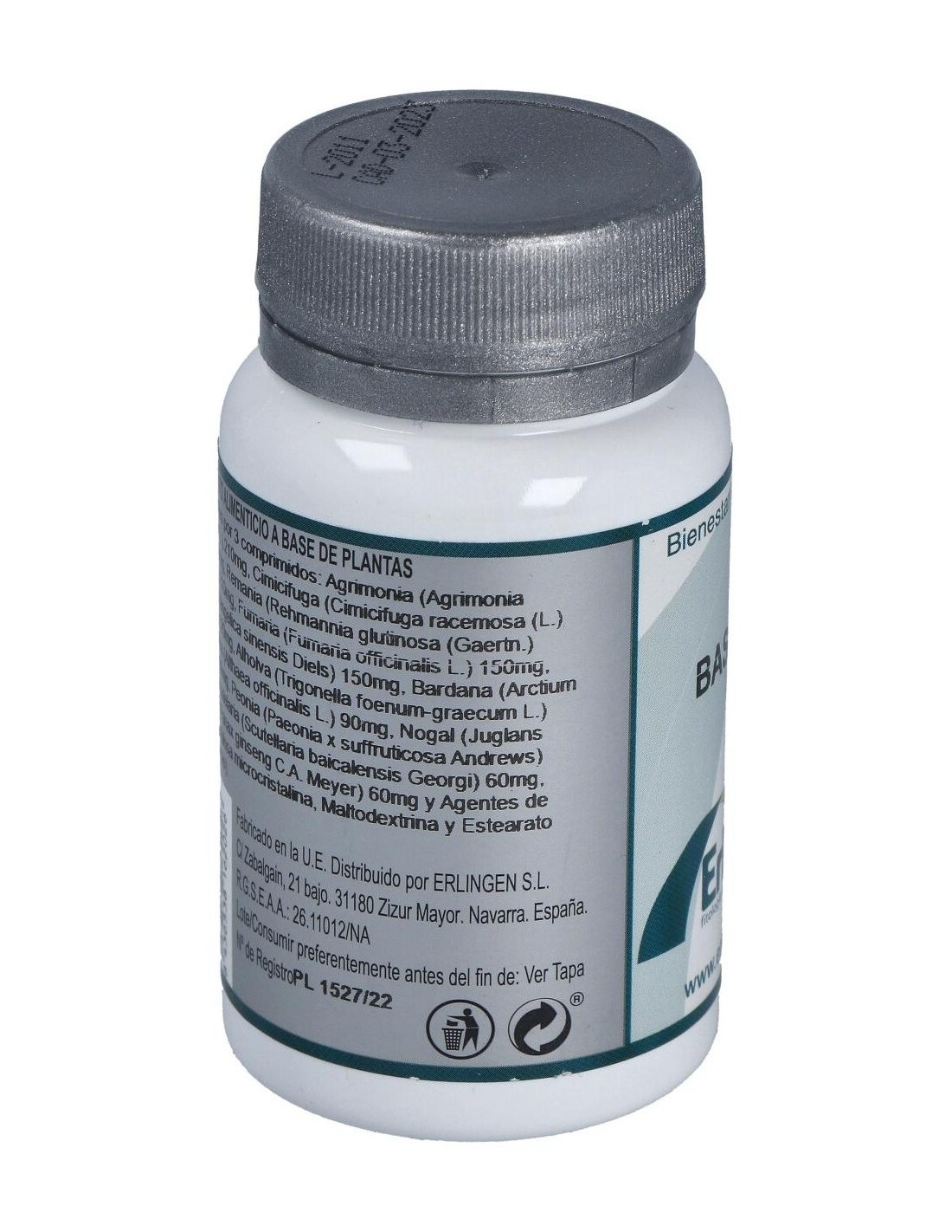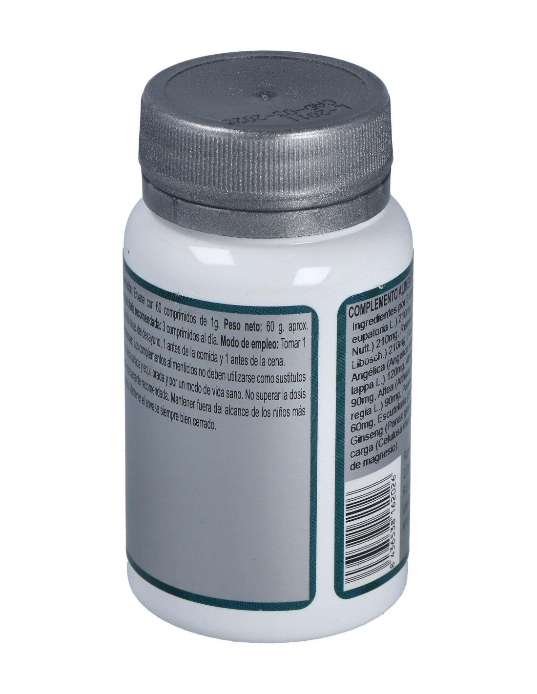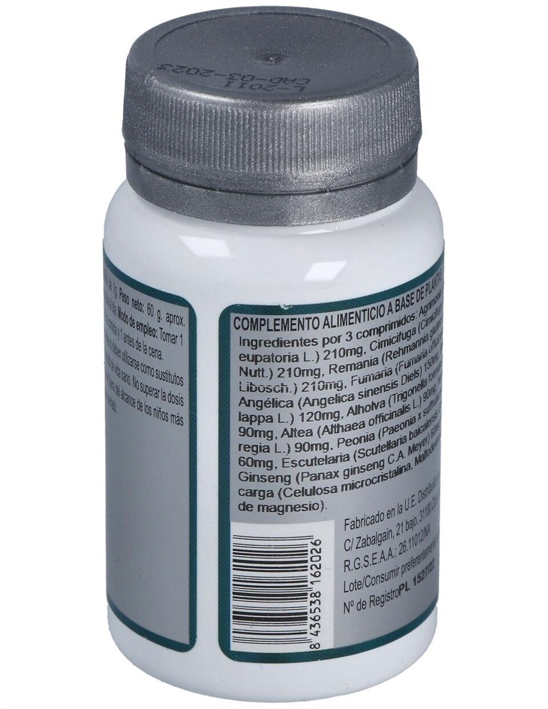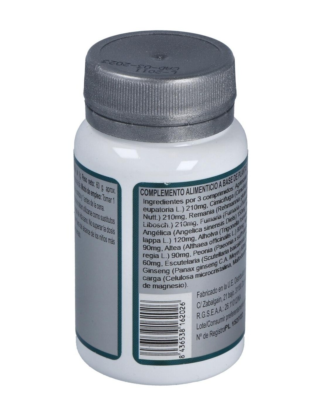 Agentes de carga (Celulosa microcristalina y Maltodextrina), Agrimonia (Agrimonia eupatoria L.) 270 mg, Remania (Rehmannia glutinosa (Gaertn.) DC.) 270 mg, Fumaria (Fumaria officinalis L.) 180 mg, Angélica (Angelica sinensis (Oliv.) Diels) 180 mg, Bardana (Arctium lappa L.) 120 mg, Alholva (Trigonella foenum-graecum L.) 90 mg, Altea (Althaea officinalis L.) 90 mg, Nogal (Juglans regia L.) 90 mg, Peonía (Paeonia suffruticosa Andrews) 60 mg, Escutelaria (Scutellaria baicalensis Georgi) 60 mg, Ginseng (Panax giseng C.A. Mey) 60 mg, Agente de carga (Estearato de magnesio) y Cimicifuga (Cimicifuga racemosa (L.) Nutt.) 30 mg