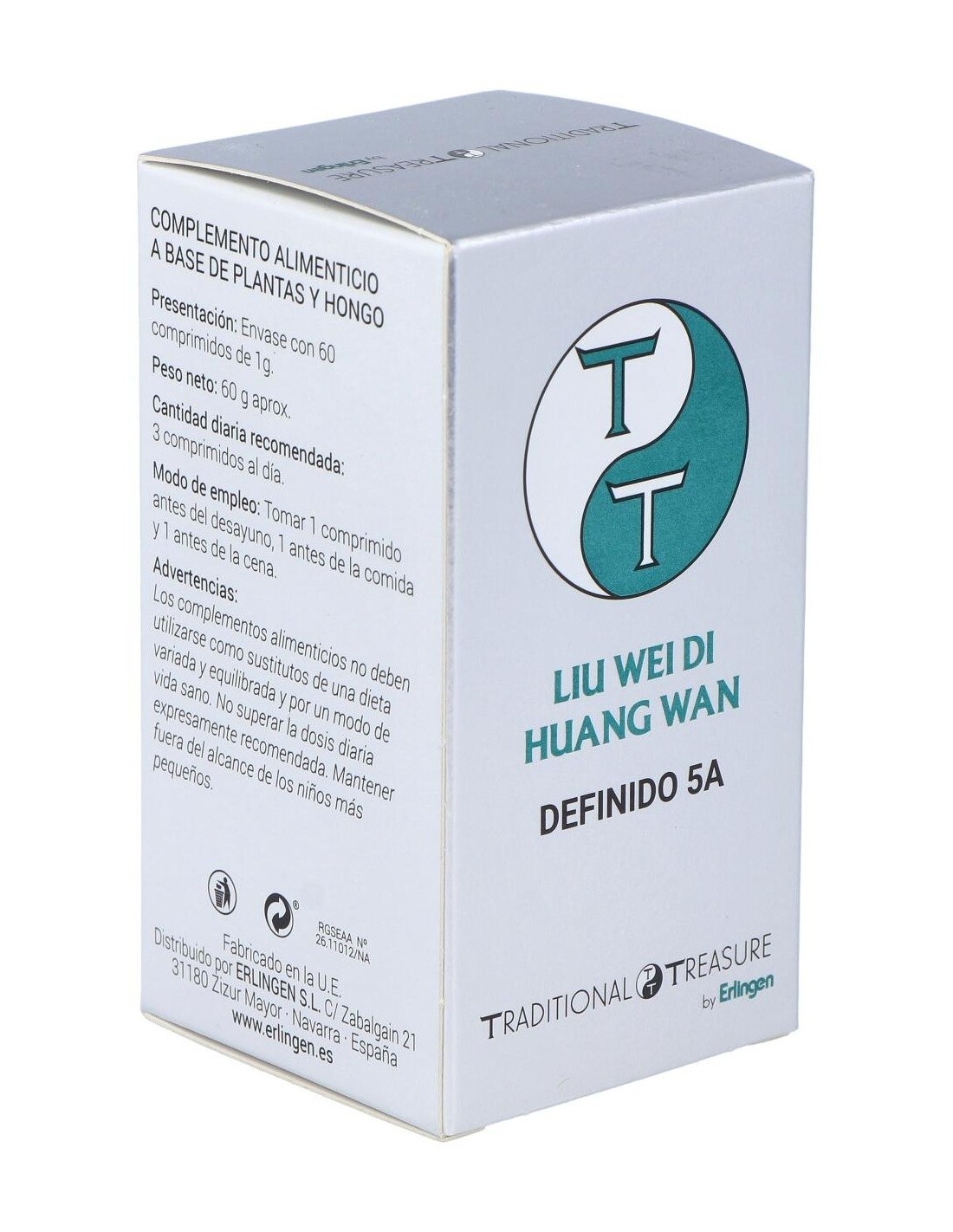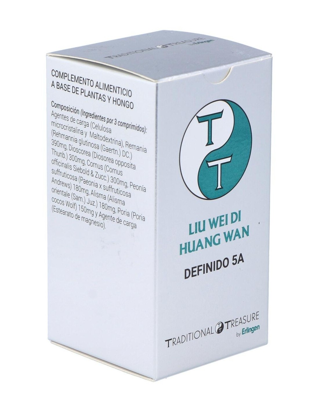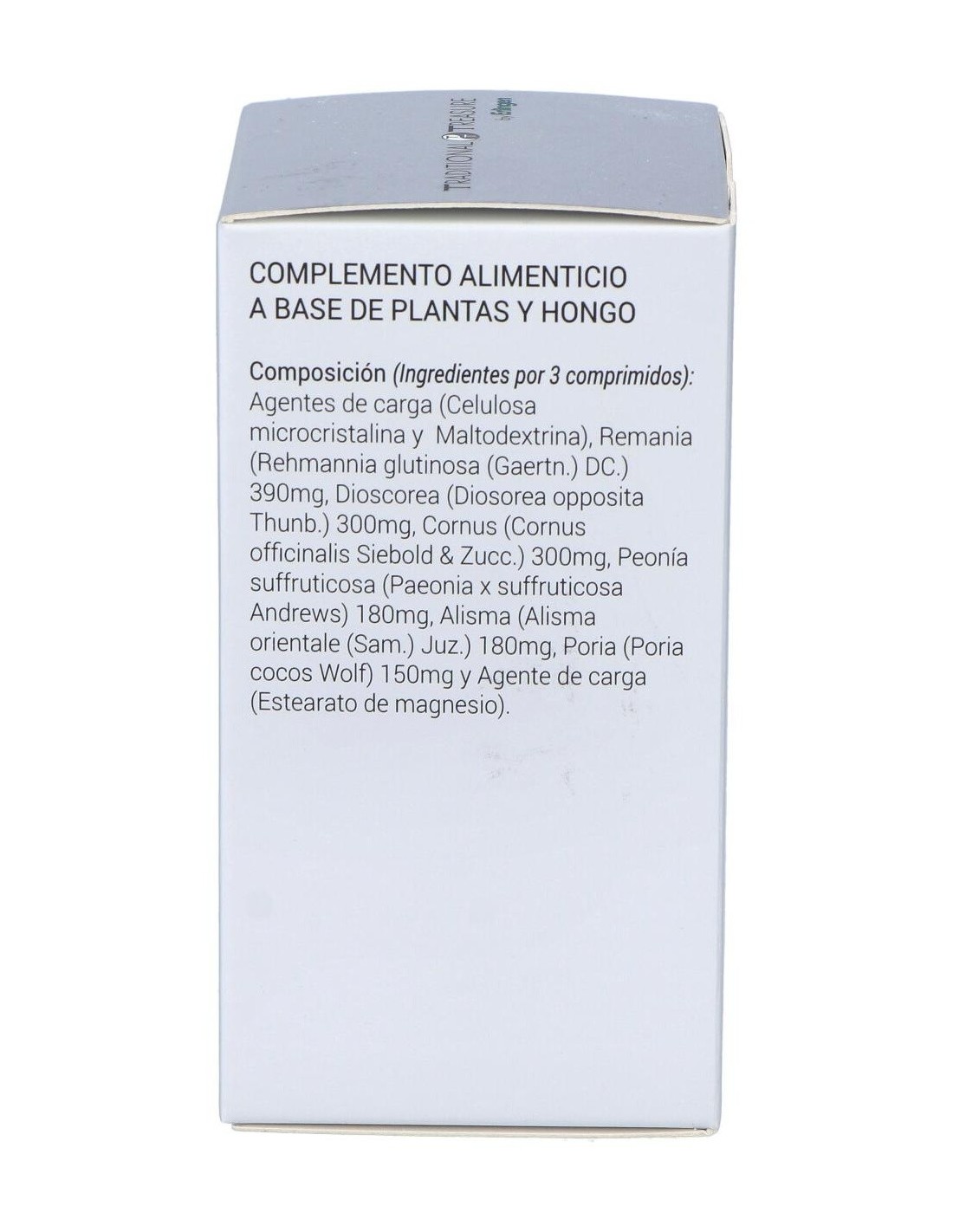 Agentes de carga (Celulosa microcristalina y Maltodextrina), Remania (Rehmannia glutinosa (Gaertn.) DC.) 390 mg, Dioscorea (Diosorea opposita Thunb.) 300 mg, Cornus (Cornus officinalis Siebold & Zucc.) 300 mg, Peonía suffruticosa (Paeonia x suffruticosa Andrews) 180 mg, Alisma (Alisma orientale (Sam.) Juz.) 180 mg, Poria (Poria cocos Wolf) 150 mg y Agente de carga (Estearato de magnesio).