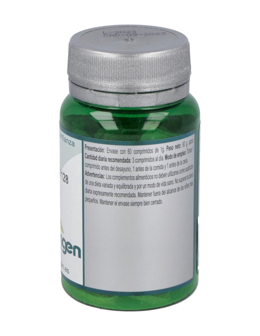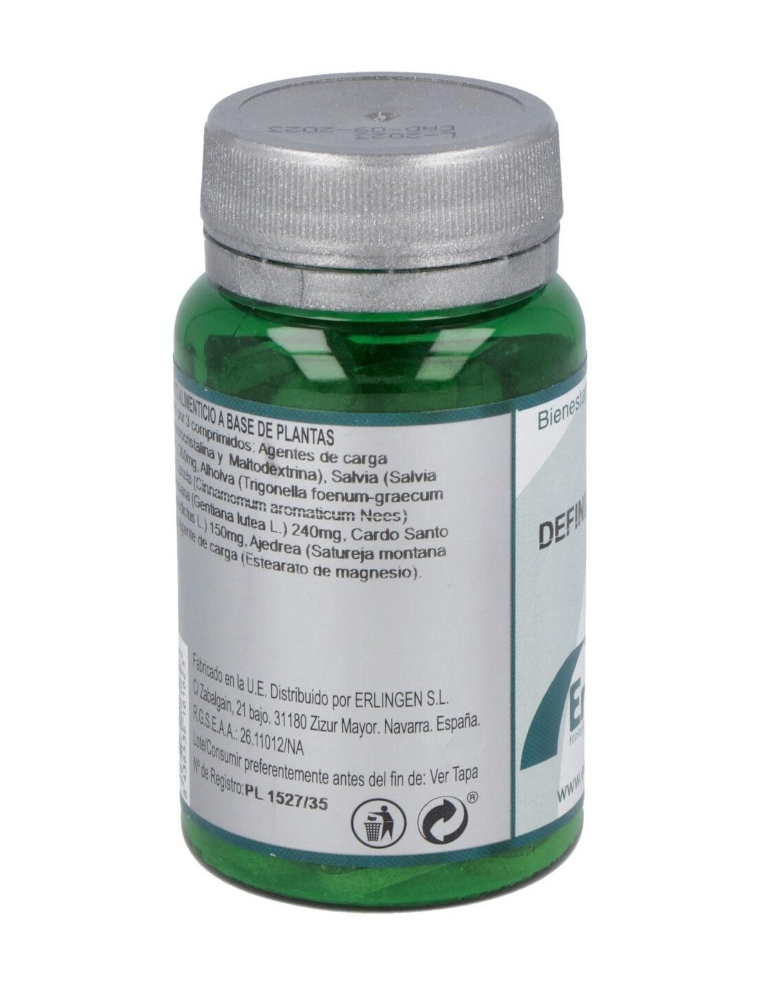 Ingredientes por 3 comprimidos: Agentes de carga (Celulosa microcristalina y Maltodextrina), Salvia (Salvia officinalis L.) 360mg, Alholva (Trigonella foenum-graecum L.) 300mg, Canela (Cinnamomum aromaticum Nees) 300mg, Genciana (Gentiana lutea L.) 240mg, Cardo Santo (Cnicus benedictus L.) 150mg, Ajedrea (Satureja montana L.) 150mg y Agente de carga (Estearato de magnesio).