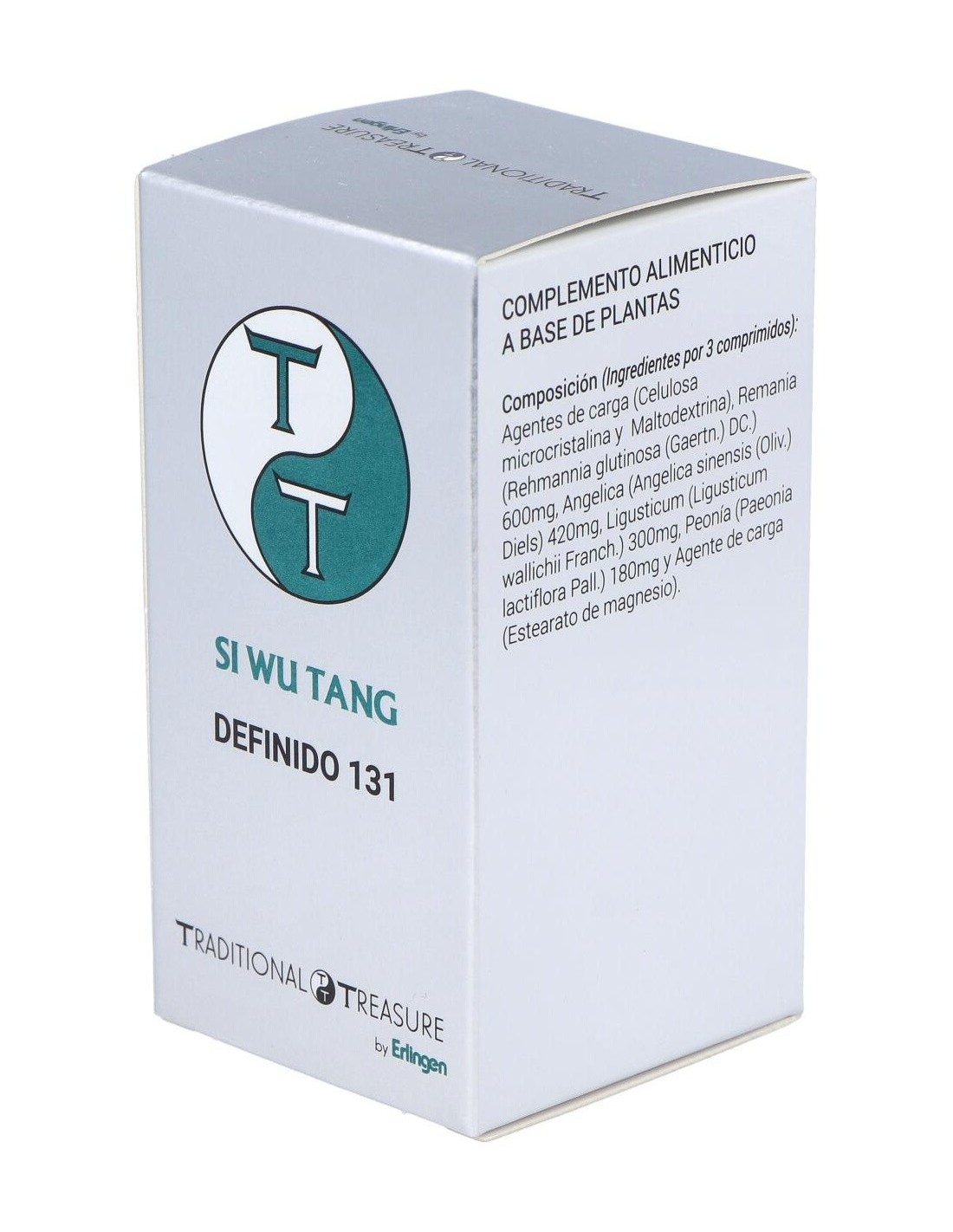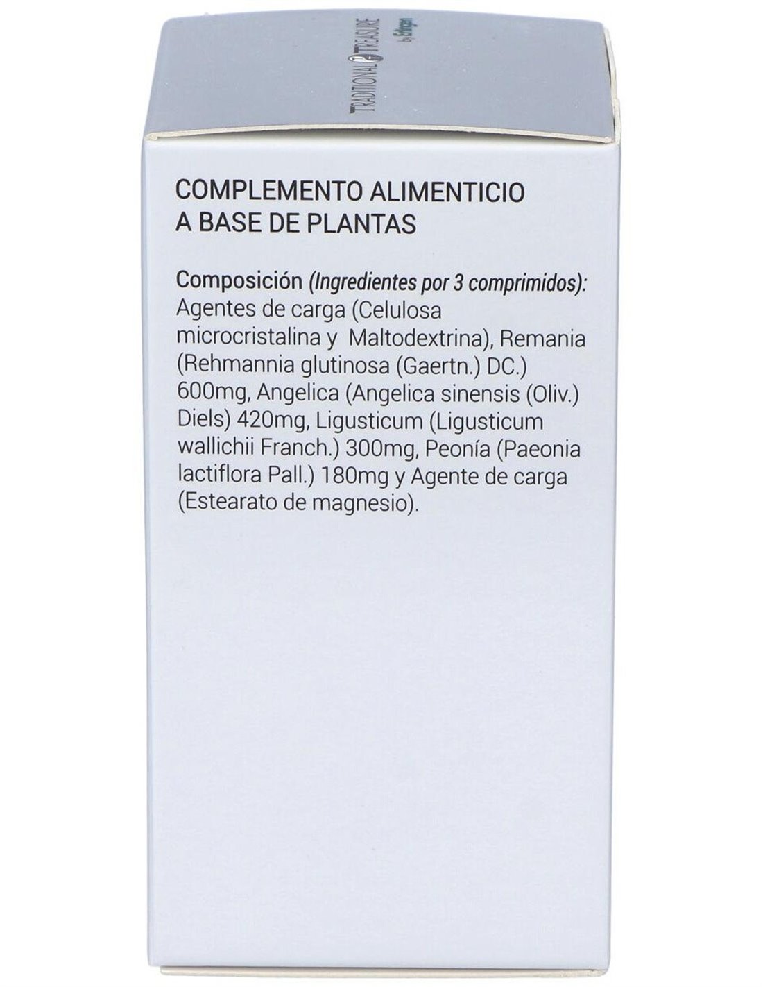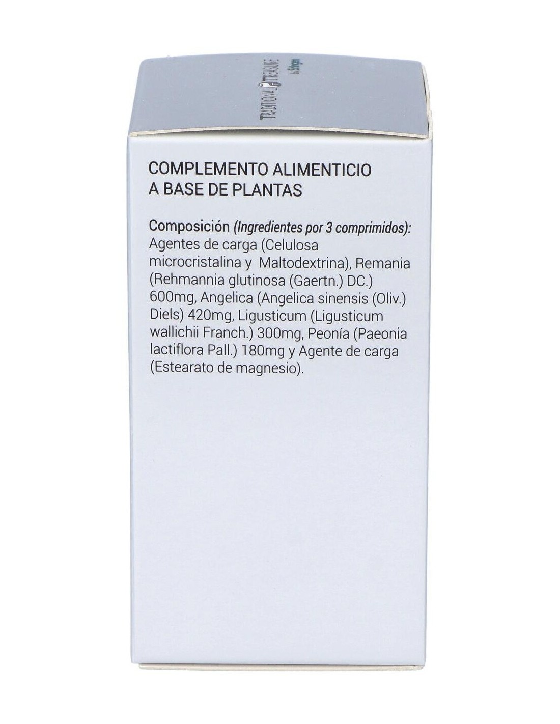 Agentes de carga (Celulosa microcristalina y Maltodextrina), Remania (Rehmannia glutinosa (Gaertn.) DC.) 600 mg, Angélica (Angelica sinensis (Oliv.) Diels) 420 mg, Ligusticum (Ligusticum wallichii Franch.) 300 mg, Peonía (Paeonia lactiflora Pall.) 180 mg y Agente de carga (Estearato de magnesio).