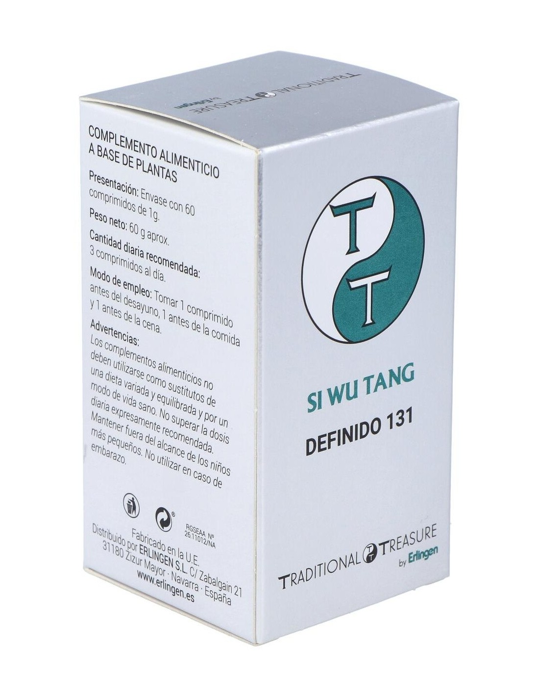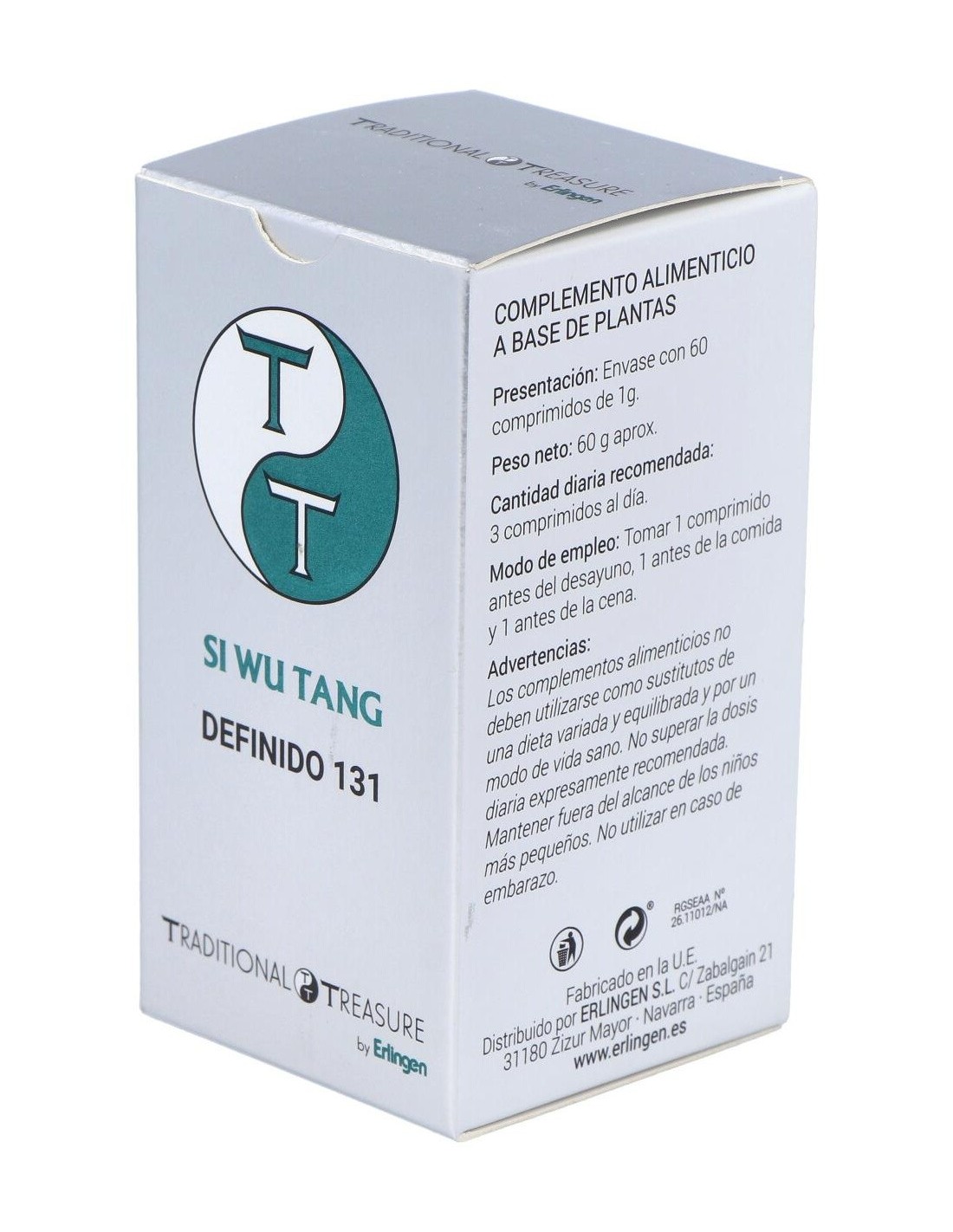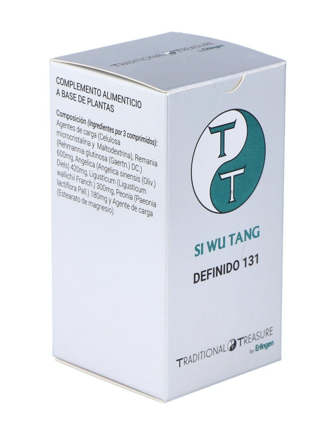 Agentes de carga (Celulosa microcristalina y Maltodextrina), Remania (Rehmannia glutinosa (Gaertn.) DC.) 600 mg, Angélica (Angelica sinensis (Oliv.) Diels) 420 mg, Ligusticum (Ligusticum wallichii Franch.) 300 mg, Peonía (Paeonia lactiflora Pall.) 180 mg y Agente de carga (Estearato de magnesio).
