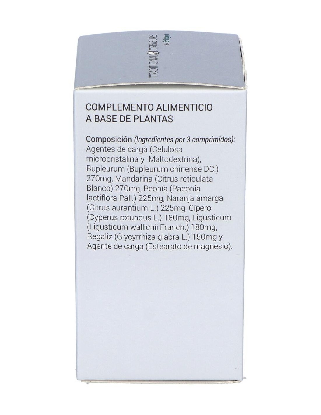 Agentes de carga (Celulosa microcristalina y Maltodextrina), Bupleurum (Bupleurum chinense DC.) 270 mg, Mandarina (Citrus reticulata Blanco) 270 mg, Peonía (Paeonia lactiflora Pall.) 225 mg, Naranja amarga (Citrus aurantium L.) 225 mg, Cípero (Cyperus rotundus L.) 180 mg, Ligusticum (Ligusticum wallichii Franch.) 180 mg, Regaliz (Glycyrrhiza glabra L.) 150 mg y Agente de carga (Estearato de magnesio).