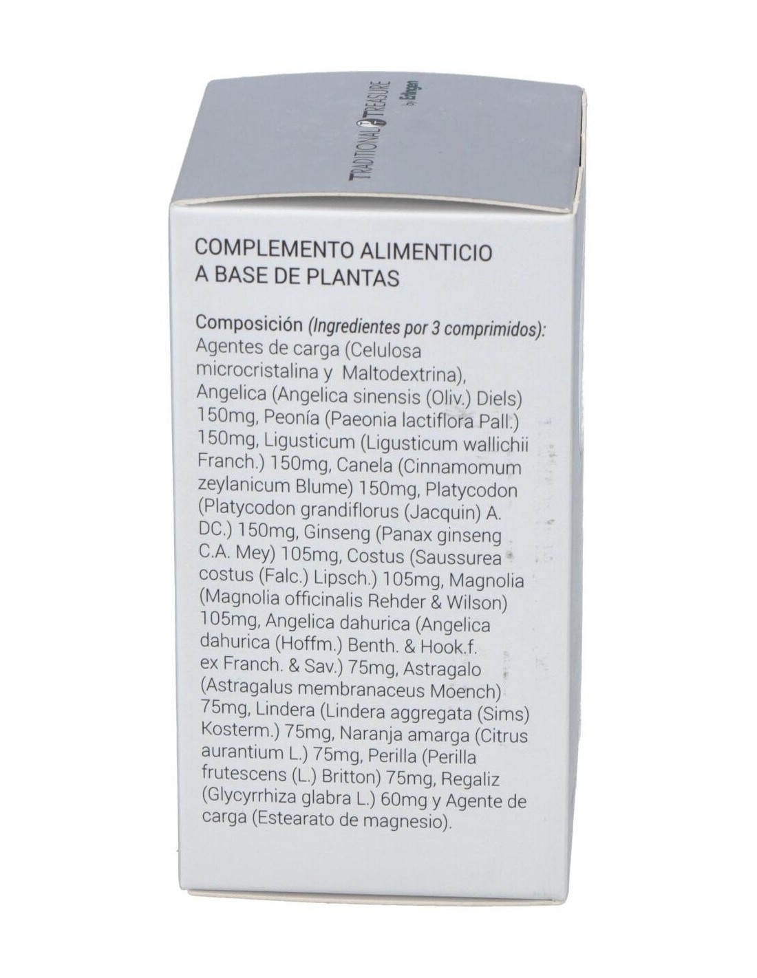 Angelica (Angelica sinensis Diels.), Peonia (Paeonia lactiflora Pall.), Canela (Cinnamomum zeylanicum Blume), Ginseng (Panax ginseng C.A. Meyer), Magnolia (Magnolia officinalis Rehder et E.H. Wilson), Astragalus (Astragalus membranaceus Moench), Lindera (Lindera aggregata (Sims) Kosterm.) y Agentes de carga (Celulosa microcristalina, Maltodextrina y Estearato de magnesio).