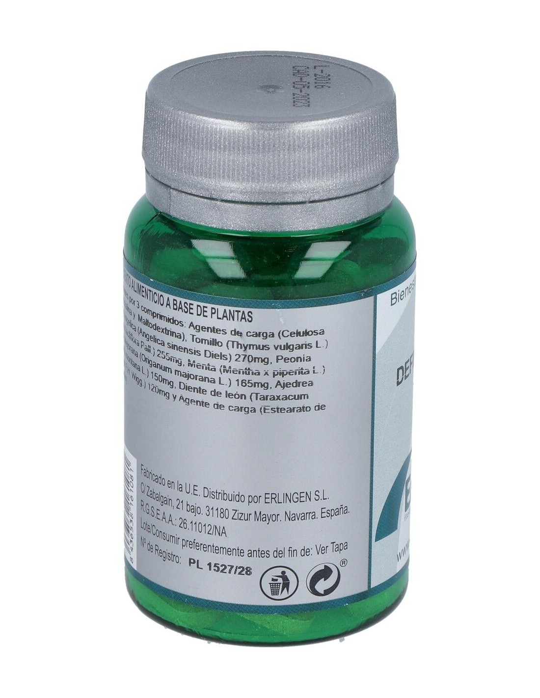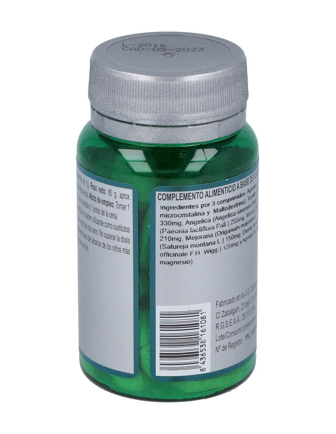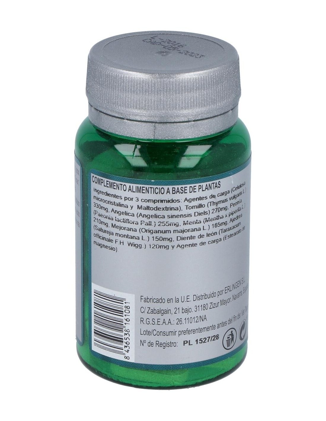 Agentes de carga (Celulosa microcristalina y Maltodextrina), Tomillo (Thymus vulgaris L.) 330 mg, Angélica (Angelica sinensis Diels) 270 mg, Peonía (Paeonia lactiflora Pall.) 255 mg, Menta (Mentha x piperita L.) 210 mg, Mejorana (Origanum majorana L.) 165 mg, Ajedrea (Satureja montana L.) 150 mg, Diente de león (Taraxacum officinale F.H. Wigg.) 120 mg y Agente de carga (Estearato de magnesio).