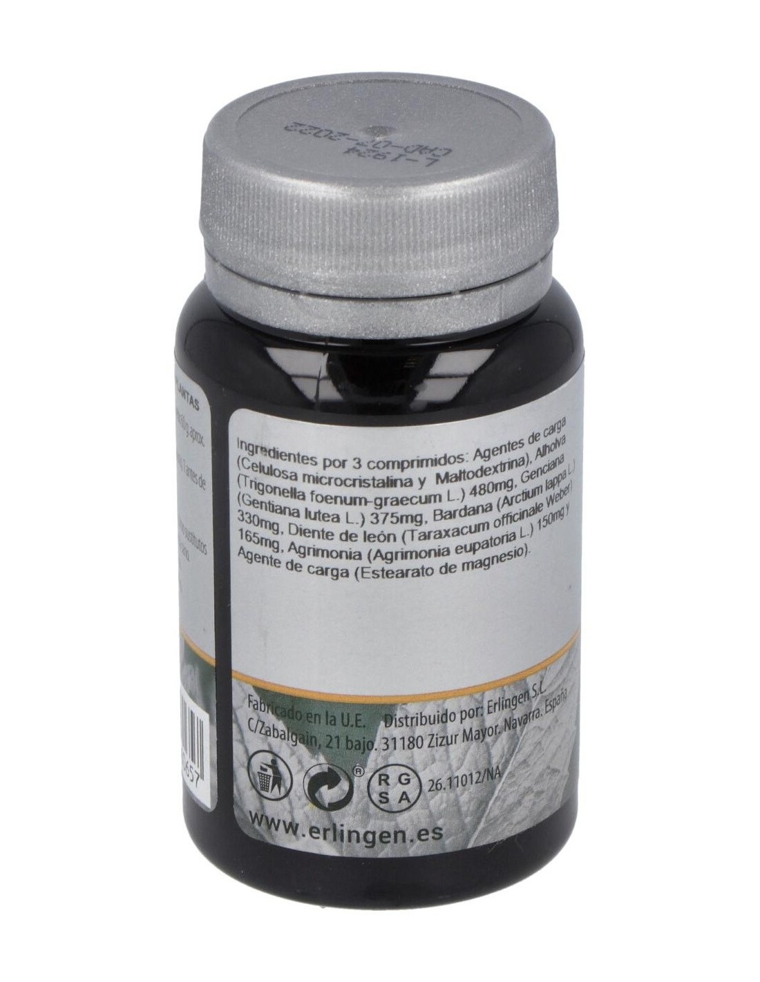Agentes de carga (Celulosa microcristalina y Maltodextrina), Alholva (Trigonella foenum-graecum L.) 480 mg, Genciana (Gentiana lutea L.) 375 mg, Bardana (Arctium lappa L.) 330 mg, Diente de león (Taraxacum officinale Weber) 165 mg, Agrimonia (Agrimonia eupatoria L.) 150 mg y Agente de carga (Estearato de magnesio).