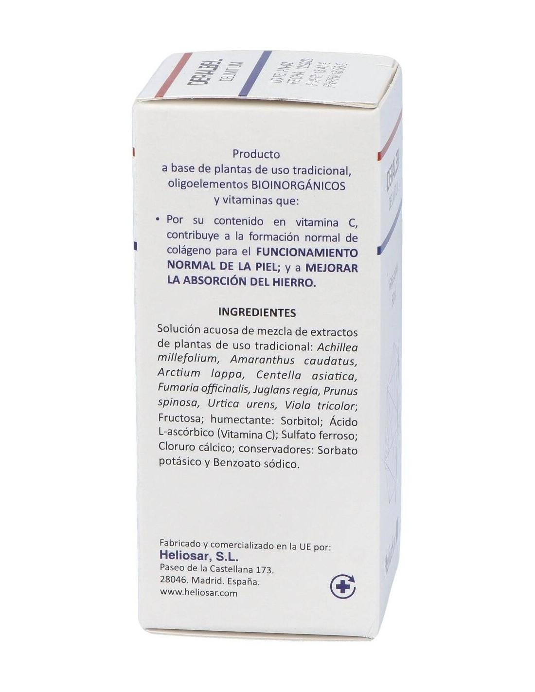 Agua, fructosa, humectante, sorbitol E-420, achillea millefolium, amaranthus caudatus, arctium lappa, centella asiatica, fumaria officinalis, juglans regia, prunus spinosa, urtica urens, viola tricolor, ácido l-ascórbico (vitamina C), sulfato ferroso, cloruro cálcico, conservadores: sorbato potásico (E-202) y benzoato sódico (E-211).