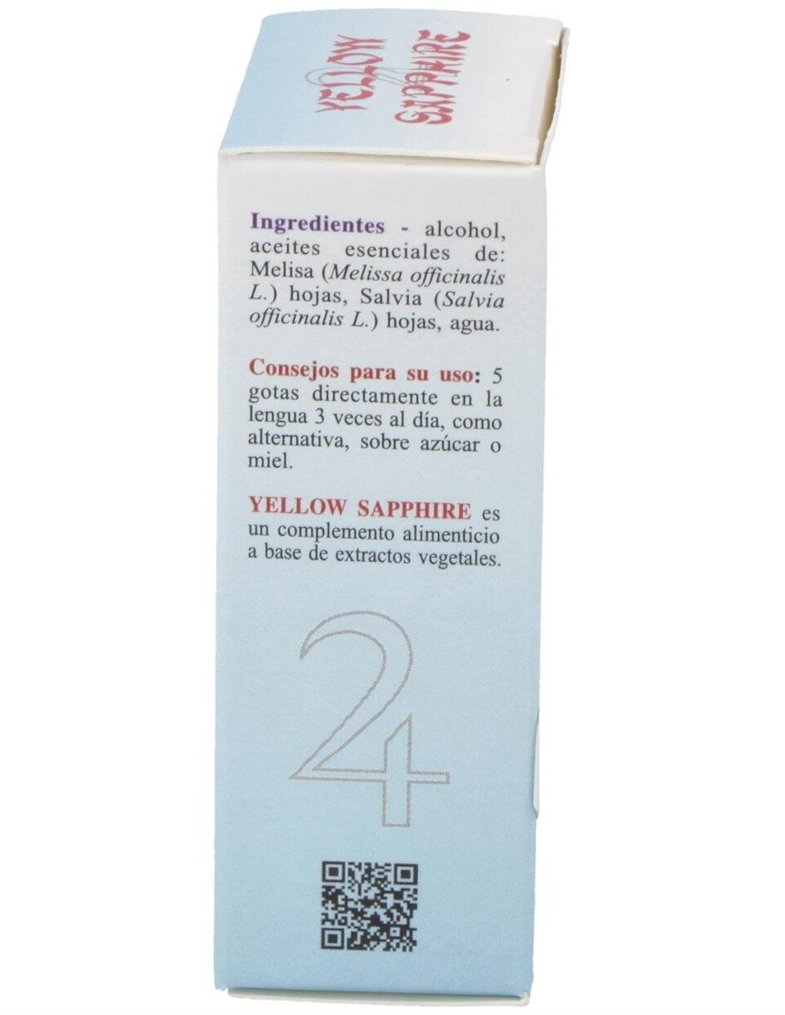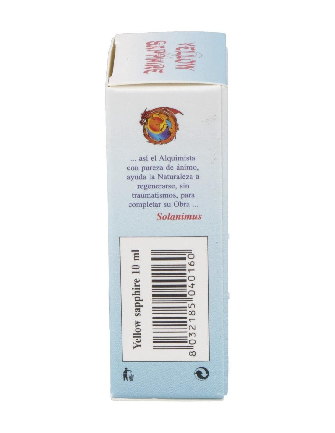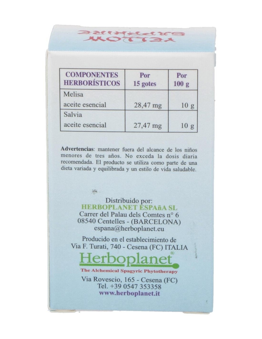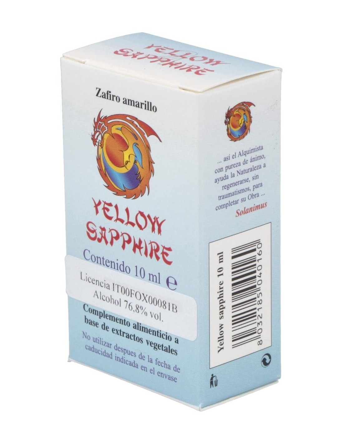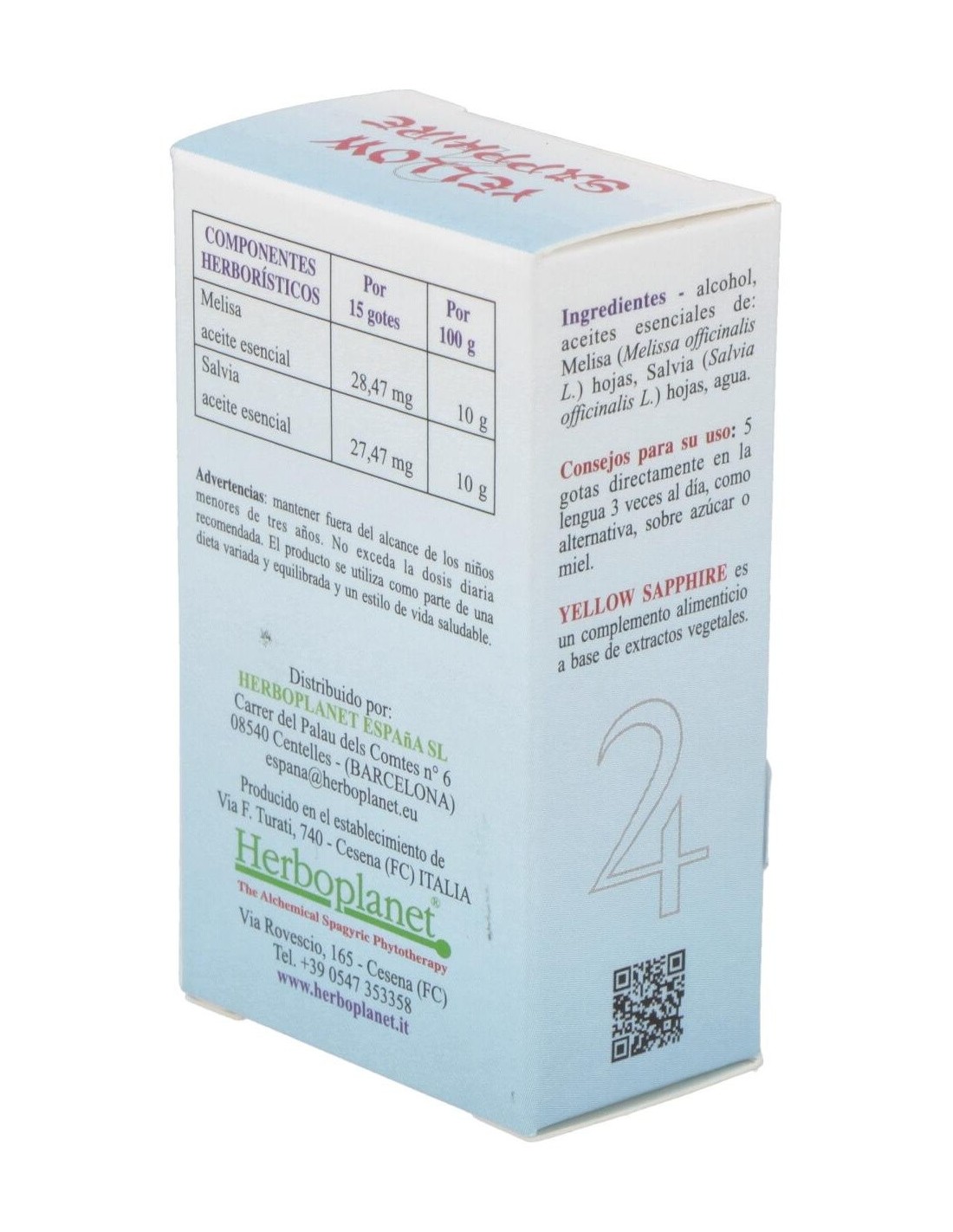 Yellow Sapphire de Herboplanet es un complemento alimenticio a base de extractos vegetales. La Melisa, además de ser un antioxidante, contribuye a la función digestiva y a la eliminación de los gases. Útil para la relajación y el bienestar mental, así como para recuperar el estado de ánimo normal. La Sage contribuye a la función digestiva y a la eliminación de los gases intestinales. Ayuda el proceso regular de sudoración, y contrarresta los trastornos de la menopausia. La Salvia es útil como tónico en la fatiga física y mental.El Zafiro amarillo y su color azul están conectados en el benéfico planeta Júpiter, que gobierna sobre el principio vital de todos los seres humanos y todos los otros animales que respiran. PSIQUE: refuerza en el sujeto la capacidad de realizarse y de llevar una vida satisfactoria, permite intervenir en el proceso de la propia evolución espiritual, cuando esto se muestra muy lento, ayuda a afrontar con sabiduría aquello que el destino nos depara. Ayuda a descubrir la profundidad de la propia riqueza interior. Promueve apertura, franqueza y capacidad de expresar las emociones.Ingredientes por 10 ml:QSA (Quintaesencia Espagírico Alquímica de Solanimus) de Melisa (Melissa officinalis L.) 4,9 ml, QSA (Quintaesencia Espagírico Alquímica de Solanimus) de Salvia (Salvia Officinalis L.) 4,9 ml. Zinc alquímico 0,1 ml. Zafiro amarillo 0,1 ml.Alcohol 80% vol.Modo de empleo:Tomar 5 gotas directamente en la lengua 3 veces al día, como alternativa, sobre azúcar o miel.Presentación:Envase de 10 ml.