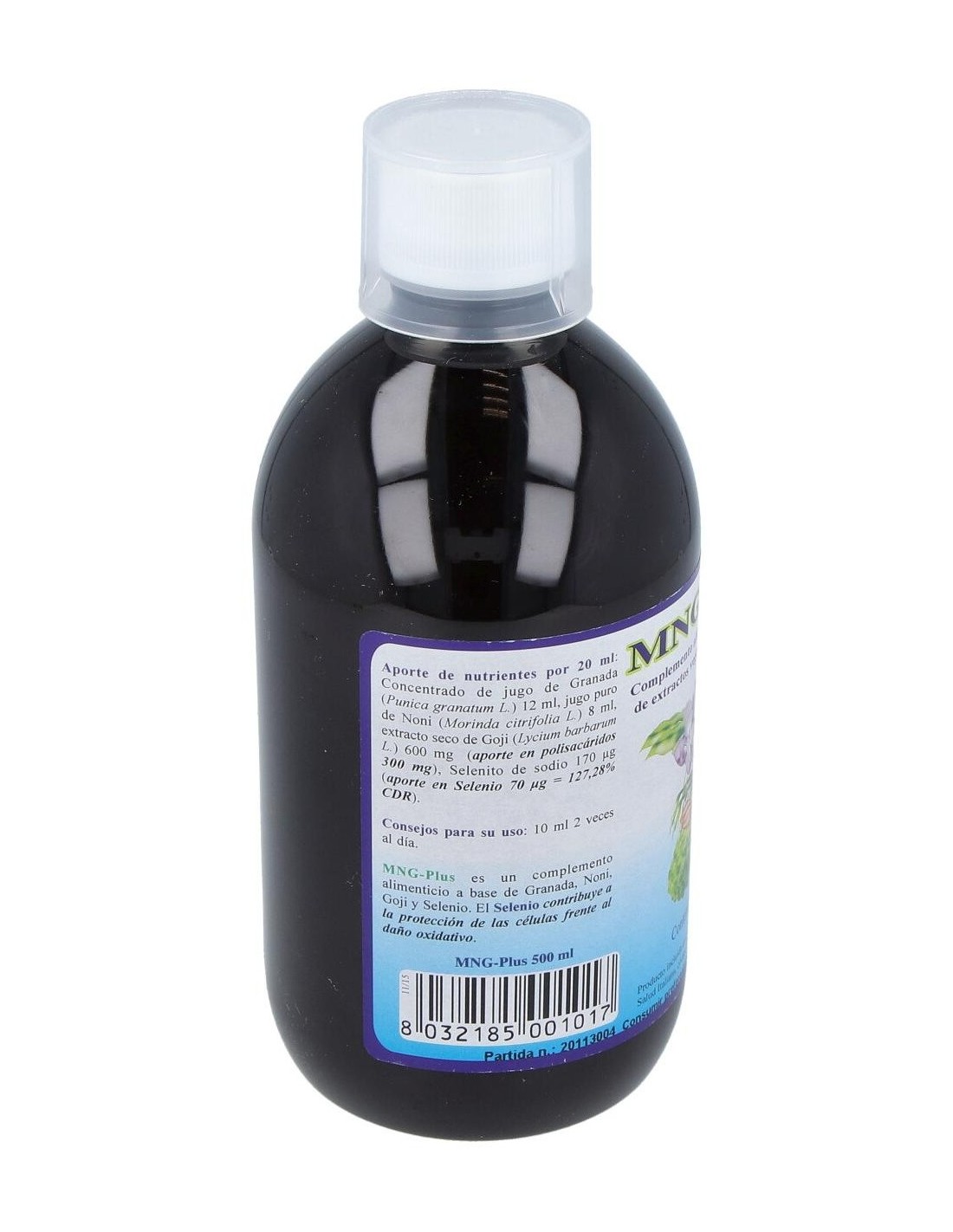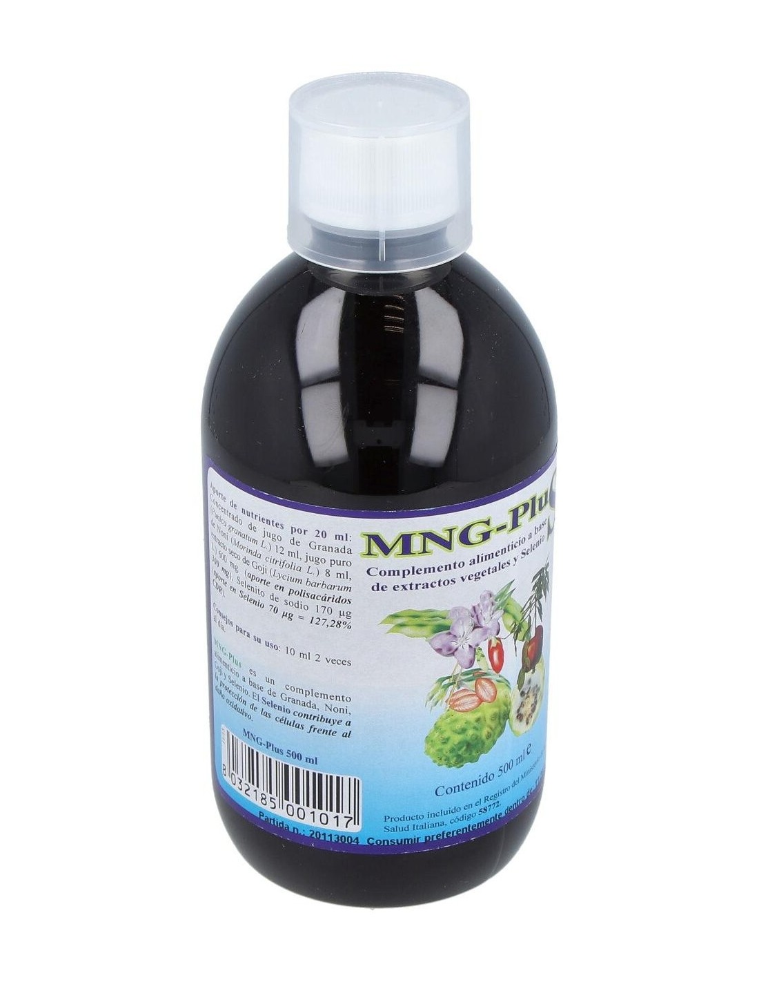 Granada jugo concentrado (Punica granatum) 12 ml, Pure Noni (Morinda citrifolia) 8 ml de extracto seco de Goji (Lycium barbarum) normalizados a 50% de polisacáridos 600 mg (con lo que en polisacáridos 300 mg ), sodio selenita 170 microgramos (Selenio 70 microgramos).