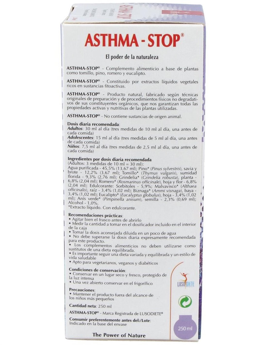 Asthma-Stop 250Ml. Lusodiete de Lusodiete es un complemento diseñado para personas que buscan apoyo en el bienestar respiratorio dentro de un enfoque natural. Está pensado para quienes desean incorporar ingredientes específicos en su rutina diaria con el fin de mantener un estilo de vida equilibrado.