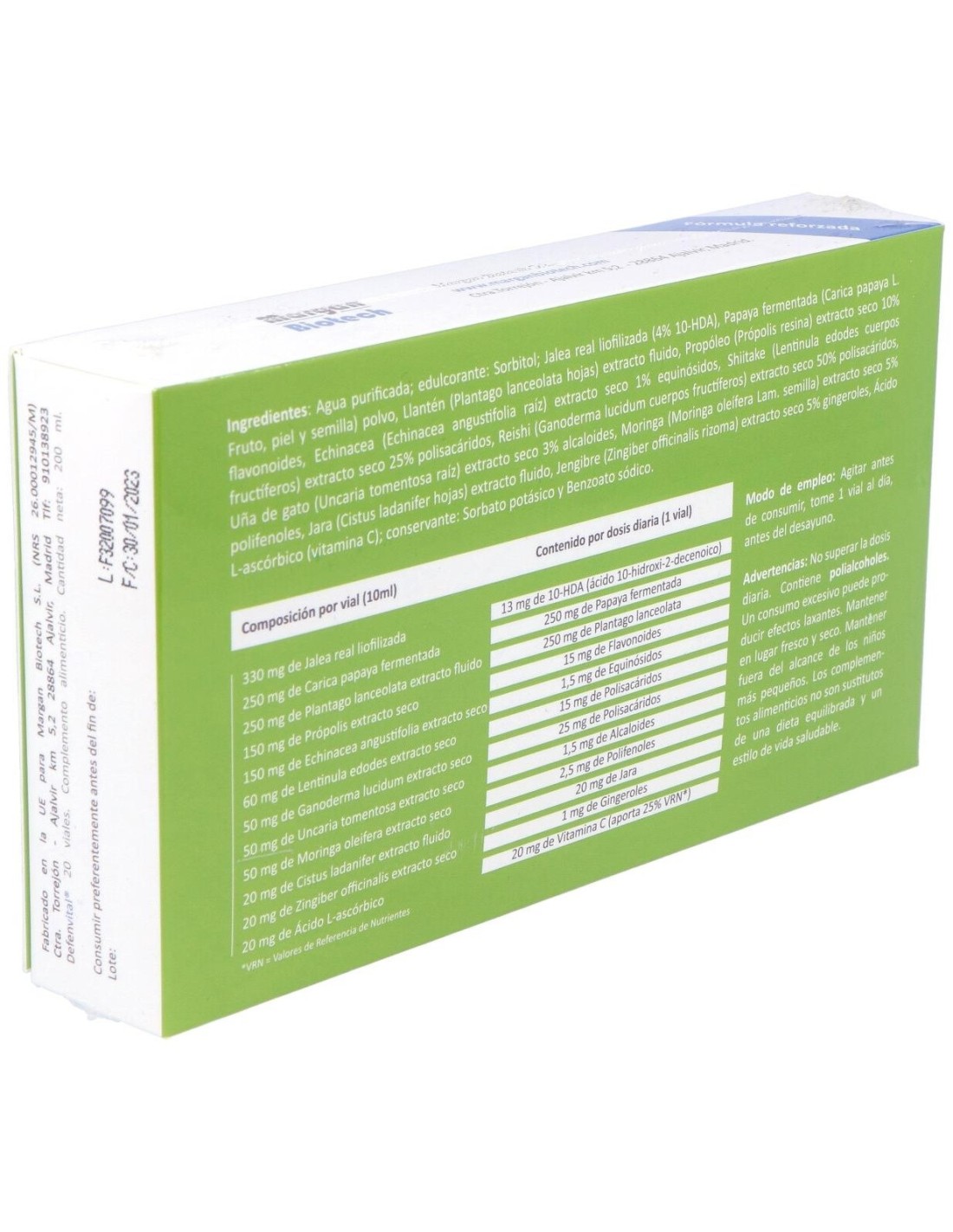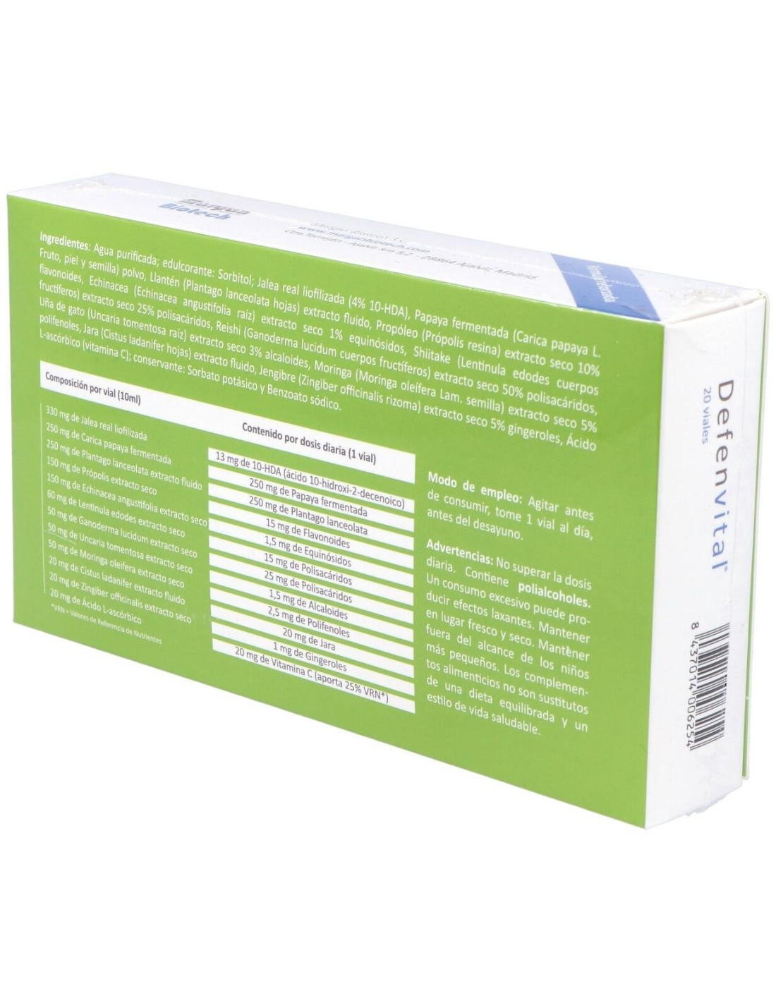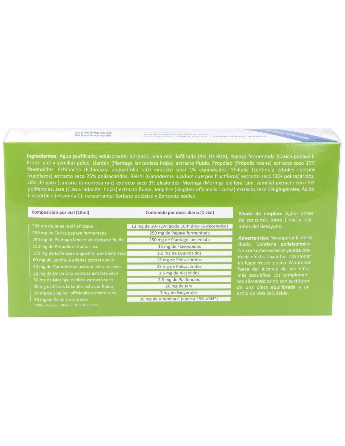 Agua Purificada; Edulcorante: Sorbitol; Jalea Real Liofilizada, Papaya Fermentada Polvo (Carica Papaya L. Fruto, Piel Y Semilla), Propóleo (Própolis Resina), Echinacea (Echinacea Angustifolia Raíz), Shiitake (Lentinula Edodes Cuerpos Fructíferos), Reishi (Ganoderma Lucidum Cuerpos Fructíferos), Uña De Gato (Uncaria Tomentosa Raíz), Moringa (Moringa Oleífera Lam. Semilla), Jara (Cistus Ladanifer Hojas), Jengibre (Zingiber Officinalis Rizoma), Ácido L- Ascórbico (Vitamina C); Conservante: Sorbato Potásico Y Benzoato Sódico.