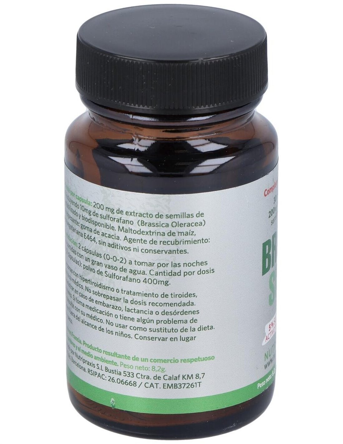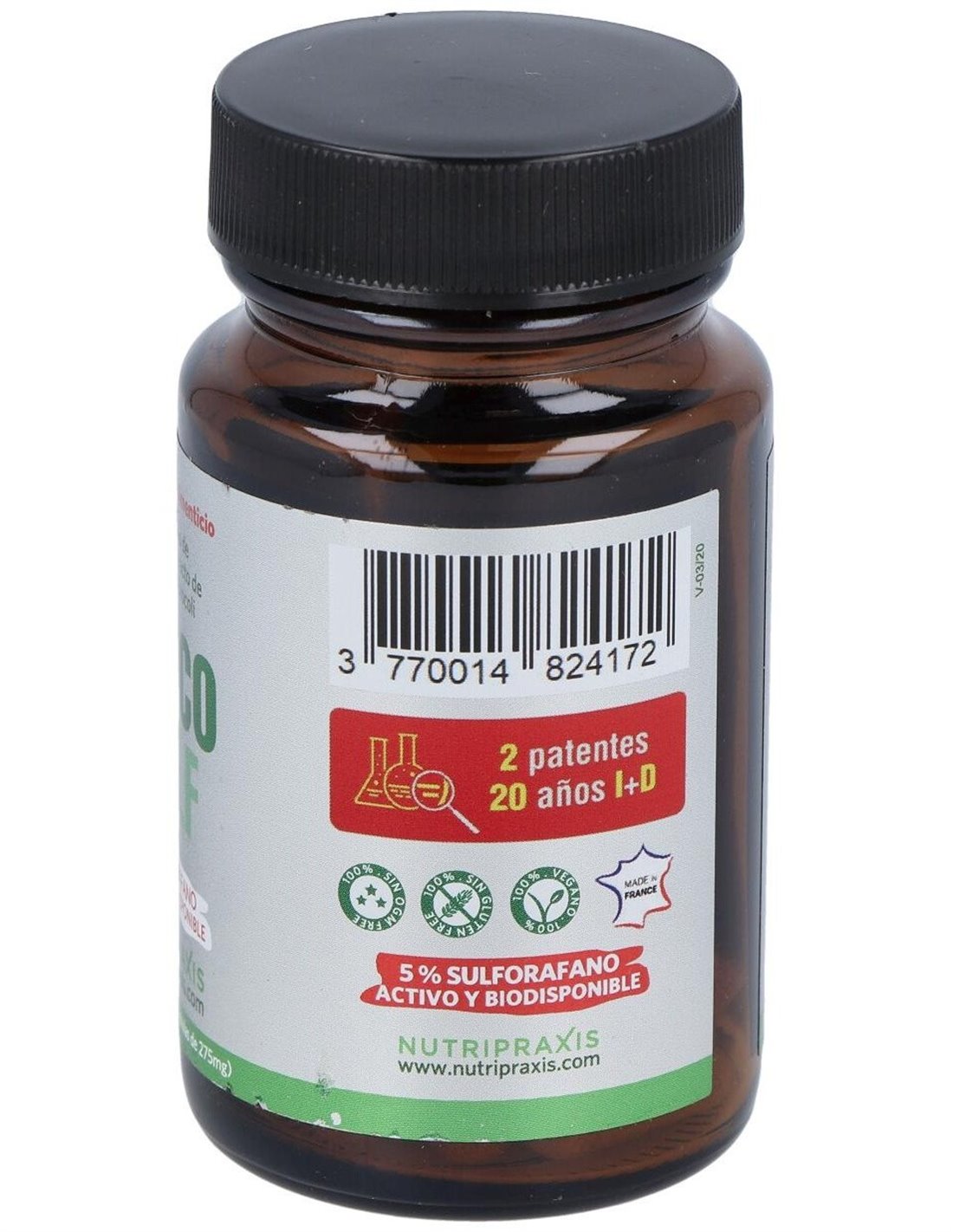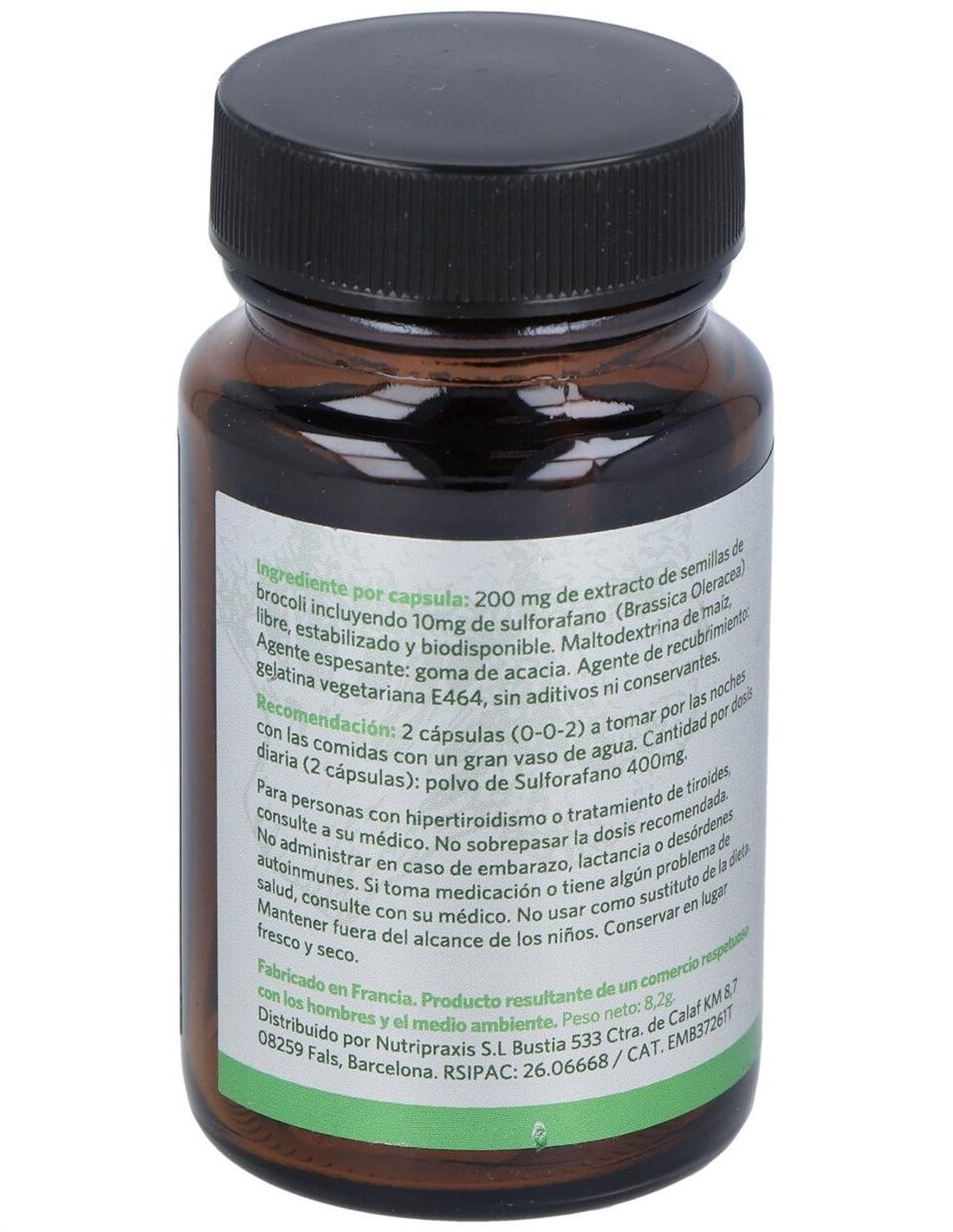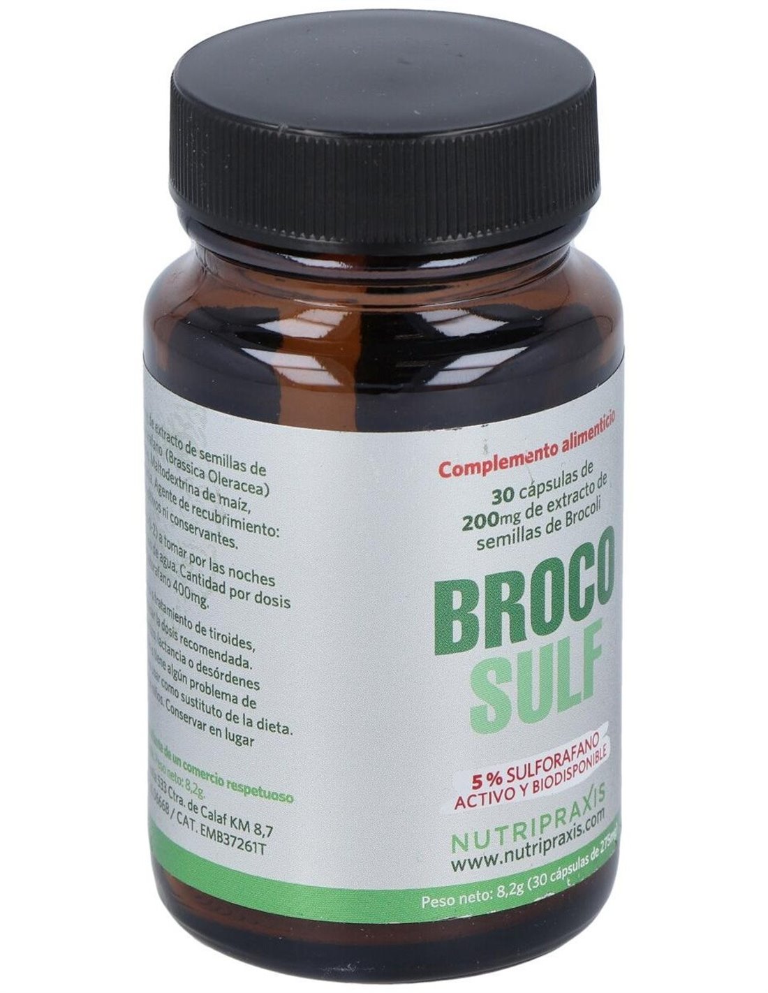 La producción de Brocosulf® cumple con la normativa europea. Las diversas etapas del proceso de producción están sujetas a especificaciones muy precisas. Se realizan verificaciones puntuales durante todo el proceso de producción para garantizar que se mantenga la calidad y la eficacia del producto. Las auditorías de producción también se llevan a cabo regularmente, mientras que la trazabilidad está garantizada desde la etapa de semilla hasta la distribución Brocosulf®Brocosulf® está hecho de semillas de brócoli. Las semillas se cosechan y se eligen por su calidad y contenido de sulforafano. Se garantiza que las semillas estarán libres de transgénicos y se pueden rastrear desde el momento en que se siembran hasta la cosecha.Composición activa por cápsula:200 mg de de extracto de semillas de brócoli (10 mg de sulforafano).Ingredientes:Extracto de semillas de brócoli de los cuales 10 mg son de sulforafano (Brassica Oleracea) libre, estabilizado y biodisponible. Maltodextrina de maíz, Agente espesante: goma de acacia, agente de recubrimiento: gelatina vegetariana E464.Modo de empleo:Tomar 2 cápsulas al día, una por la mañana y otra por la noche antes de comer.Presentación:Envase de 30 cápsulas.Recomendaciones y advertencias:Producto vegano. No contiene gluten ni azúcares añadidos.