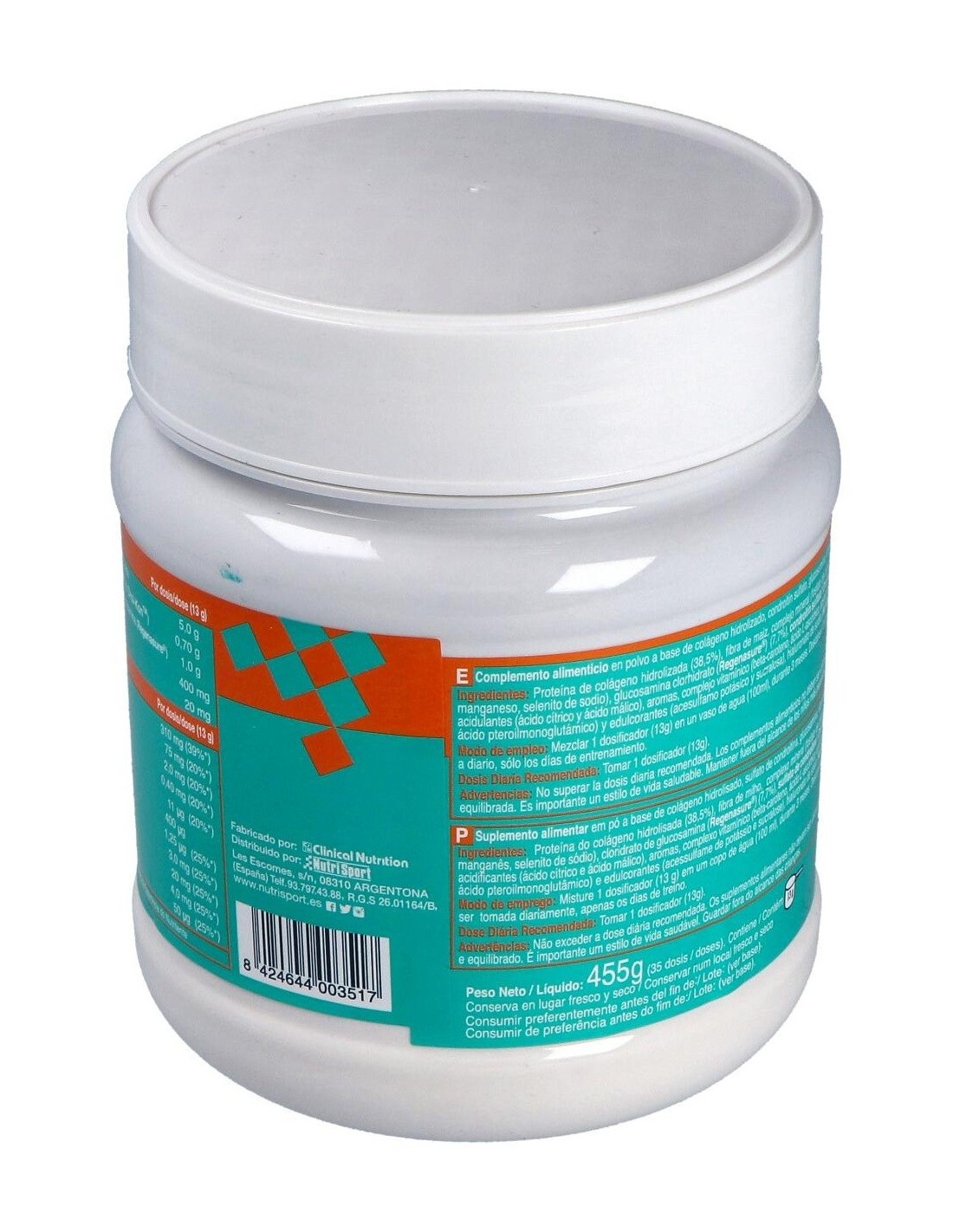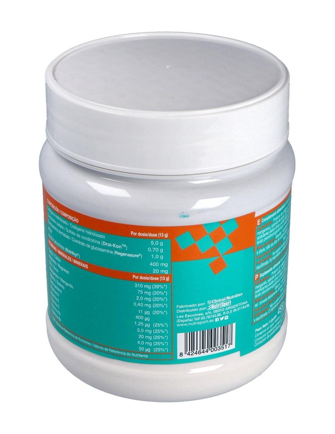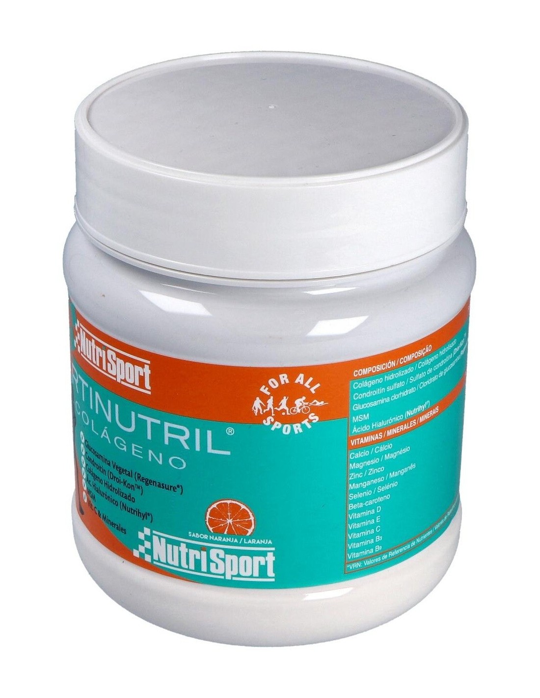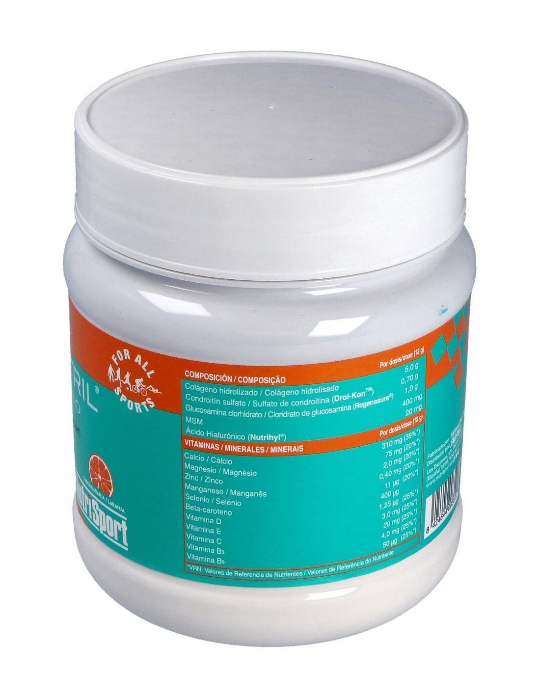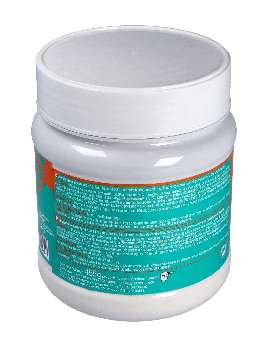 Proteína de colágeno hidrolizada (38,5%), fibra de maíz, complejo mineral (fosfato de cálcio, citrato magnésico, sulfato de zinc, sulfato de manganeso, selenito sódico), glucosamina clorhidrato (Regenasure®) (7,7%), condroitín sulfato (Droi-KonTM)* (5,4%), metil sulfonil metano (MSM) (Nutrihyl®) (3,0%), acidulantes (ácido cítrico, ácido málico), aromas, complejo vitamínico (betacaroteno, ácido L-ascórbico, acetato de DL-alfa-tocoferilo, nicotinamida, colecalciferol, ácido pteroilmonoglutámico), edulcorantes (acesulfamo potásico y sucralosa).