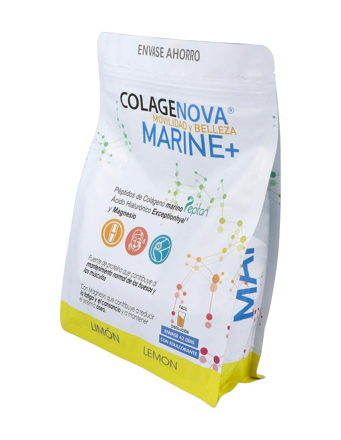 Complemento alimenticio a base de péptidos de colágeno hidrolizado puro procedentes de pescado con ácido hialurónico de origen vegetal y gluconato de Magnesio. Contribuye al mantenimiento del sistema óseo y muscular.