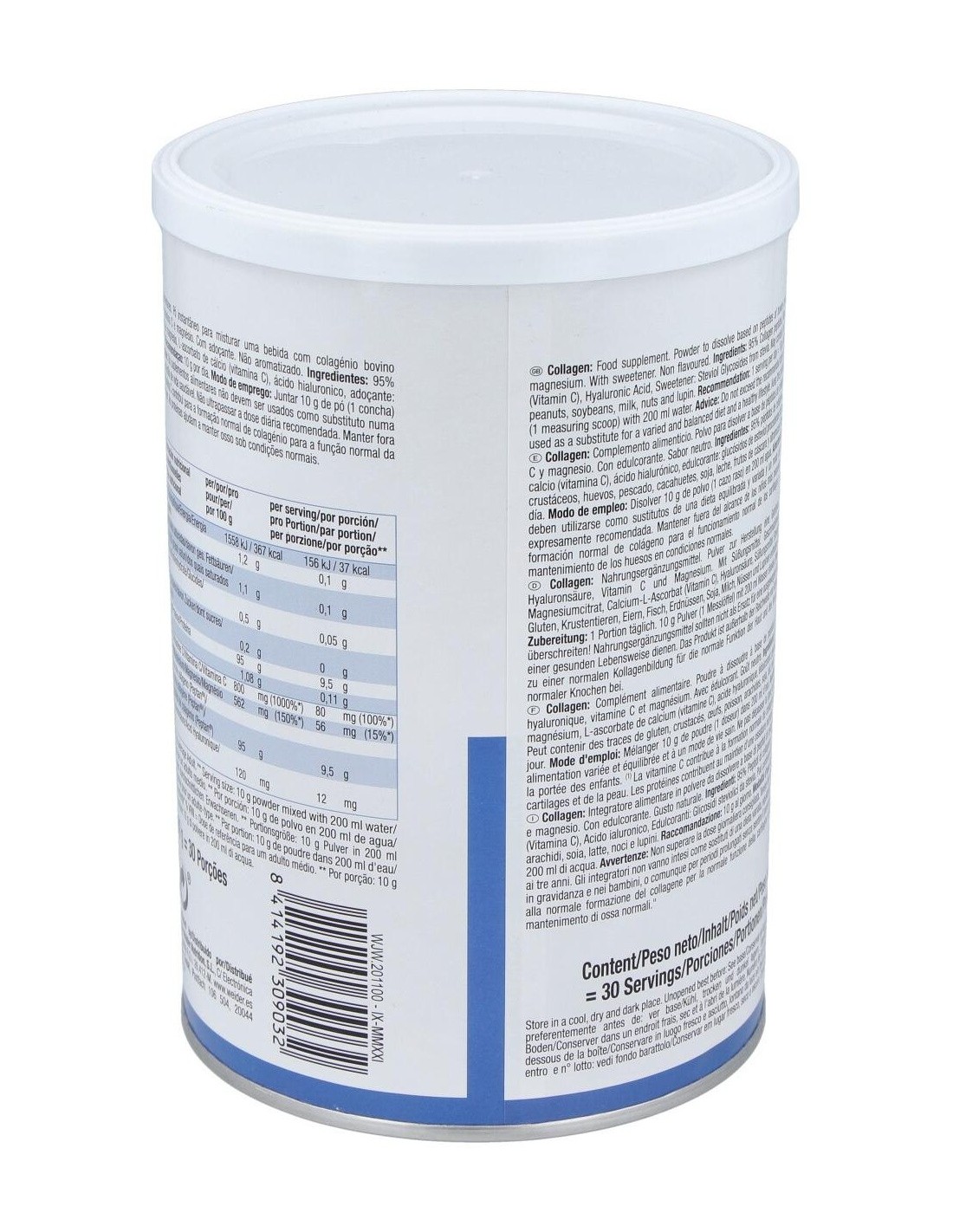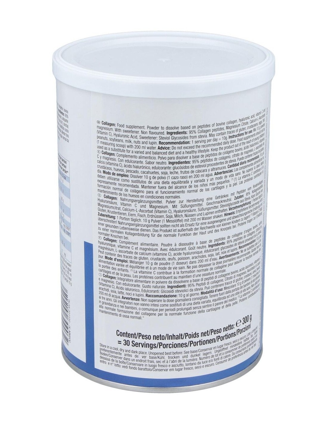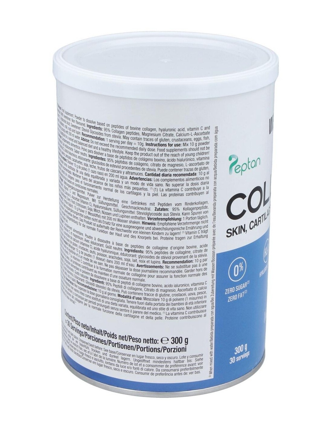 péptidos de colágeno hidrolizado bovino (100% Peptan), citrato de magnesio, ácido L-ascórbico (vitamina C), ácido hialurónico y edulcorante: extracto de Stevia (glucósidos de esteviol). Alérgenos: puede contener trazas de lactosa, soja, gluten y huevo.