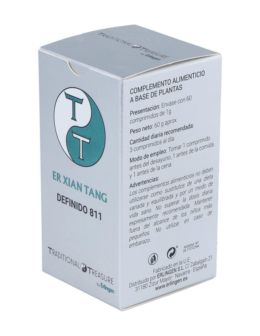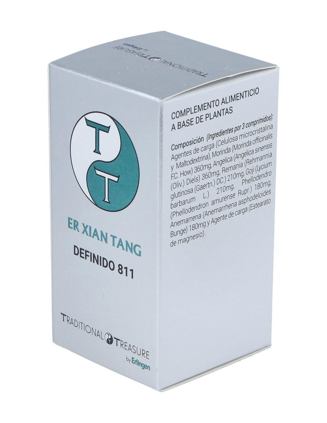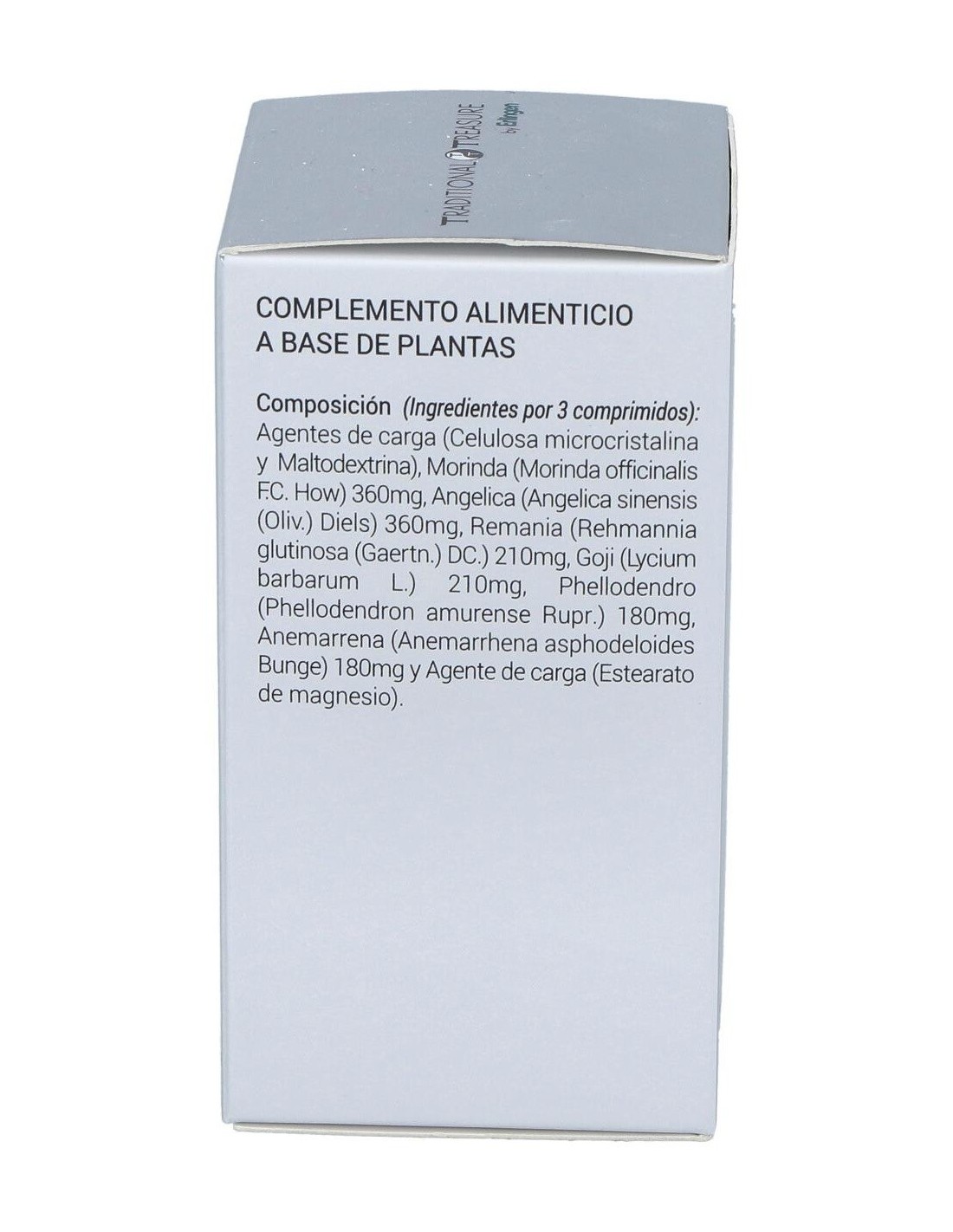Agentes de carga (Celulosa microcristalina y Maltodextrina), Morinda (Morinda officinalis F.C. How) 360mg, Angelica (Angelica sinensis (Oliv.) Diels) 360mg, Remania (Rehmannia glutinosa (Gaertn.) DC.) 210mg, Goji (Lycium barbarum L.) 210mg, Phellodendro (Phellodendron amurense Rupr.) 180mg, Anemarrena (Anemarrhena asphodeloides Bunge) 180mg y Agente de carga (Estearato de magnesio).