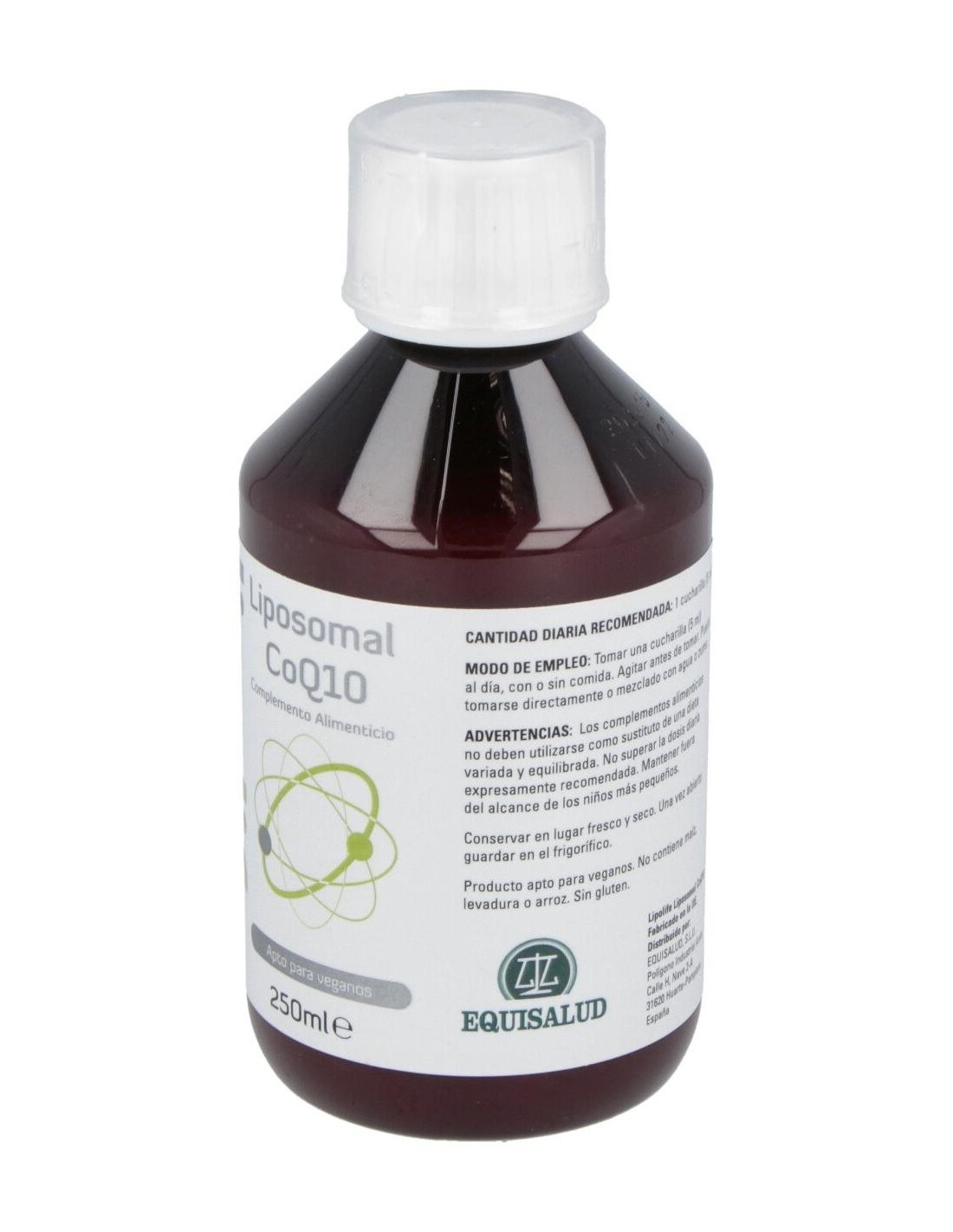 Complemento alimenticio elaborado a base de coenzima Q10 y apto para veganos. Formulado con coenzima q10, glicerol, lecitina de girasol, sorbato potásico, vitamina E. Complemento elaborado por Equisalud para cuidar de forma natural la piel. Gracias los diferentes ingredientes naturales, Liposomal CoQ10 te contribuye a conseguir una piel sana y radiante. Puede tomarse directamente o mezclado con agua o zumo.
