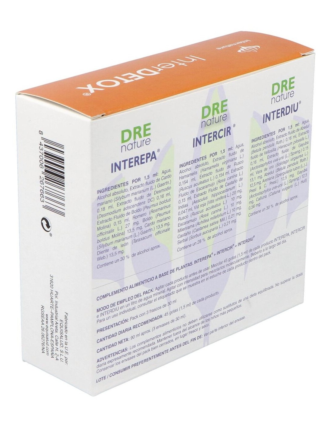 Interpa® : 10 % Extracto hidroalcohólico Romero (Rosmarinus officinalis L.) 5 % Extracto hidroalcohólico Diente de león (Taraxacum officinale L.) 5 % Extracto hidroalcohólico Cardo mariano (Silybum marianum G.) 5 % Extracto hidroalcohólico Boldo (Peumus boldus M.) Agua. Alcohol (15 %) Iintercir®: 10 % Extracto hidroalcohólico Vid roja (Vitis vinifera L.) 5 % Extracto hidroalcohólico Escaramujo (Rosa canina L.) 5 % Extracto hidroalcohólico Brusco (Ruscus aculeatus L.) 5 % Extracto hidroalcohólico Milenrama (Achillea millefolium L.) Agua. Alcohol (15 %) Interdiu®: 5 % Extracto hidroalcohólico Abedul (Betula pendula R.) 5 % Extracto hidroalcohólico Vara de oro (Solidago vigaurea L.) 5 % Extracto hidroalcohólico Gayuba (Arctostaphylos uva-ursi L.) 5 % Extracto hidroalcohólico Arenaria (Herniaria glabra L.) Agua.