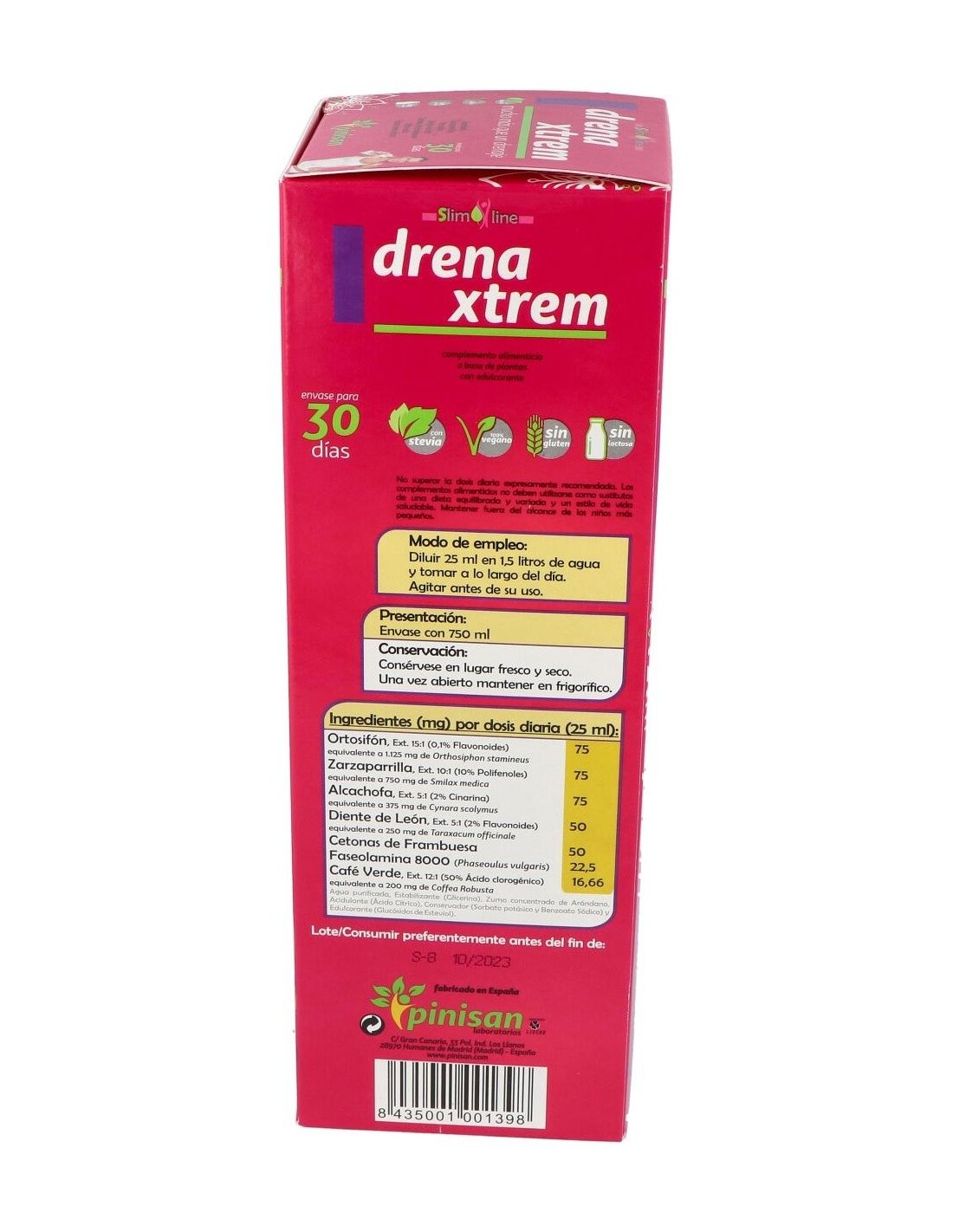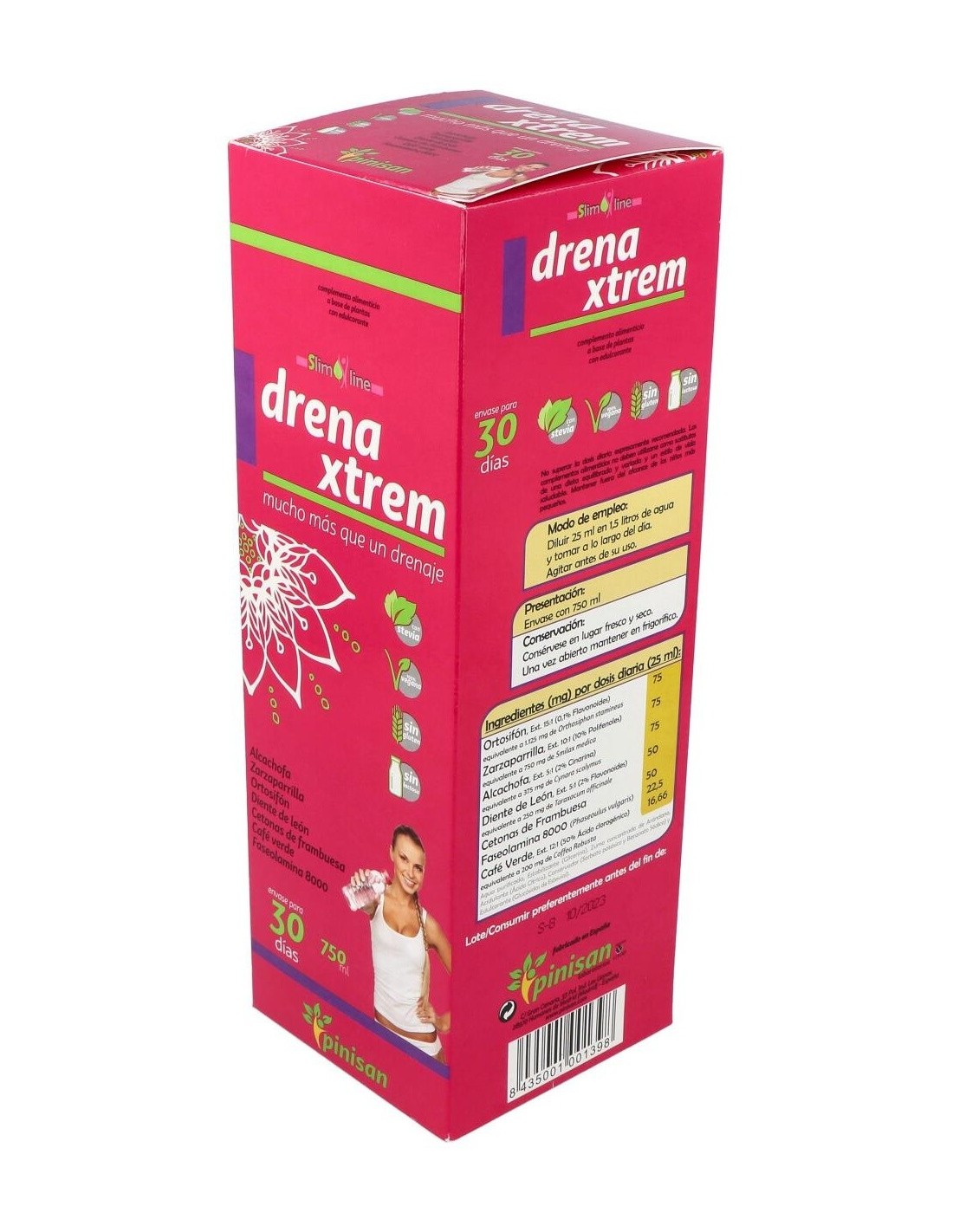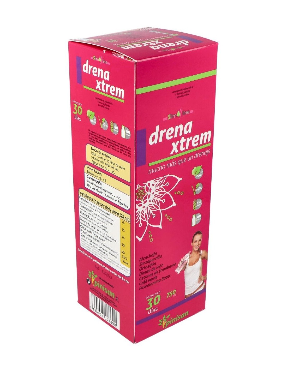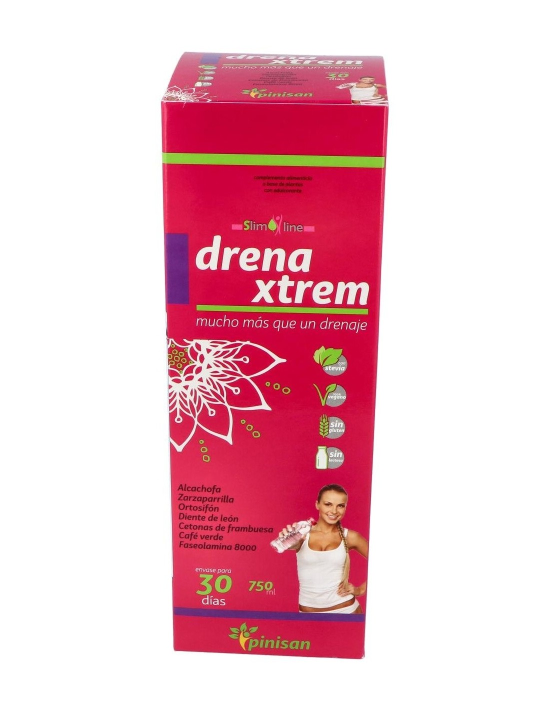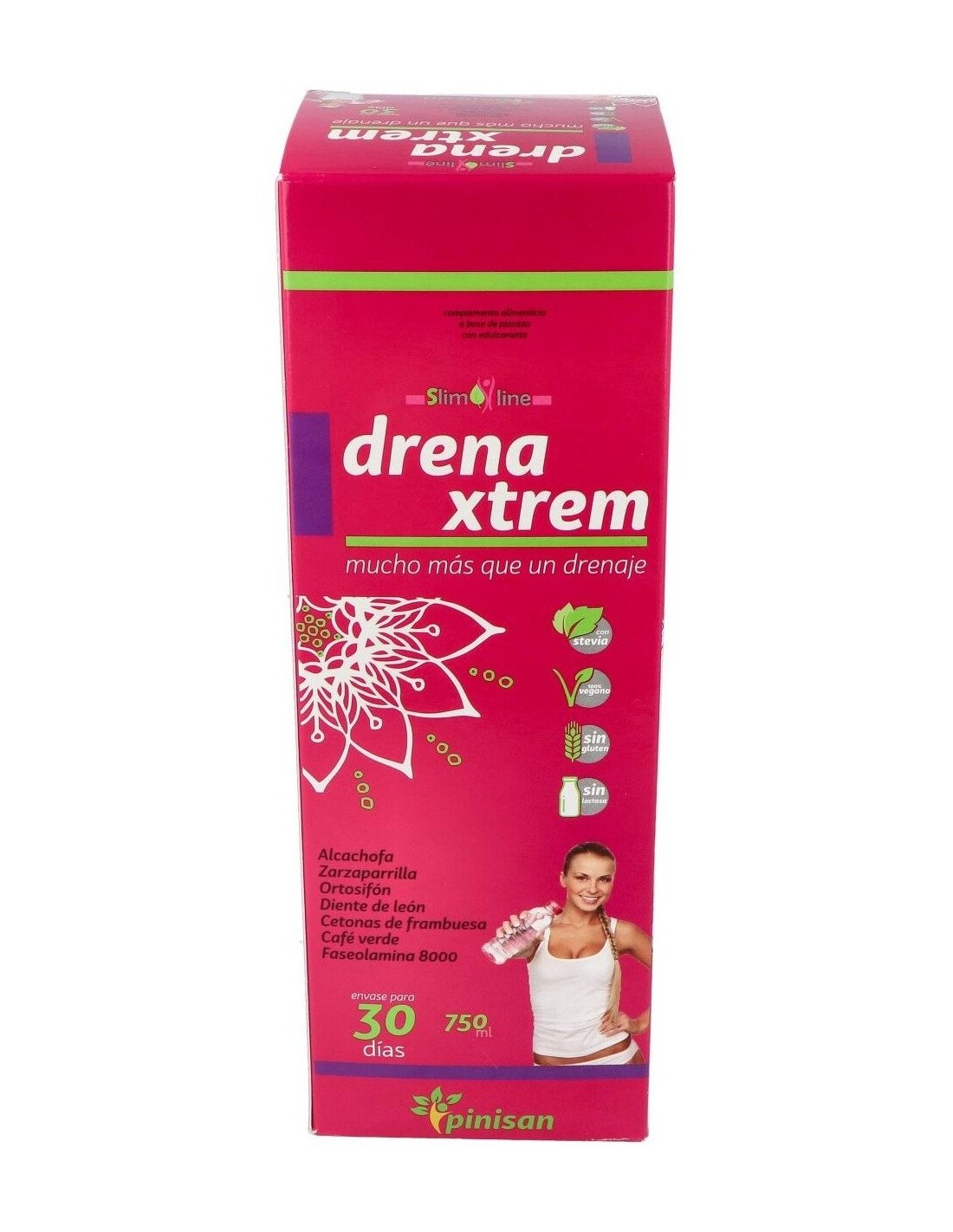 Sus siete activos vegetales: ortosifón, zarzaparrilla, alcachofa, diente de león, café verde (todos ellos en forma de extracto tilulado, para garantizarte la constante presencia de sus principios acticos), cetonas de frambuesa y faseolamina 8.000, componen una formulación mucho más allá de un simple drenaje, tanto por la sinergia de sus ingredientes como por la concentración de los mismos. Su moderno y cómodo envase de 750 ml, que incluye un practico vasito dosificador, contiene el producto suficiente para que disfrutes de sus beneficios durante 30 días. Para usarlo solo debes diluir 25 ml de DrenaXtrem en 1,5 litros de agua, y tomar la mezcla a lo largo del día. Obtendrás así una refrescante bebida edulcorada con estevia, ideal como coadyuvante en dietas de control de peso.Composición activa por 25 ml: