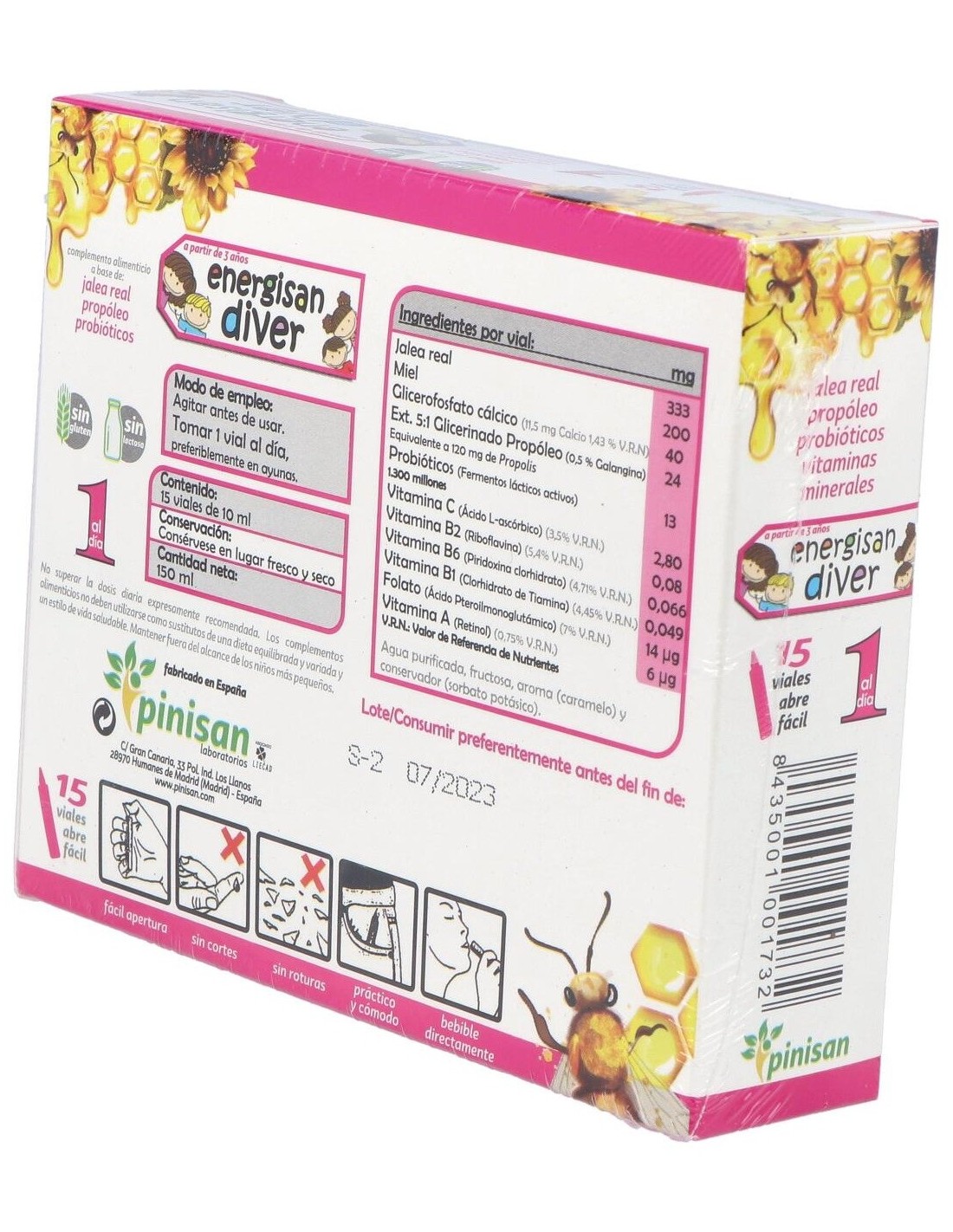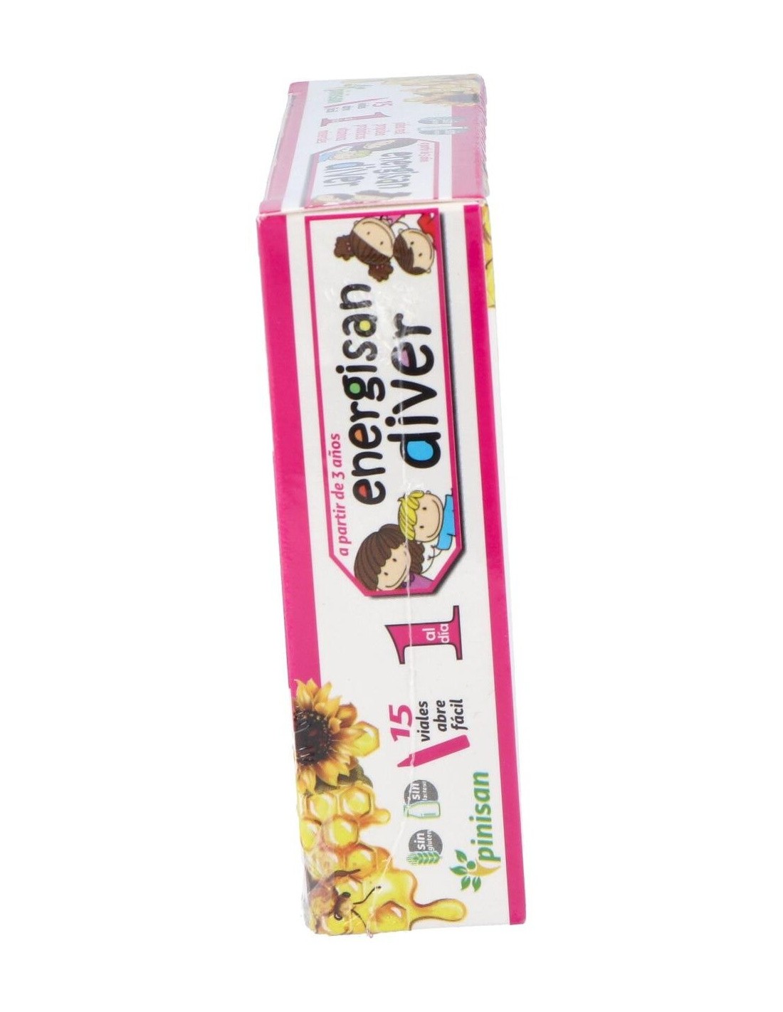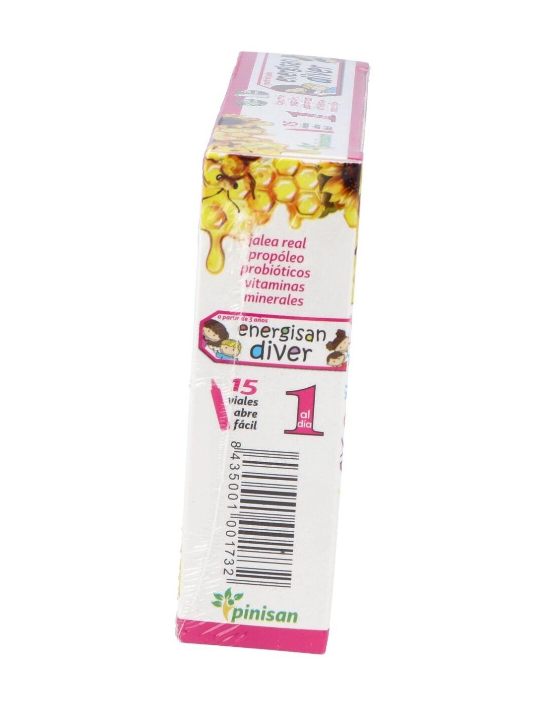 Energisan Diver está elaborada con materias primas seleccionadas que aseguran la calidad y concentración necesaria para disfrutar de los beneficios de este extraordinario regalo de la naturaleza. Además la hemos enriquecido con propóleo, probióticos, minerales y vitaminas, como la vitamina C que ayuda a disminuir el cansancio y la fatiga y contribuye al funcionamiento normal del sistema inmunitario. Presentada en práctico viales abrefácil y con un increible sabor a caramelo. Ingredientes por vial: 333 mg de jalea real. 200 mg de miel. 40 mg de glicerofosfato cálcico. 24 mg de extracto de propóleo (2,5 % Galangina). 13 mg de probióticos (Fermentos lácticos activos) (1.300 millones de bacterias viables). 2,8 mg de vitamina C (Ácido L-ascórbico). 0,08 mg de vitamina B2 (Riboflavina). 0,066 mg de vitamina B6 (Piridoxina clorhidrato). 0,049 mg de vitamina B1 (Clorhidrato de Tiamina). 0,014 mg de folato (Ácido Teroilmonoglutámico). 0,006 mg de vitamina A (Retinol). Modo de empleo:Tomar 1 vial al día, preferiblemente en ayunas. Presentación:Envase de 15 viales.