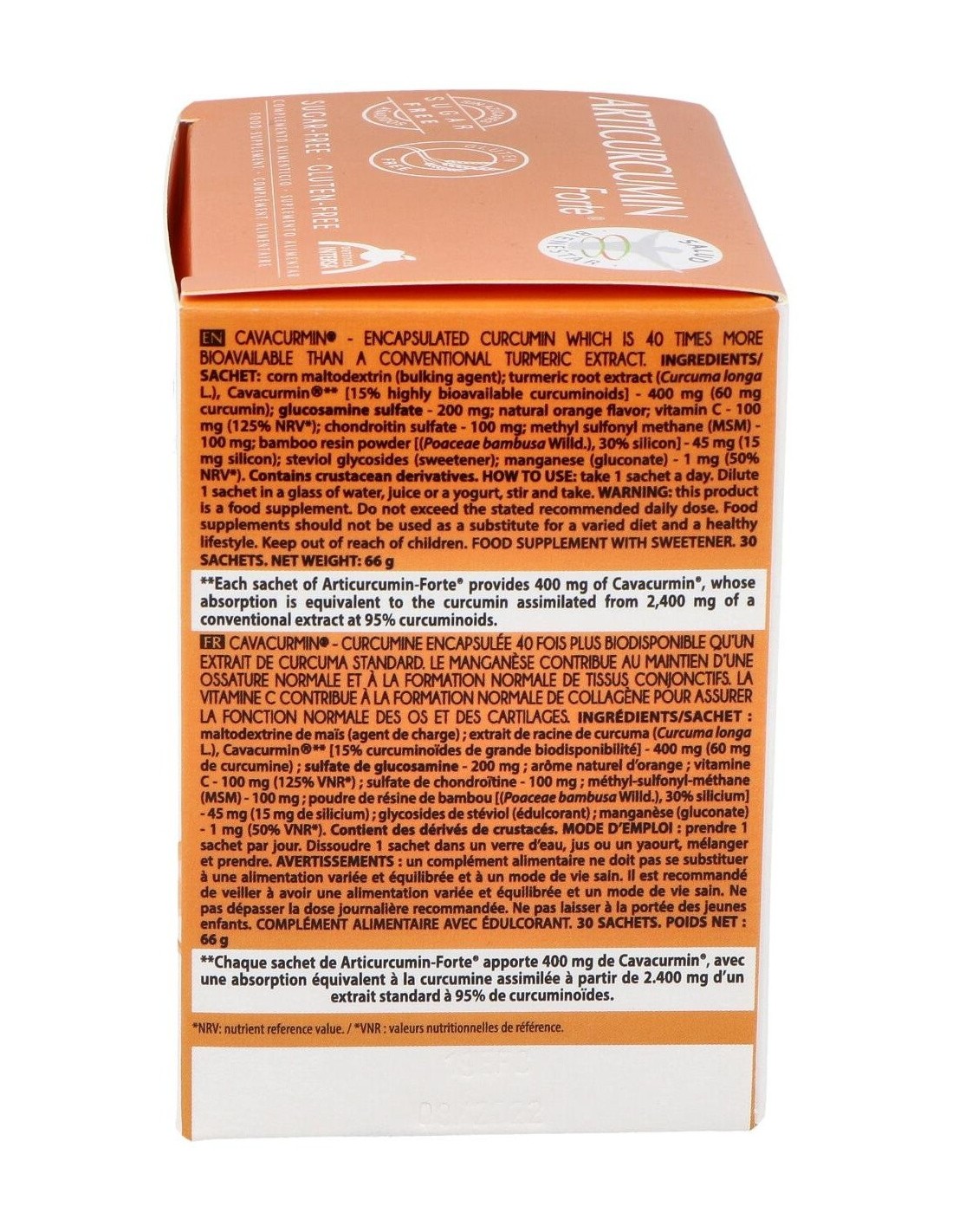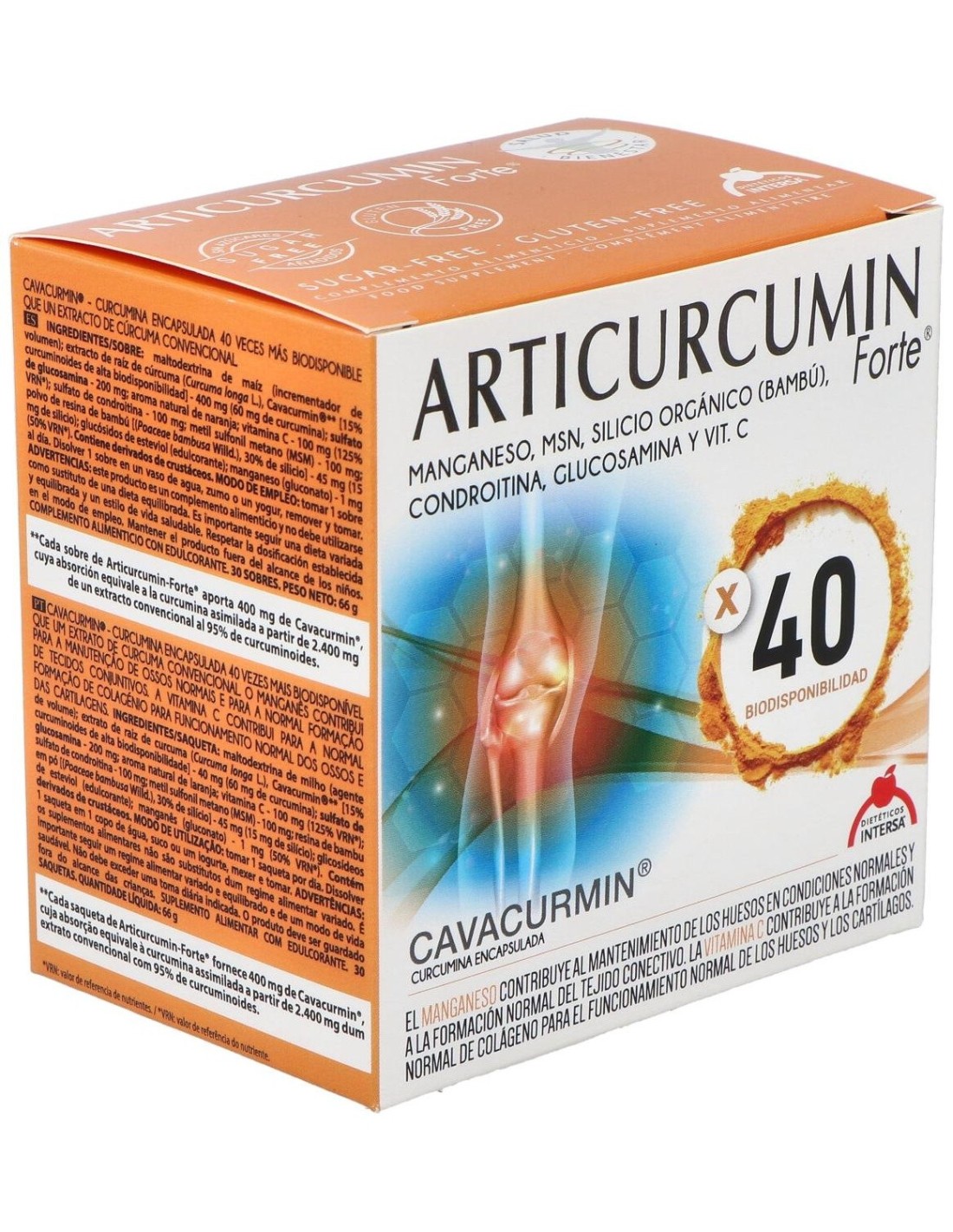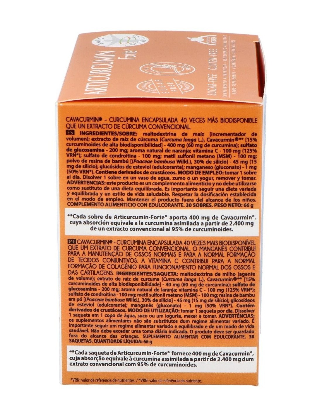 Maltodextrina de mai´z (incrementador de volumen): extracto de rai´z de cu´rcuma (Curcuma longa L.), Cavacurmin® [15% curcuminoides de alta biodisponibilidad] - 400 mg (60 mg de curcumina): sulfato de glucosamina - 200 mg: aroma natural de naranja: vitamina C - 100 mg (125% VRN): sulfato de condroitina - 100 mg: metil sulfonil metano (MSM) - 100 mg: polvo de resina de bambu´ [(Poaceae bambusa Willd.), 30% de silicio] - 45 mg (15 mg de silicio): gluco´sidos de esteviol (edulcorante): manganeso (gluconato) - 1 mg (50% VRN).